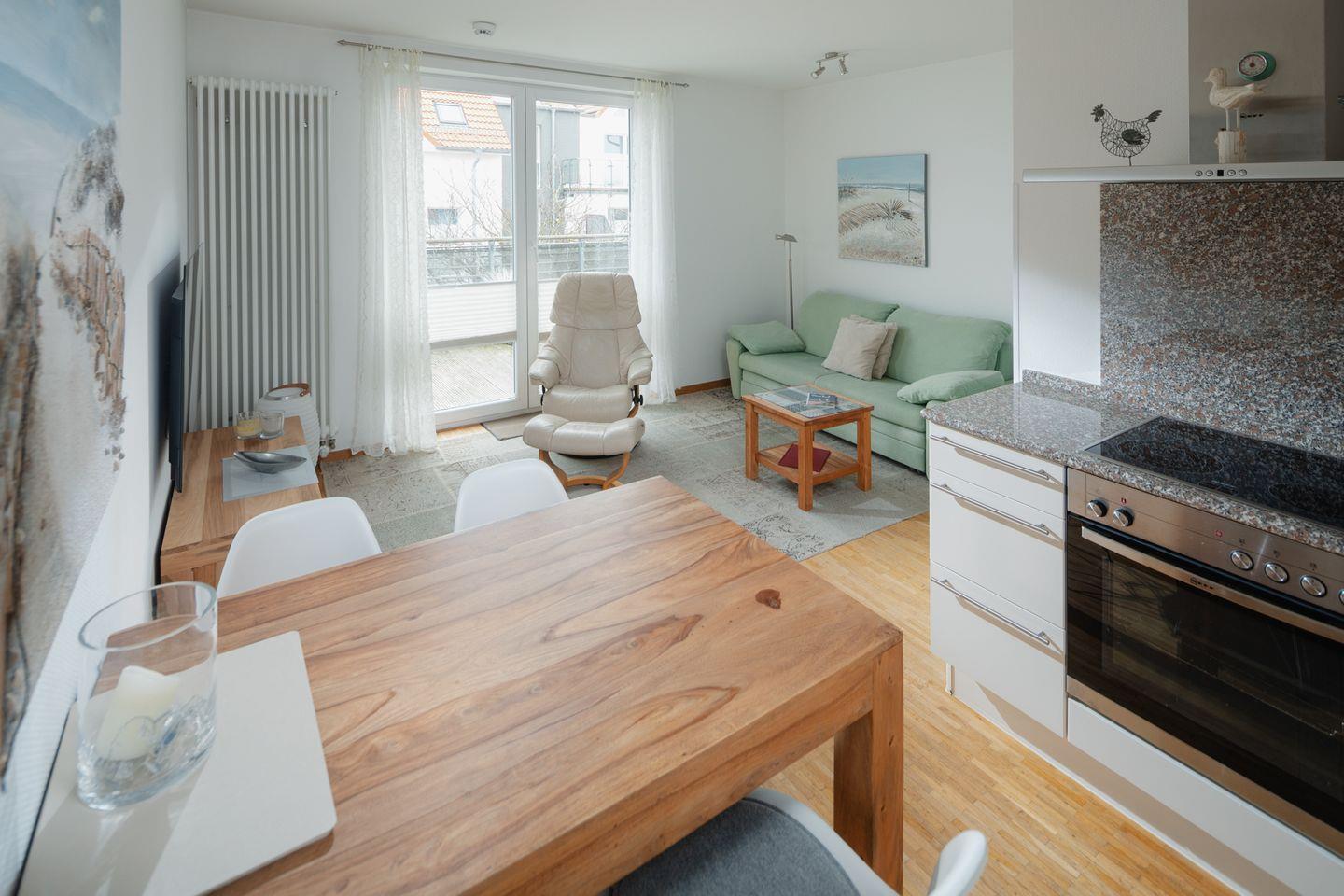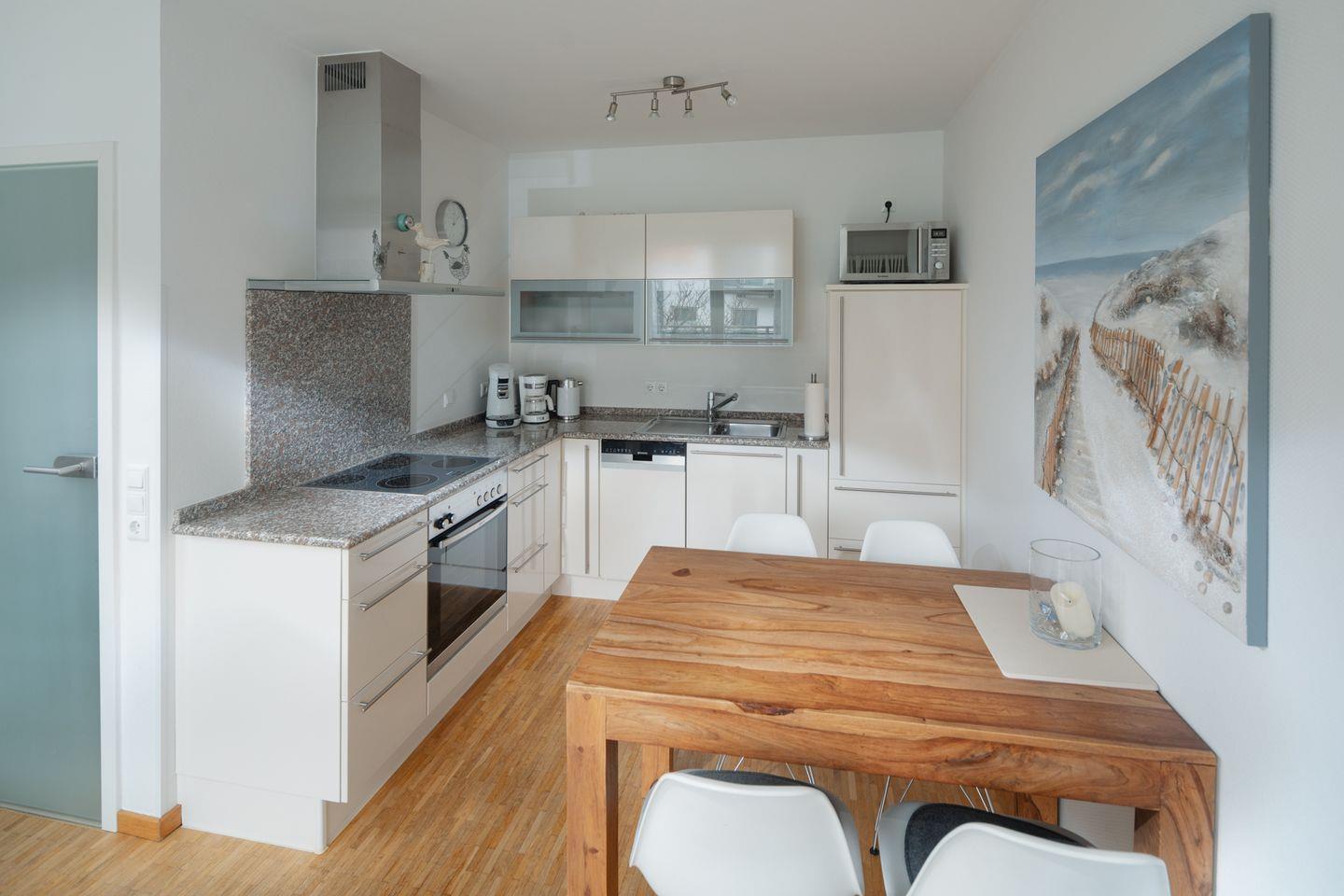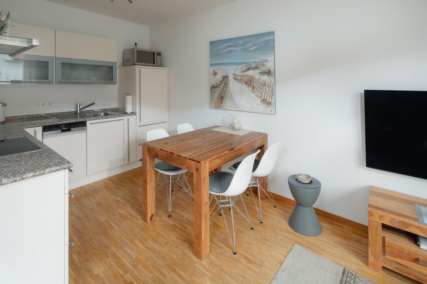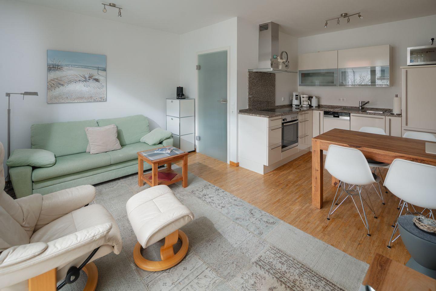 Die moderne Wohnung ist mit einer hochwertigen Ausstattung eingerichtet. Das Schlafzimmer ist mit einem Doppelbett (1,60m x 2,00m) ausgestattet. Der Wohnbereich ist mit einer Sitzecke, einer Essecke und einer voll ausgestatteten Küche eingerichtet. Das Badezimmer ist mit einer Dusche ausgestattet. Das Highlight der Wohnung ist die Dachterrasse inklusive Strandkorb. Waschmaschine und Wäschetrockner befinden sich im Haus und stehen (für die gemeinschaftliche Nutzung gegen Münzeinwurf) zur Verfügung, was besonders für längere Aufenthalte von Vorteil ist. Hunde sind in dieser Wohnung nicht erlaubt.