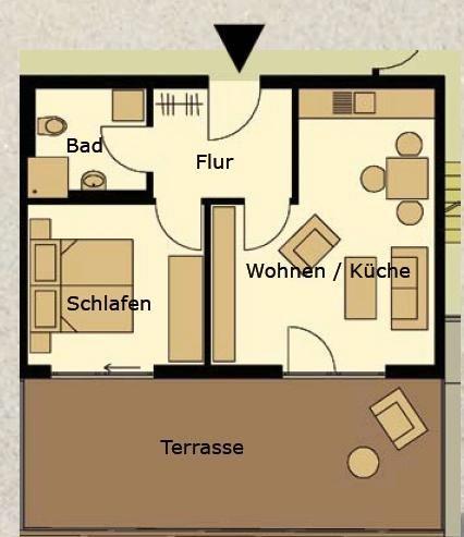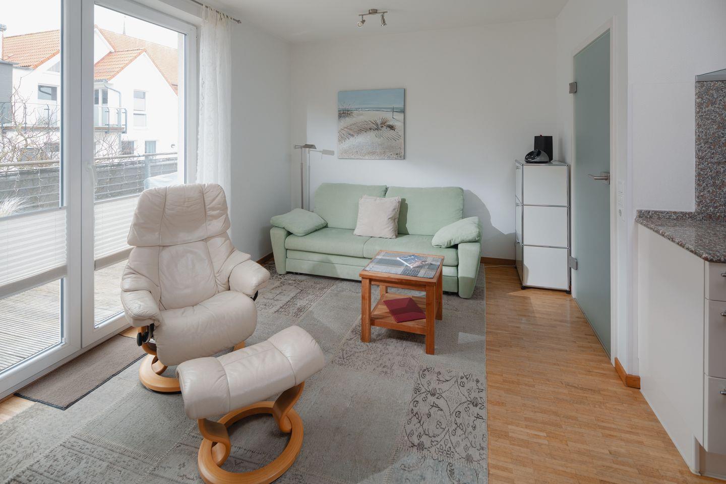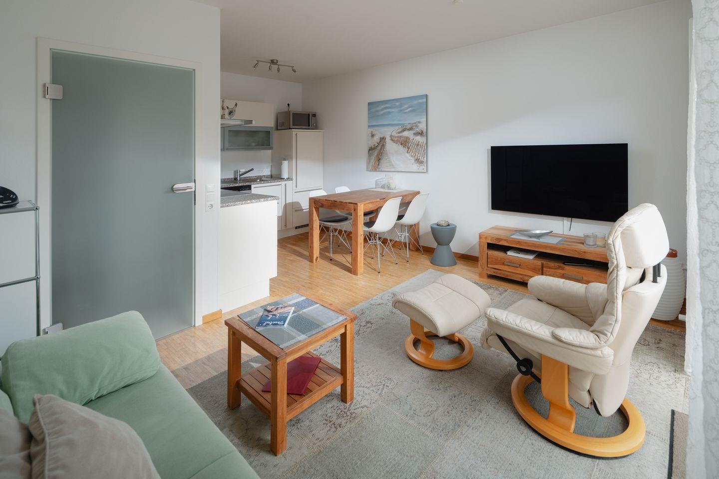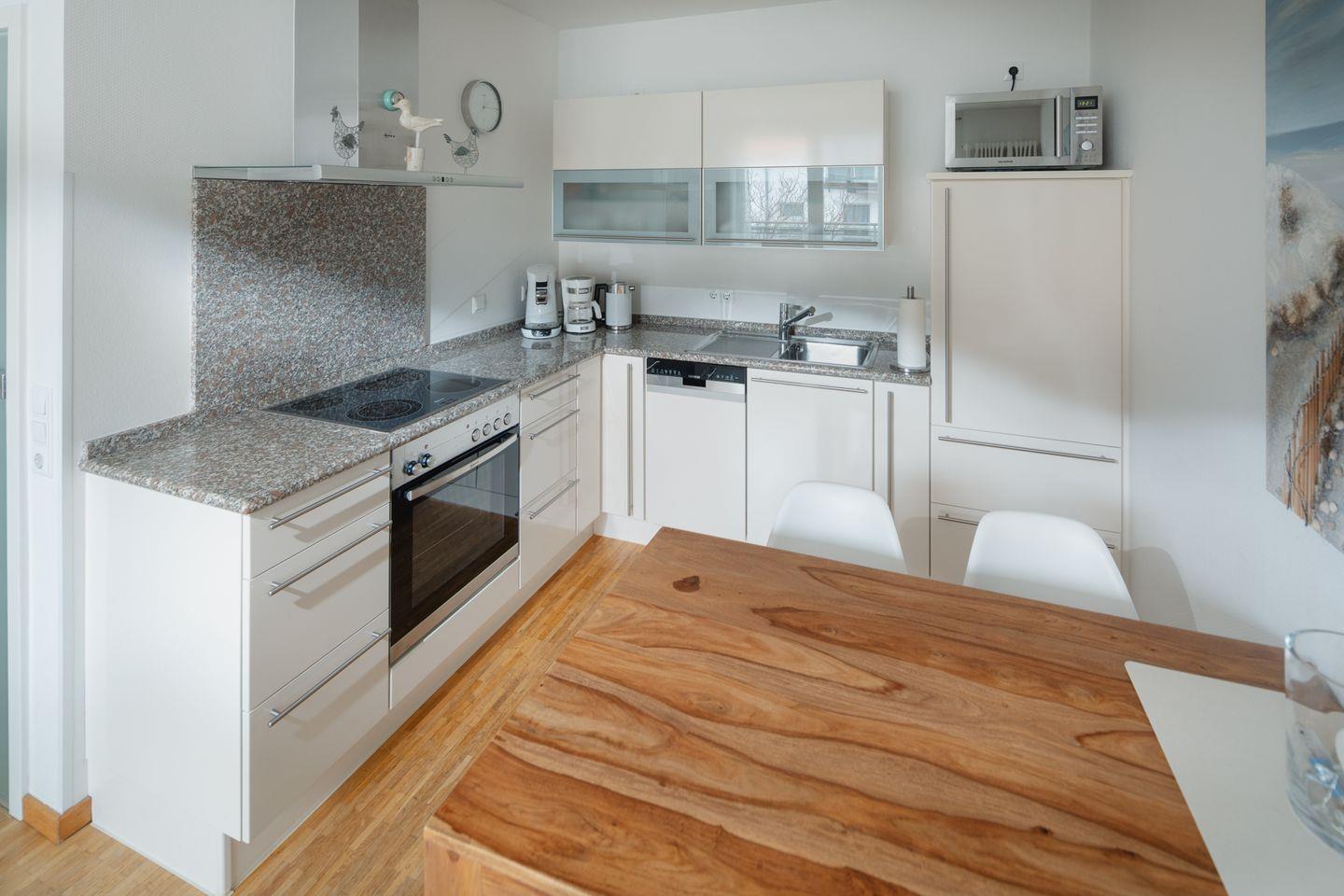 Die moderne Wohnung ist mit einer hochwertigen Ausstattung eingerichtet. Das Schlafzimmer ist mit einem Doppelbett (1,60m x 2,00m) ausgestattet. Der Wohnbereich ist mit einer Sitzecke, einer Essecke und einer voll ausgestatteten Küche eingerichtet. Das Badezimmer ist mit einer Dusche ausgestattet. Das Highlight der Wohnung ist die Dachterrasse inklusive Strandkorb. Waschmaschine und Wäschetrockner befinden sich im Haus und stehen (für die gemeinschaftliche Nutzung gegen Münzeinwurf) zur Verfügung, was besonders für längere Aufenthalte von Vorteil ist. Hunde sind in dieser Wohnung nicht erlaubt.
