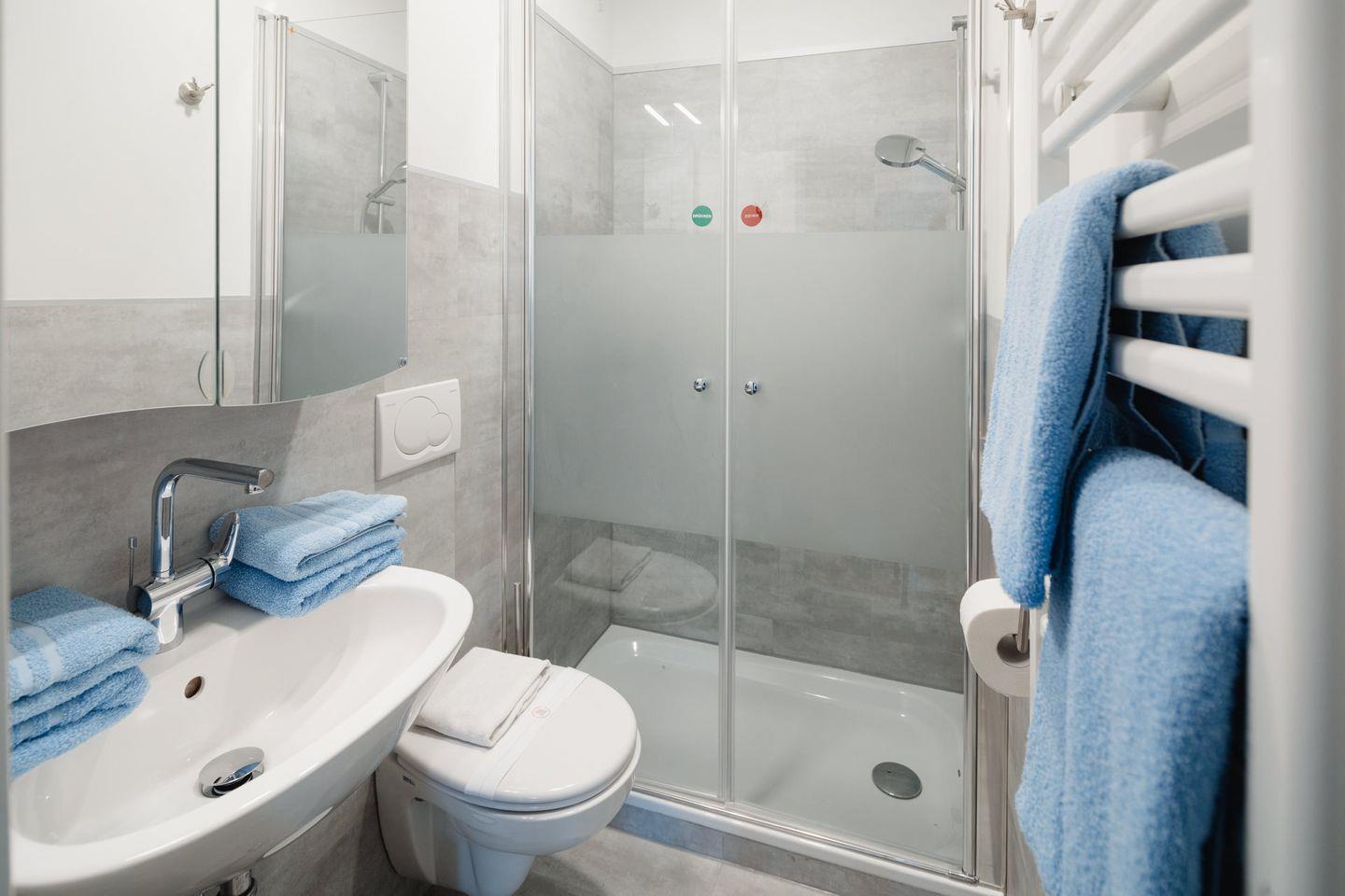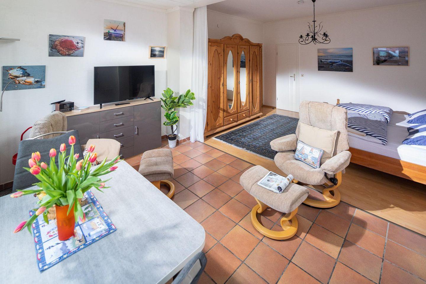 Die Wohnung liegt im Erdgeschoss des kleinen Mehrfamilienhauses, was einen bequemen Zugang ermöglicht. Das 1-Raum-Apartment ist perfekt für Alleinreisende oder bis zu 2 Personen geeignet. Der Wohn- und Schlafbereich wurde optisch durch die verschiedenen Bodenbeläge gekennzeichnet. Weiter lässt sich der Wohnbereich durch einen Vorhang vom Schlafbereich abtrennen.