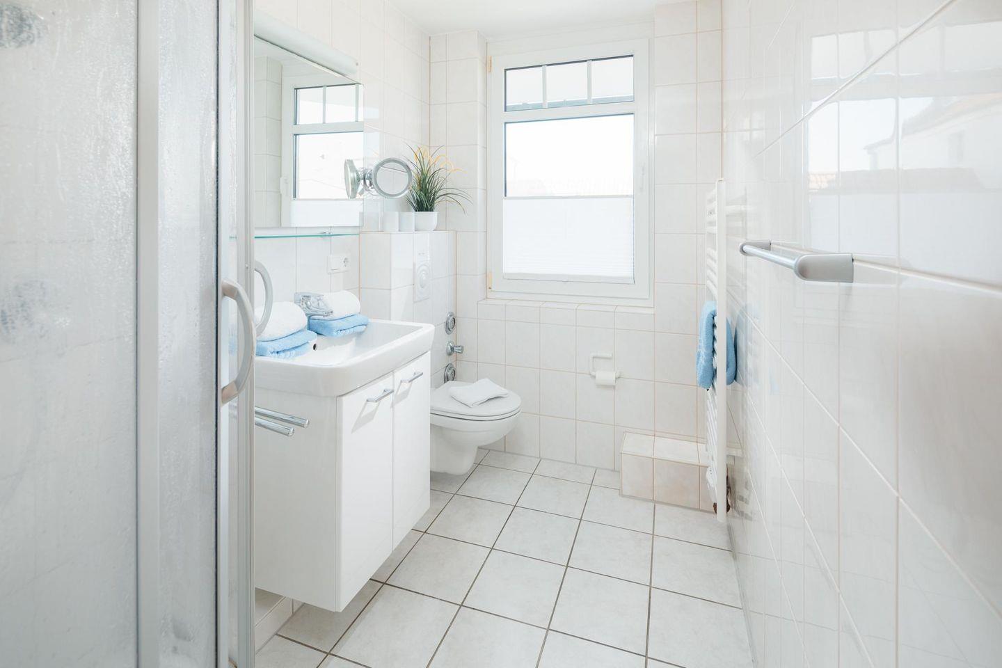 Die Wohnung 16 liegt im ersten Obergeschoss im rückwärtigen Teil des Hauses und ist nach Osten ausgerichtet. Sie ist hell eingerichtet und lichtdurchflutet. Das Schlafzimmer ist mit einem Doppelbett ausgestattet. Das Wohnzimmer verfügt über einen Koch- und Essbereich und einen neuen Smart-TV. Das Badezimmer ist modern gestaltet und verfügt über eine Dusche und ein WC mit Außenfenster. Ein besonderes Highlight der Wohnung "Windrose 16" ist der Balkon mit Balkonmöbeln. Fahrräder können im Ständer am Haus oder im Keller abgestellt werden. Waschmaschine und Wäschetrockner befinden sich im Haus und stehen (für die gemeinschaftliche Nutzung gegen Münzeinwurf) zur Verfügung, was besonders für längere Aufenthalte von Vorteil ist. Haustiere (Hunde) sind in dieser Ferienwohnung nicht erlaubt.
