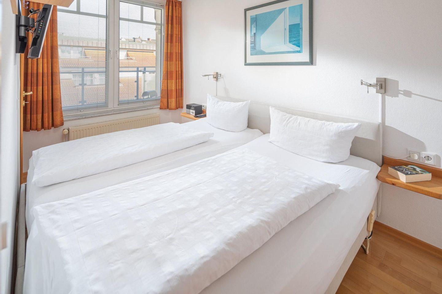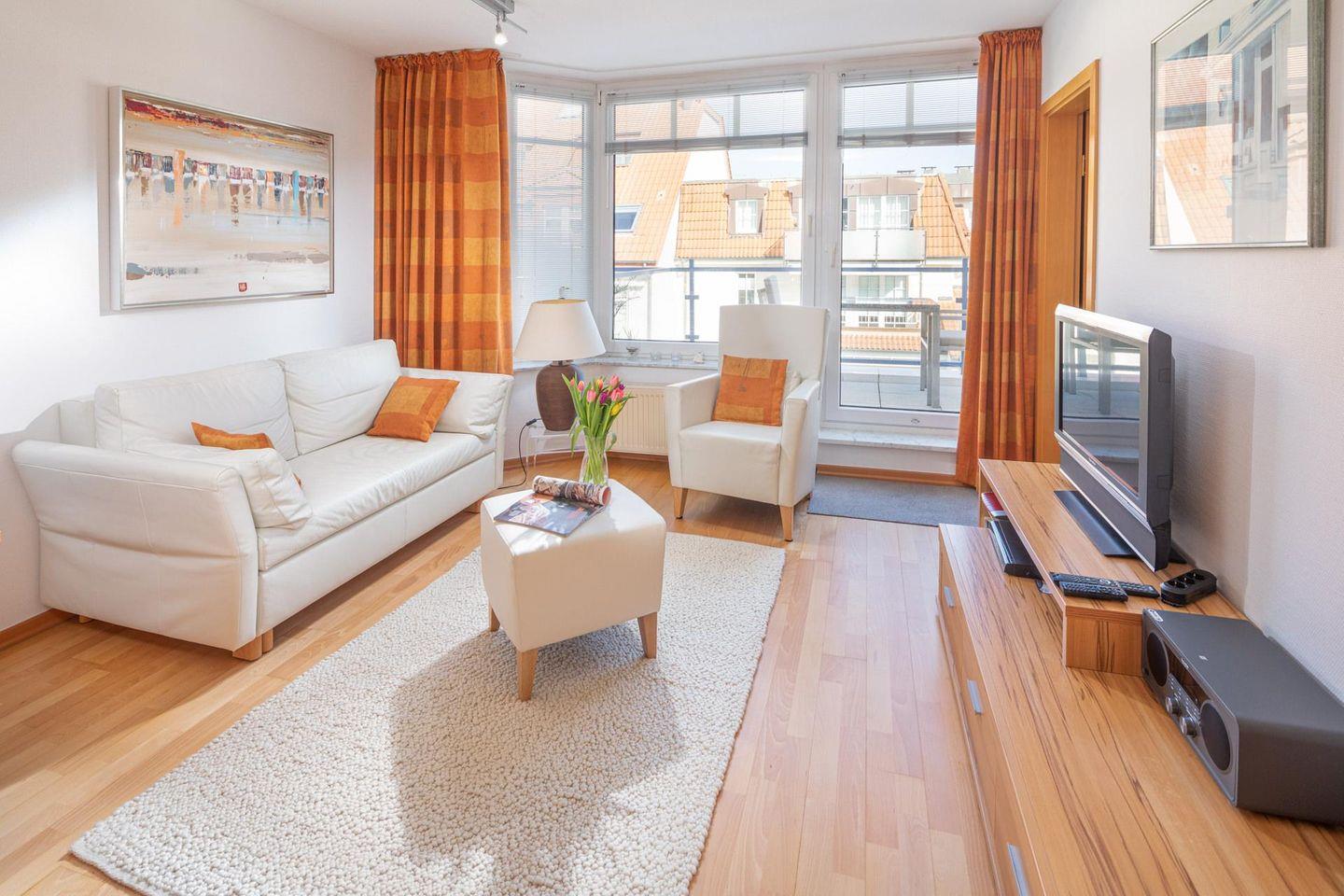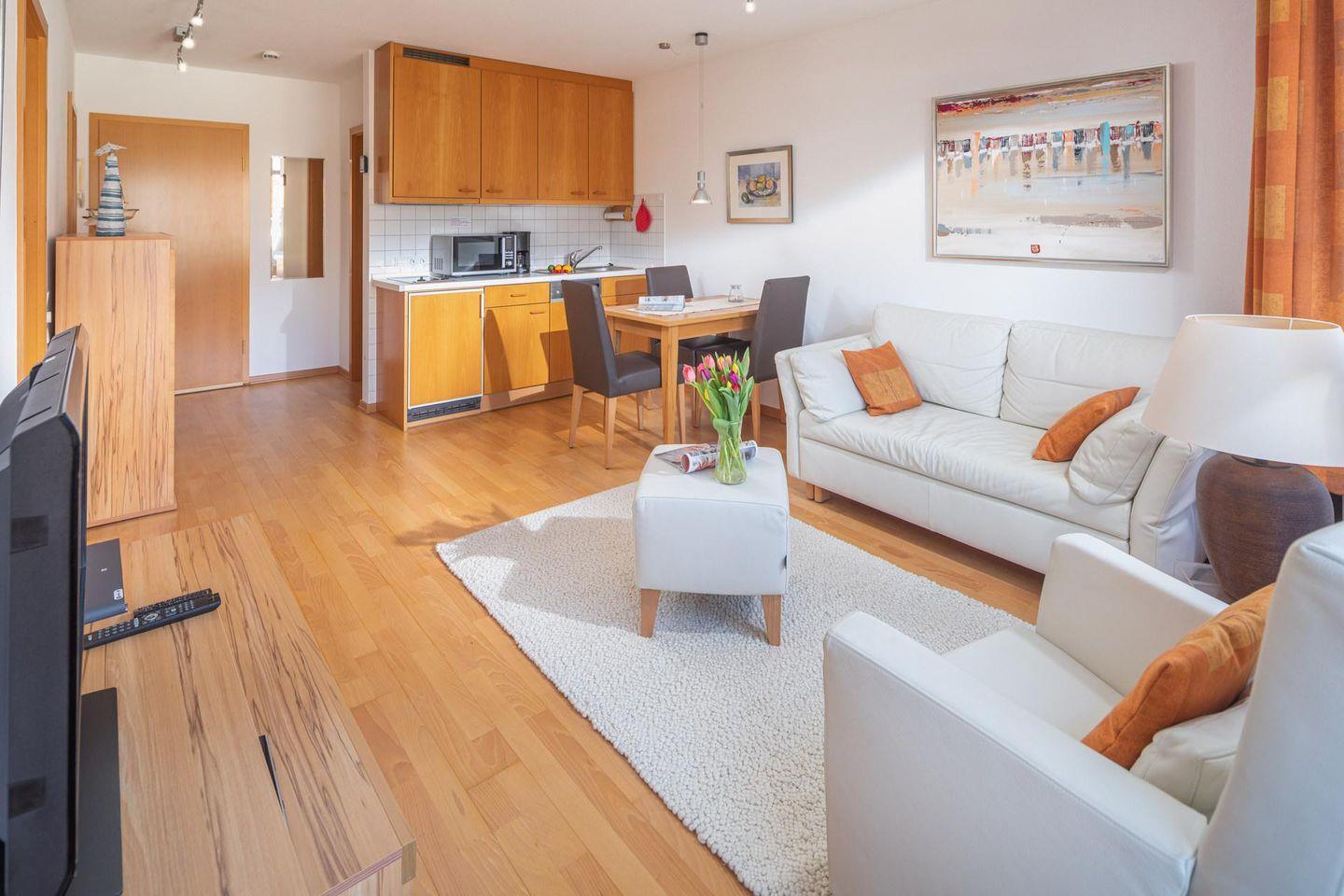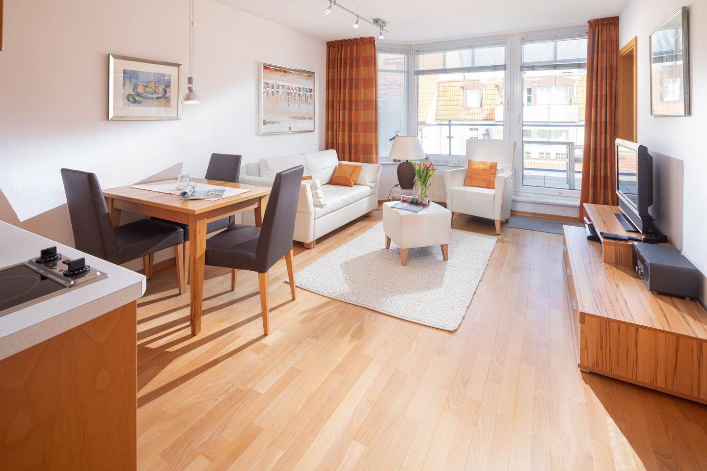 Die Ferienwohnung Kleine Möwe 11 auf Norderney bietet modernen Komfort nahe Kurplatz und Strand mit großem Balkon.