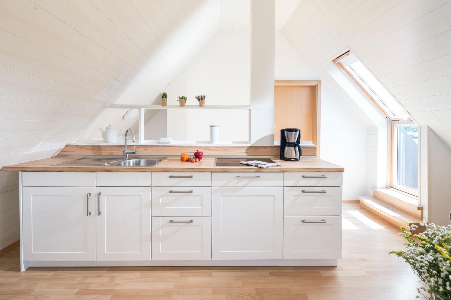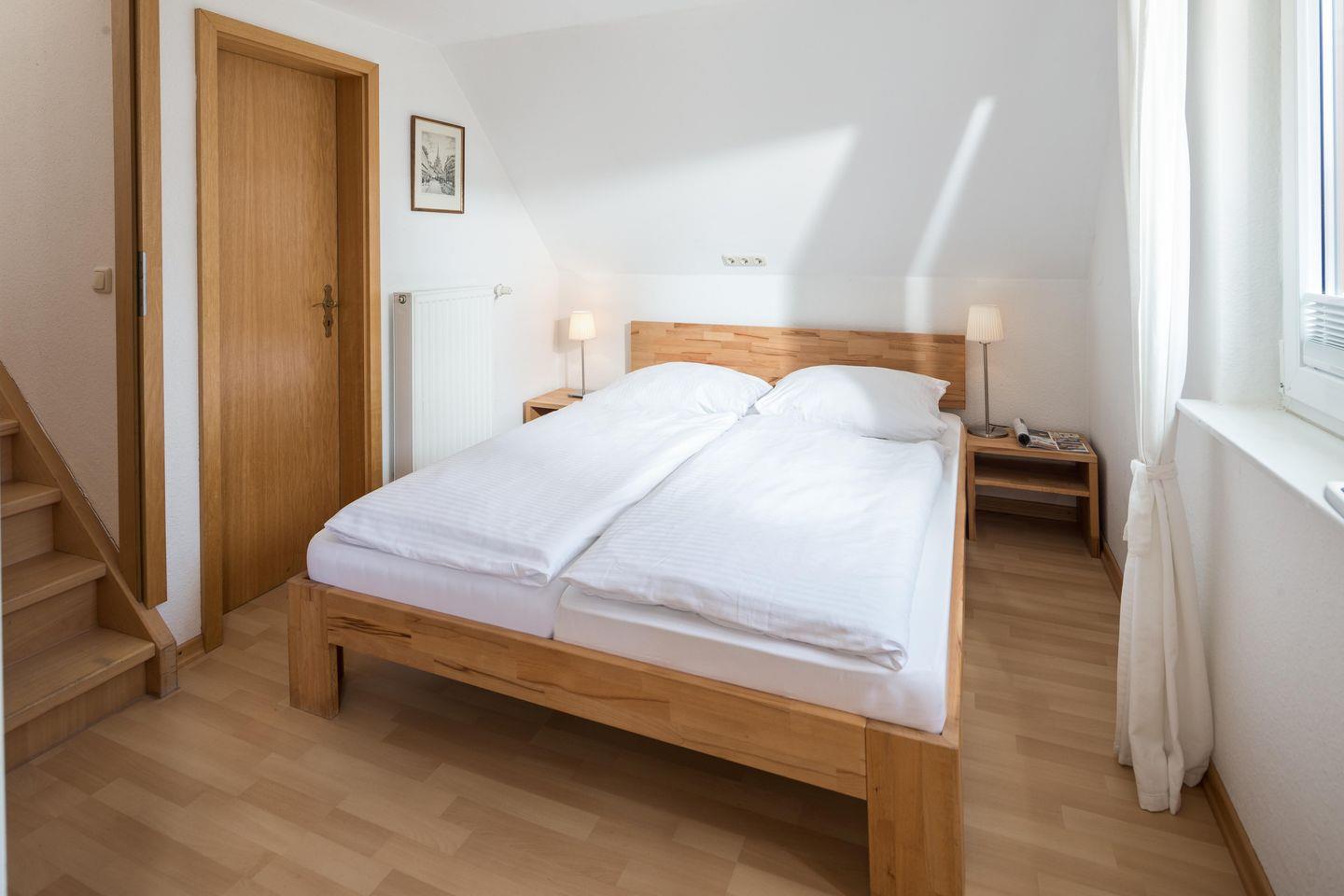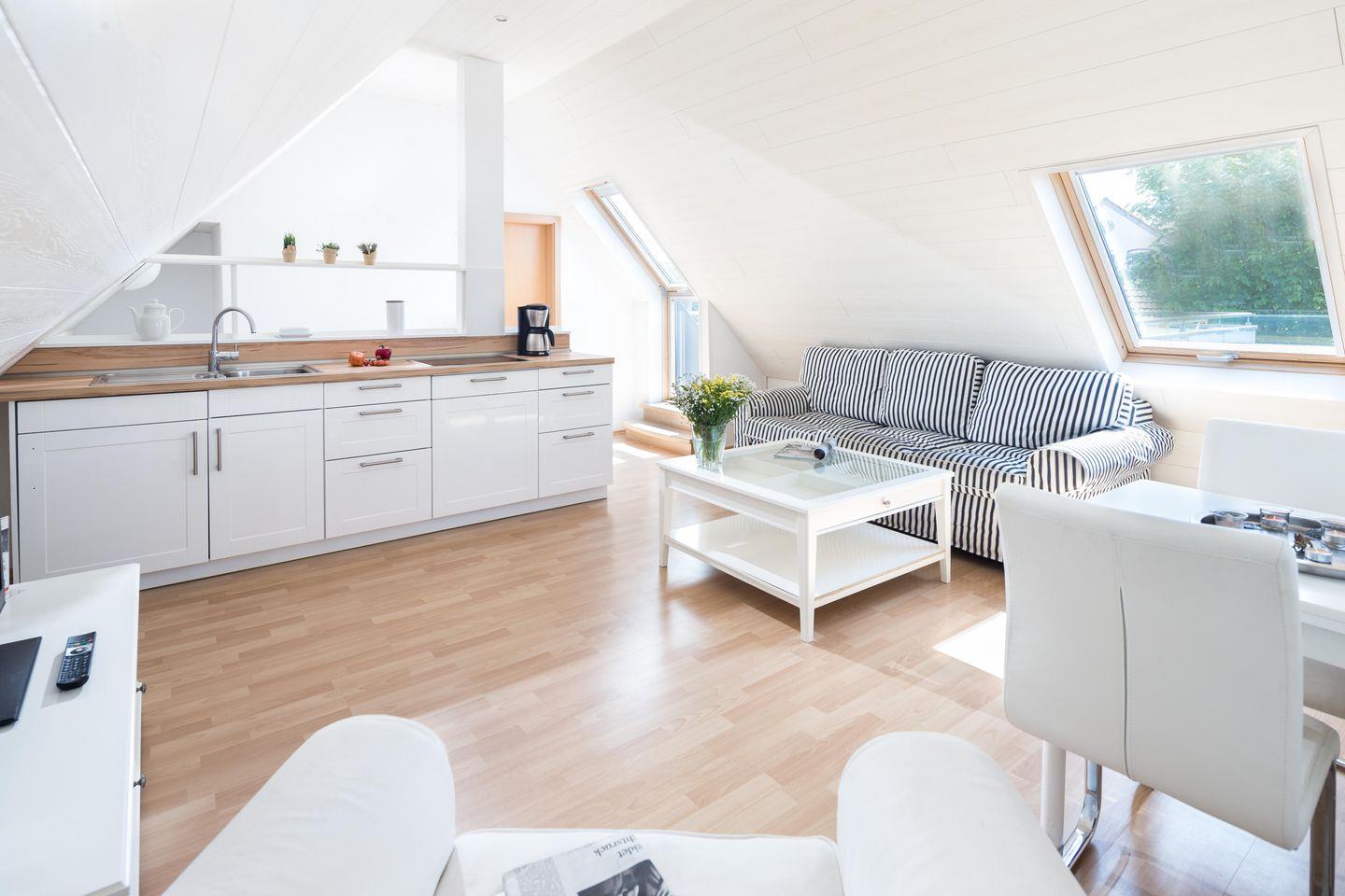 Die Wohnung wird durch eines der Schlafzimmer betreten, von wo aus eine Treppe durch den Spitzboden führt. Dort befinden sich auch der moderne Wohn-Küchenbereich und ein weiteres Schlafzimmer. Beide Schlafzimmer sind mit Doppelbetten eingerichtet. Zudem verfügt die Wohnung über zwei Balkone. Ein Balkon (im Stil einer Dachterrasse) ist vom Wohn-Küchenbereich und von einem der Schlafzimmer aus betretbar. Das Badezimmer ist mit einer Dusche Hunde sind in dieser Ferienwohnung nicht erlaubt.