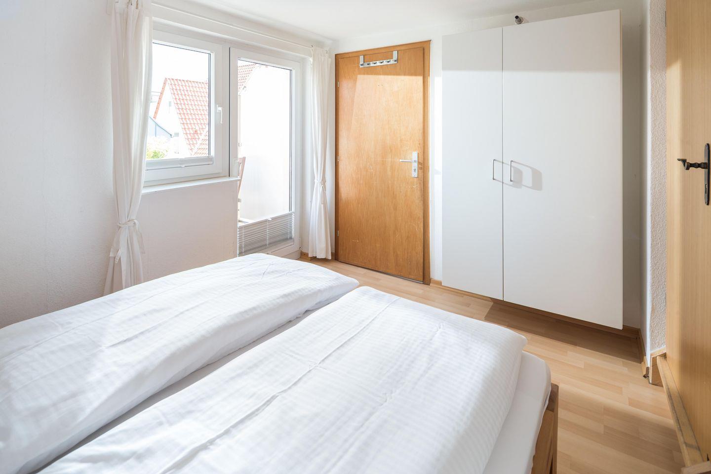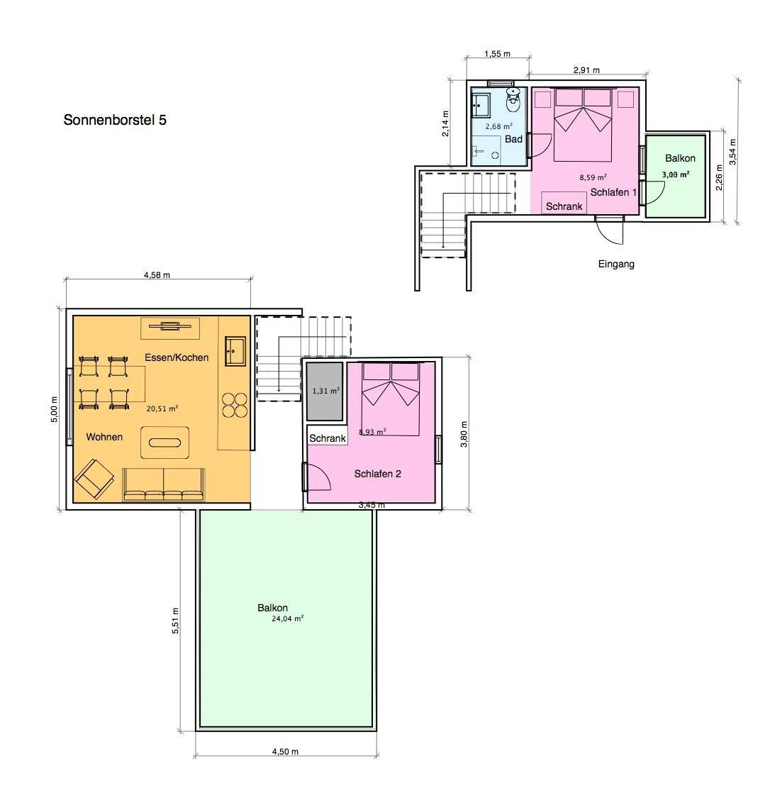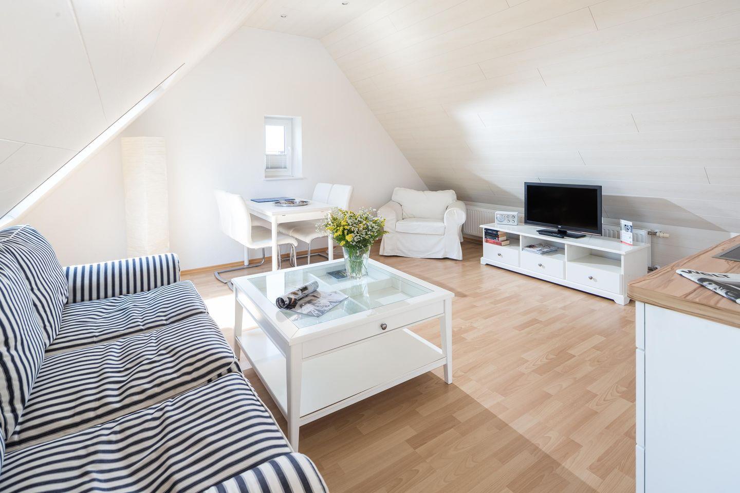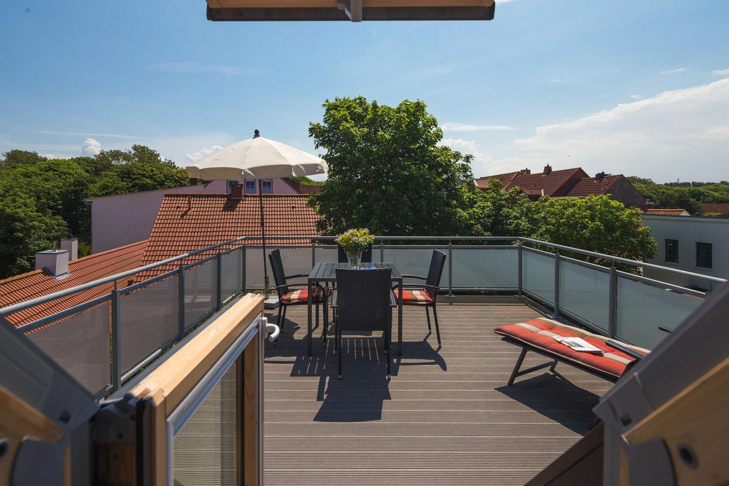 Die Wohnung wird durch eines der Schlafzimmer betreten, von wo aus eine Treppe durch den Spitzboden führt. Dort befinden sich auch der moderne Wohn-Küchenbereich und ein weiteres Schlafzimmer. Beide Schlafzimmer sind mit Doppelbetten eingerichtet. Zudem verfügt die Wohnung über zwei Balkone. Ein Balkon (im Stil einer Dachterrasse) ist vom Wohn-Küchenbereich und von einem der Schlafzimmer aus betretbar. Das Badezimmer ist mit einer Dusche Hunde sind in dieser Ferienwohnung nicht erlaubt.