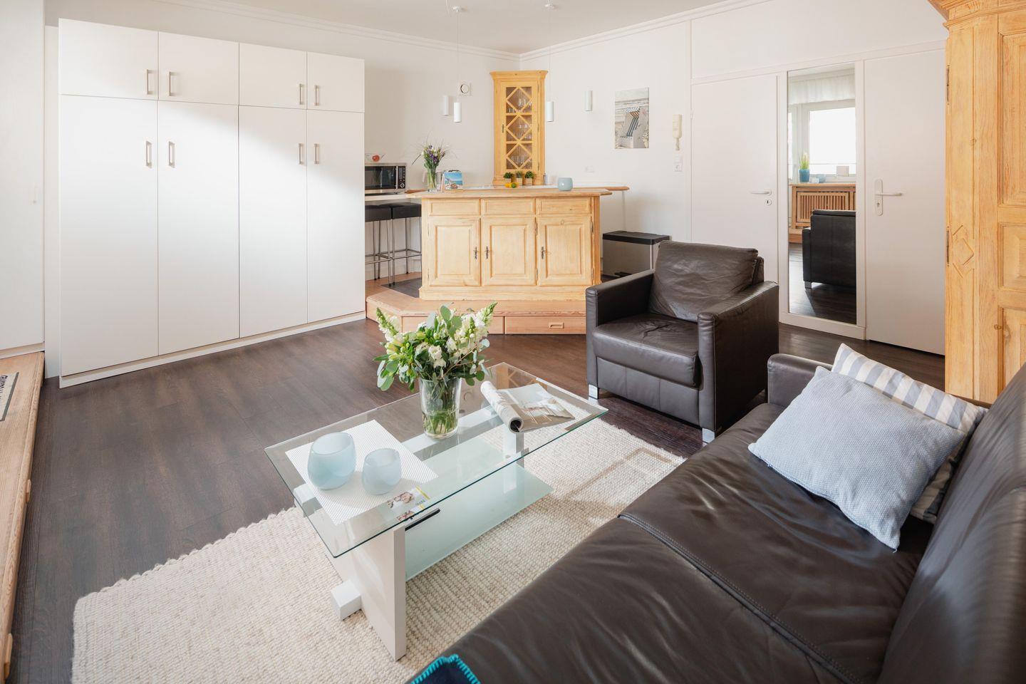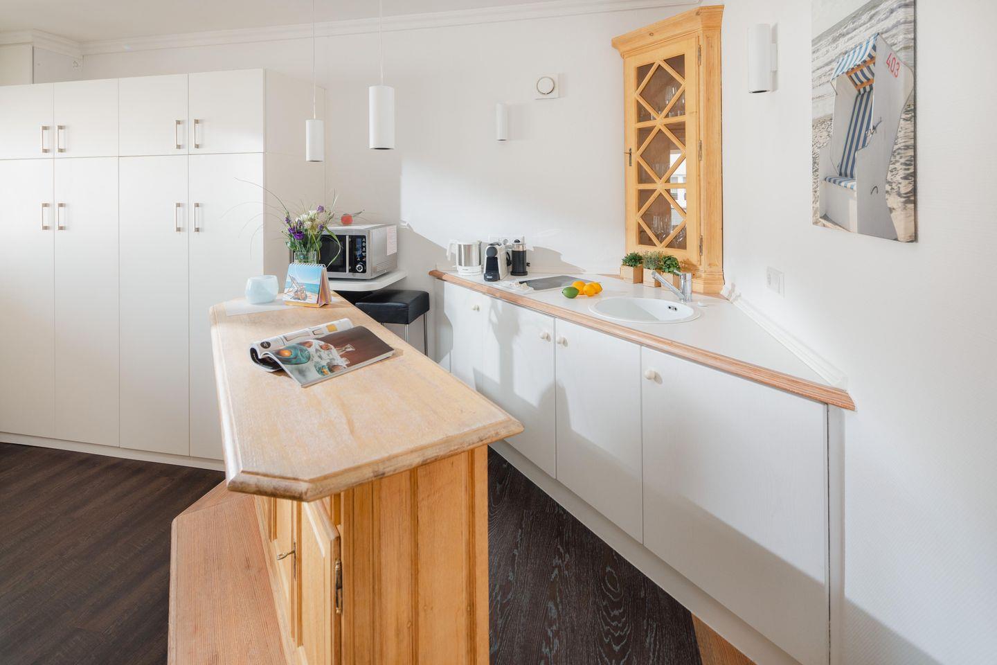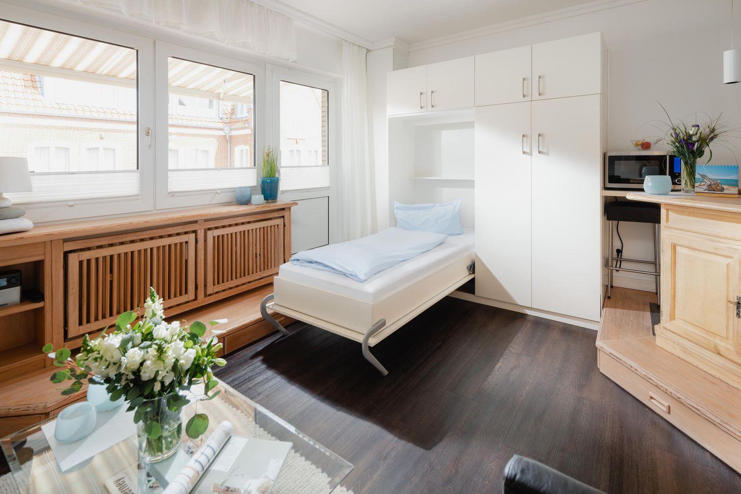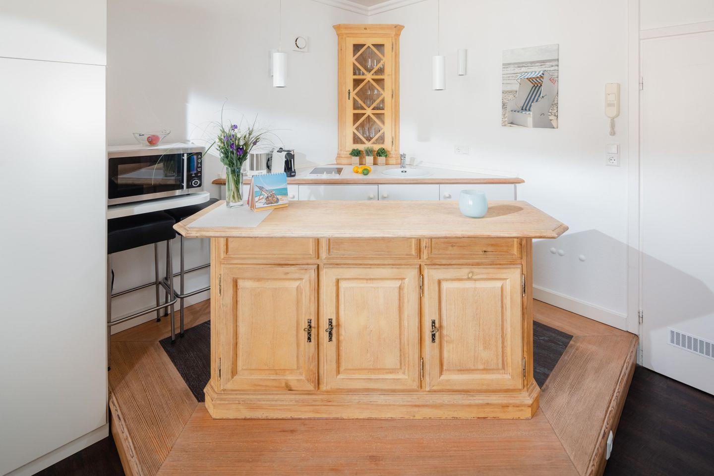 Bei der Innenausstattung wurde Wert auf eine helle und praktische Ausstattung gelegt. Die Küchenzeile, welche auf einem Podest liegt, wurde mit einer Mikrowelle mit Backfunktion ausgestattet. Für alle Gäste im Haus steht ein Fahrradraum zur Verfügung. Die Klappbetten, die sich tagsüber unauffällig verstauen lassen, sorgen für genug Bewegungsfreiheit innerhalb der Wohnung. Im Haus steht eine Waschmaschine (gemeinschaftlich gegen Gebühr) zur Verfügung. WLAN ist ebenfalls vorhanden. Die kleine Ferienwohnung eignet sich optimal für 1-2 Personen. Der Strand befindet sich ca. 500m entfernt.