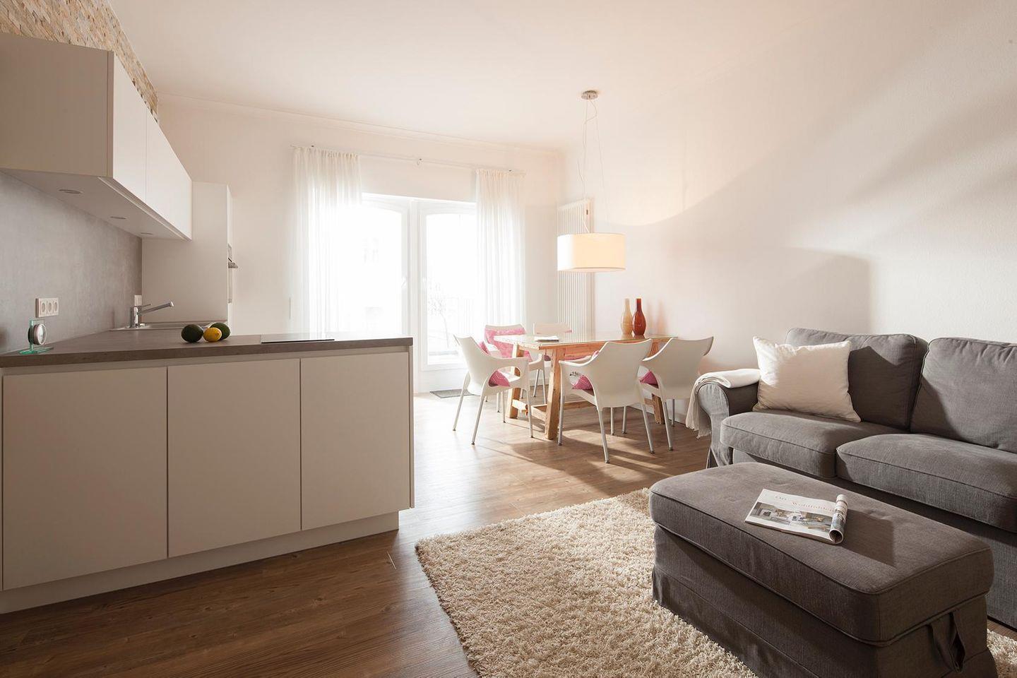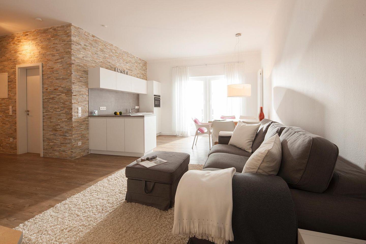 Bei der Innenausstattung der Wohnung wurde auf Naturtöne und moderne Details geachtet. Weiter wurde die Wohnung mit einer WII-U-Konsole als auch einer PlayStation 4 ausgestattet. Für Liebhaber von Kaffee gibt es gleich drei Möglichkeiten: Neben einer normalen Filterkaffeemaschine stehen eine Senseo- sowie eine Nespresso-Maschine bereit. Die moderne Küchenzeile ist mit einem 2-flammigen Ceranfeld und einer Mikrowelle ausgestattet.