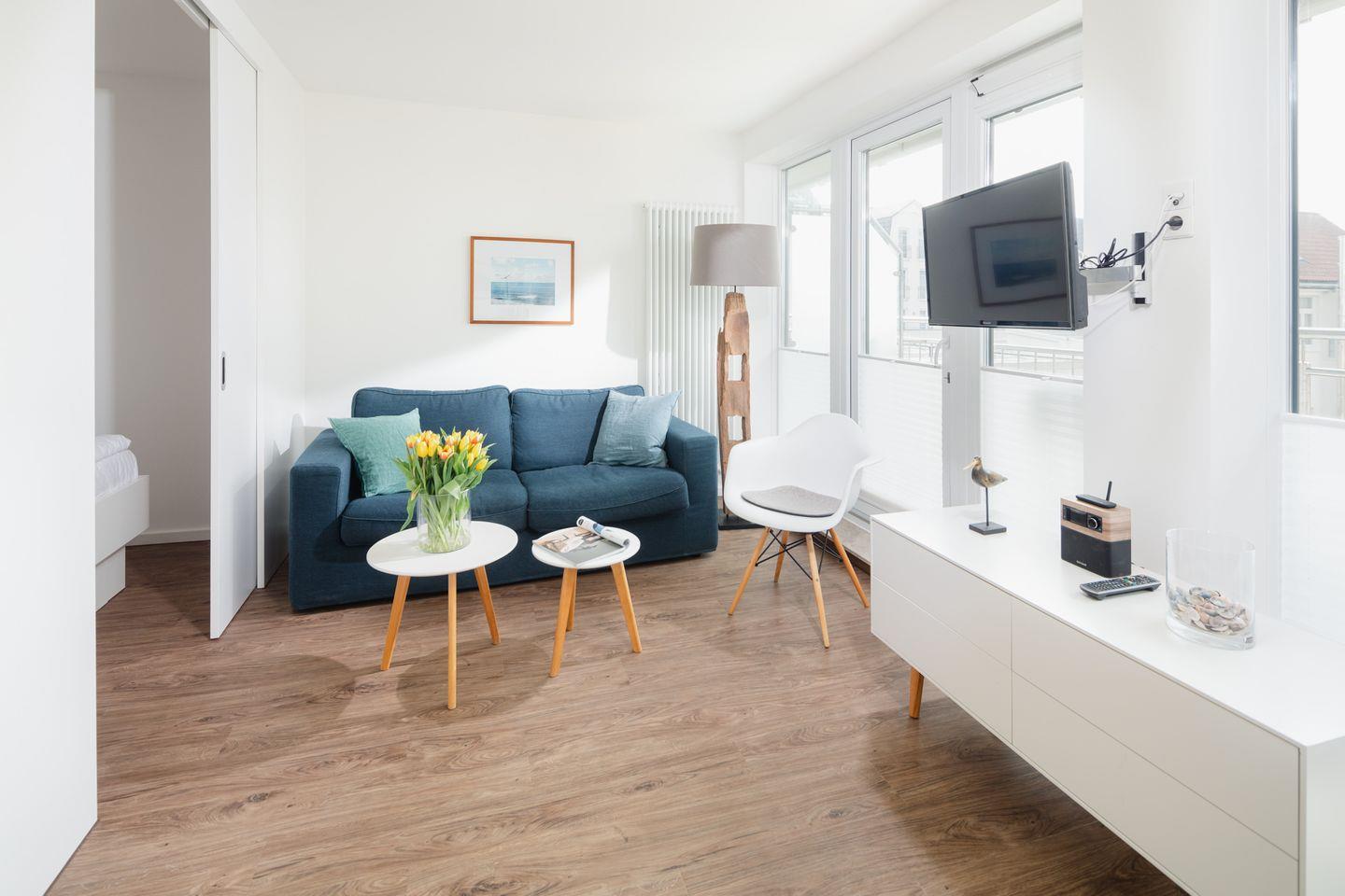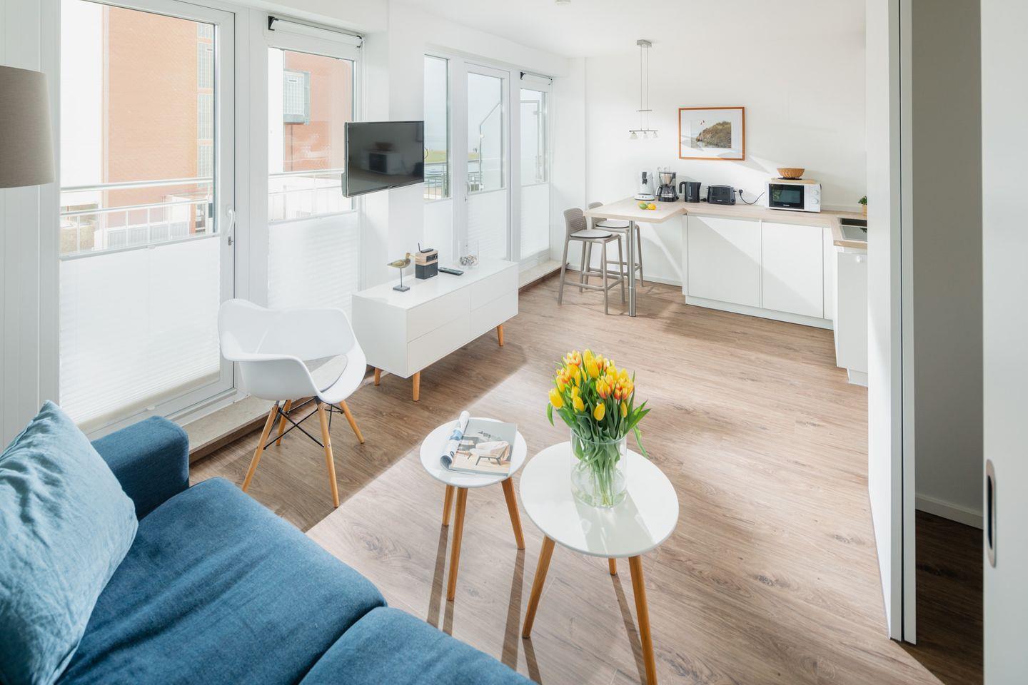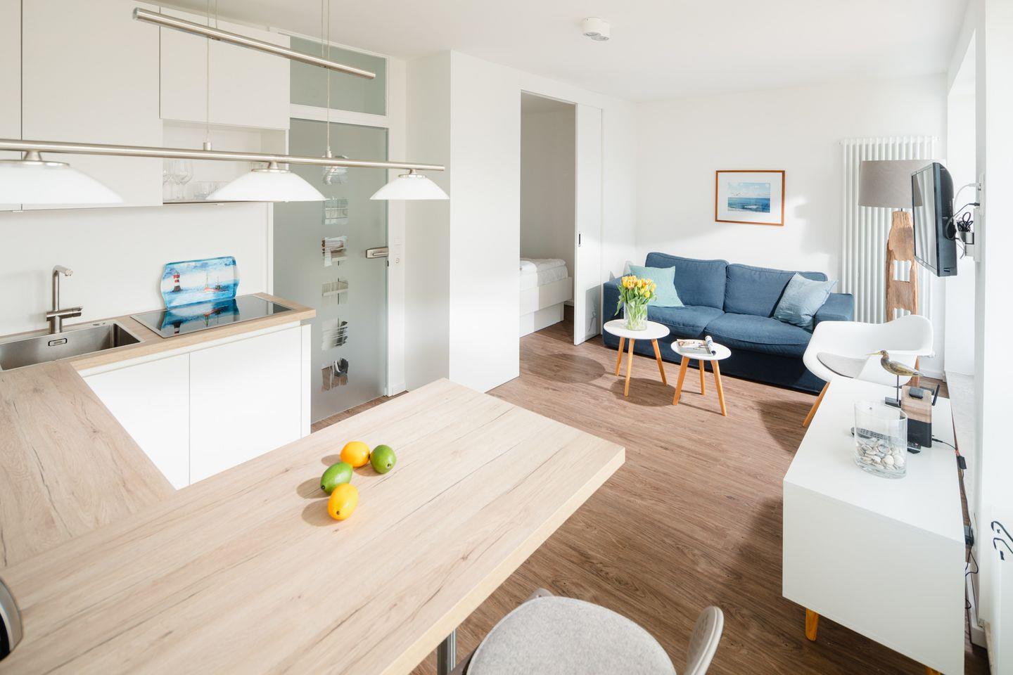 Die Wohnung bietet einen Schlafbereich, welcher mit einem Boxspringbett (1,80m x 2,00m) ausgestattet ist. Der Wohnbereich ist mit einer kleinen Couch und einem schwenkbaren Flachbild-TV eingerichtet. Die moderne (offene) Küche bietet neben einer klassischen Kaffeemaschine auch eine Senseo-Kaffeemaschine sowie einen Toaster und eine Spülmaschine. Der Balkon liegt nach Westen und bietet einen seitlichen Meerblick. Im Apartmenthaus "Kaiserhof" stehen den Bewohnern eine Waschmaschine und ein Wäschetrockner (beide mit Münzeinwurf) zur Verfügung. Zusätzlich steht eine Sauna bereit, die ebenfalls gegen Münzeinwurf nutzbar ist. Es ist zu beachten, dass das Schwimmbad aufgrund eines technischen Defektes geschlossen ist. Fahrräder können vor dem Haus (Nordseite) oder im Fahrradraum abgestellt werden. Hunde sind in dieser Wohnung nicht erlaubt.