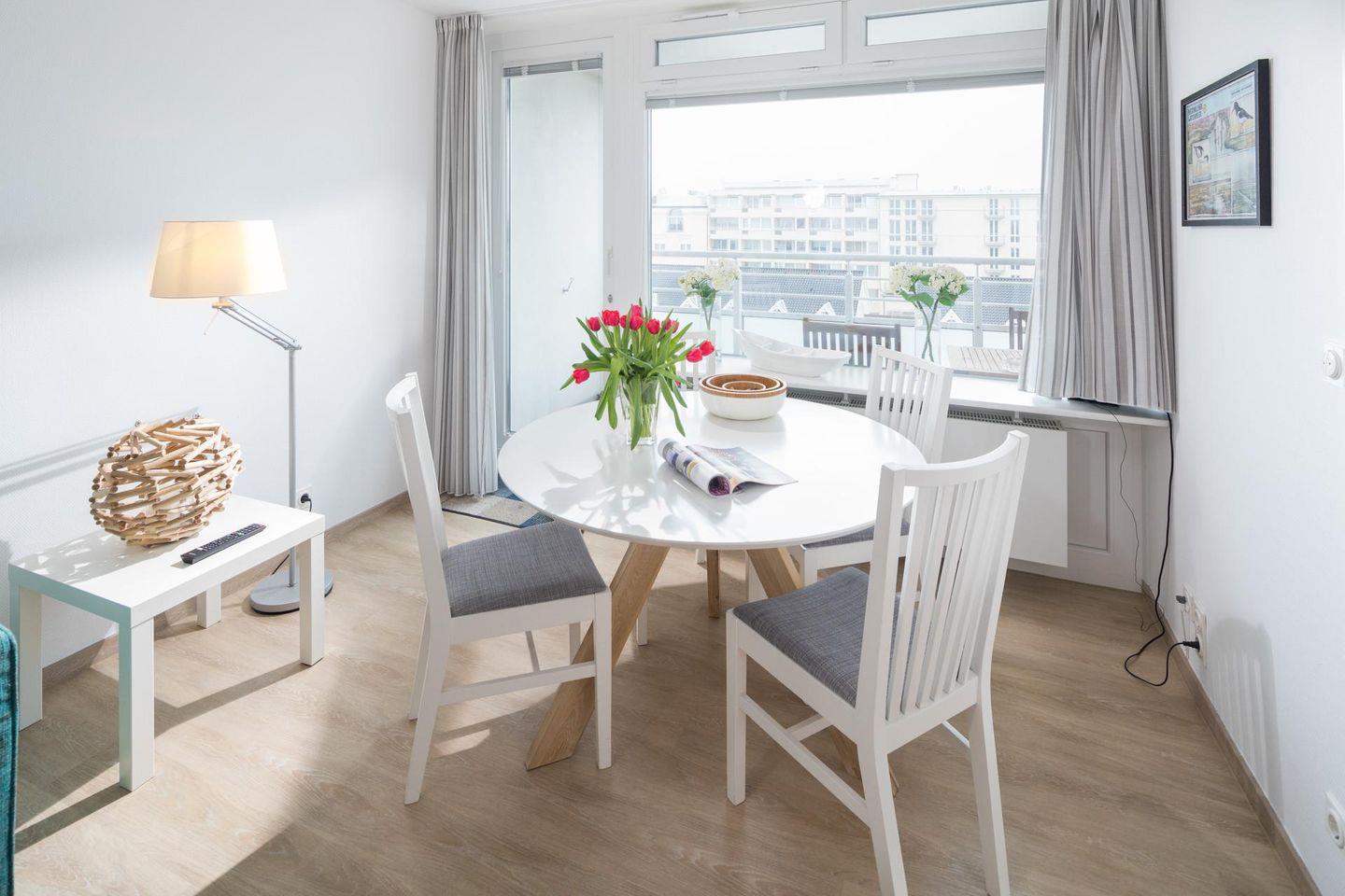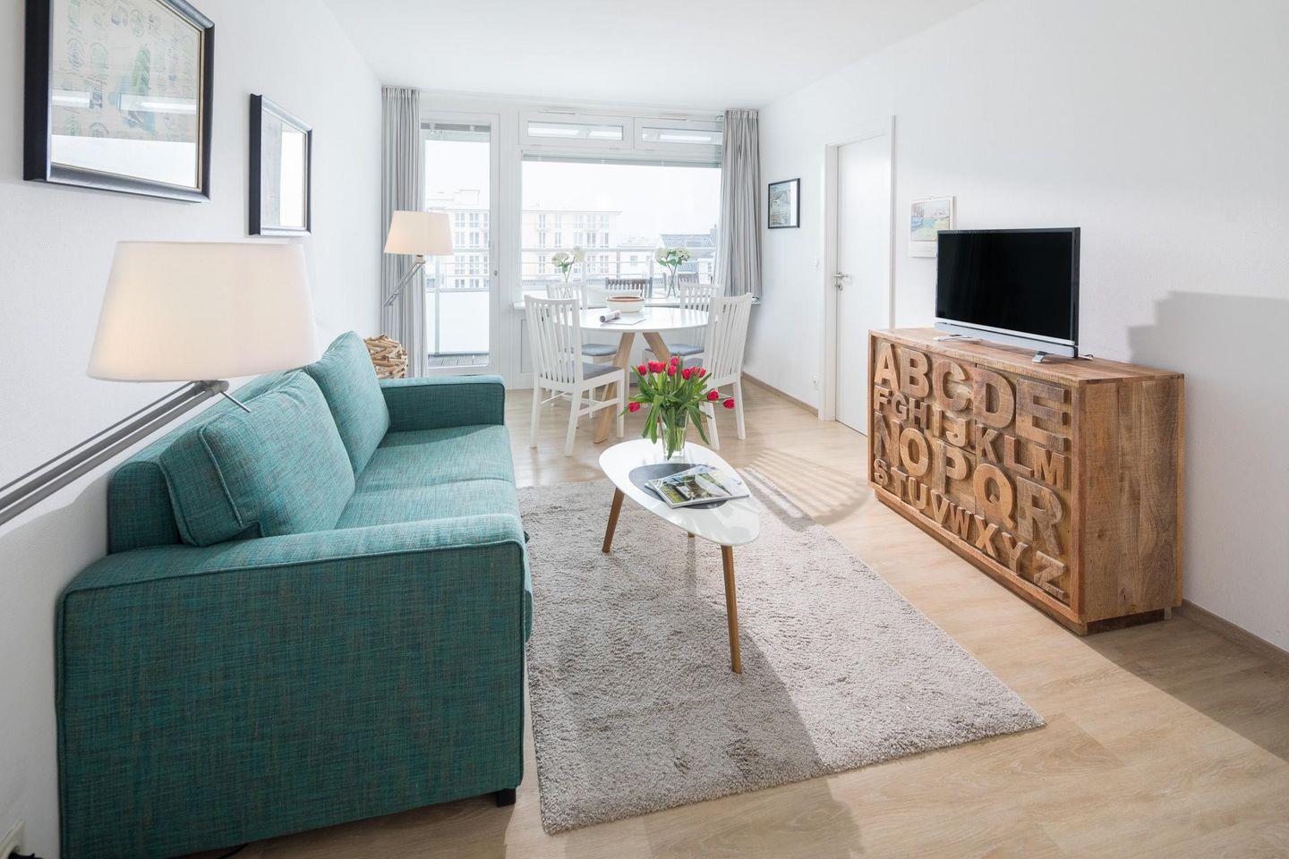 Ferienwohnung Nordseeblick 121 mit Balkon nahe Strand und Inselkern, modern und maritim eingerichtet.