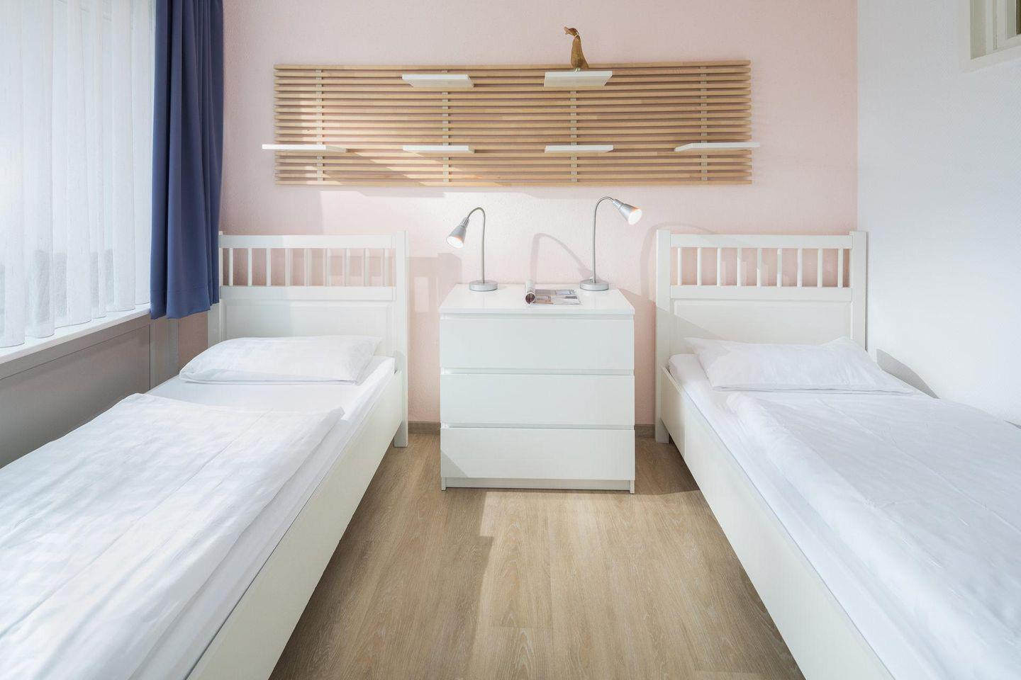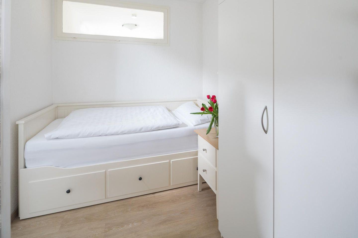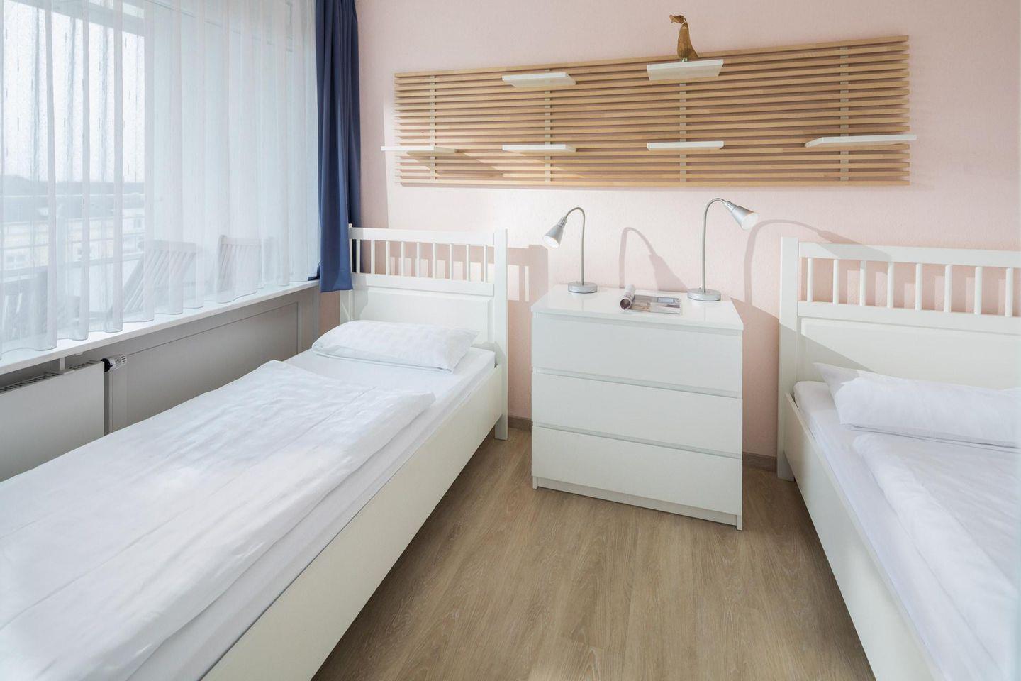 Die Wohnung 121 wurde kürzlich renoviert und in maritimen Farben neu möbliert. Die Wohnung verfügt über ein Wohn- und Schlafzimmer mit zwei Einzelbetten und eine kleine, aber gut ausgestattete Küchenecke. Für eine weitere Schlafmöglichkeit steht eine Schlafcouch im Wohnzimmer zur Verfügung. Das moderne Badezimmer ist mit einer Dusche und einem Handtuchtrockner ausgestattet. Ein Highlight der Wohnung ist der (mit Teakholzmöbeln) möblierte Nord/Ost Balkon. Waschmaschine und Wäschetrockner befinden sich im Haus und stehen (für die gemeinschaftliche Nutzung gegen Münzeinwurf) zur Verfügung, was besonders für längere Aufenthalte von Vorteil ist. Hunde sind in dieser Wohnung nicht erlaubt.