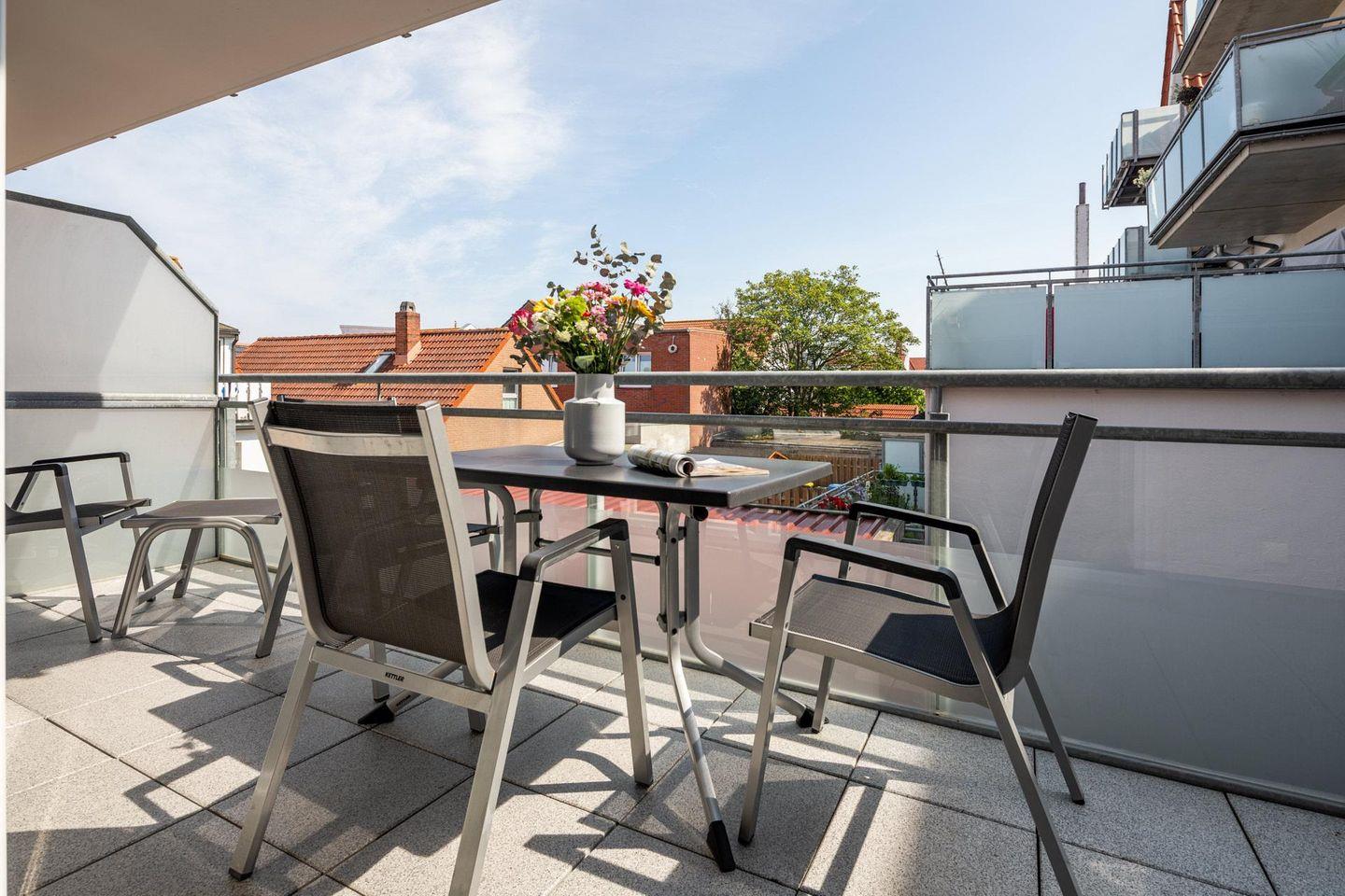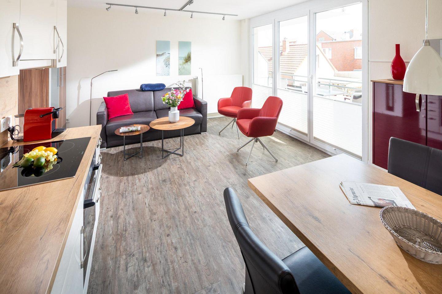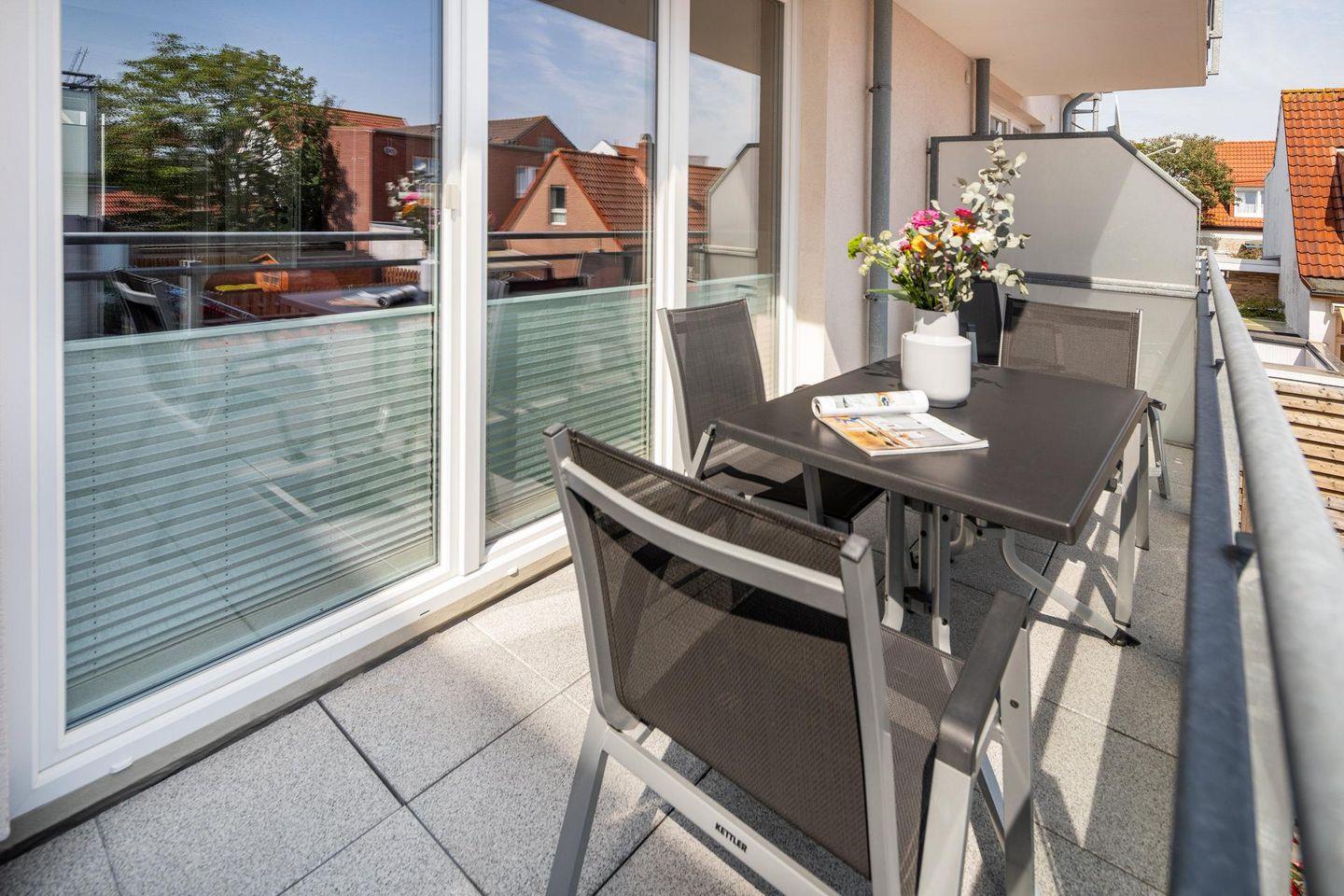 Moderne Ferienwohnung "Applaus" auf Norderney mit zwei Schlafzimmern, Balkon, Dachterrasse und barrierefreiem Zugang.