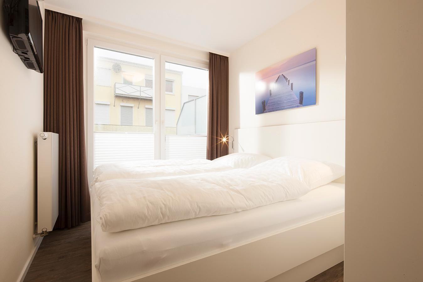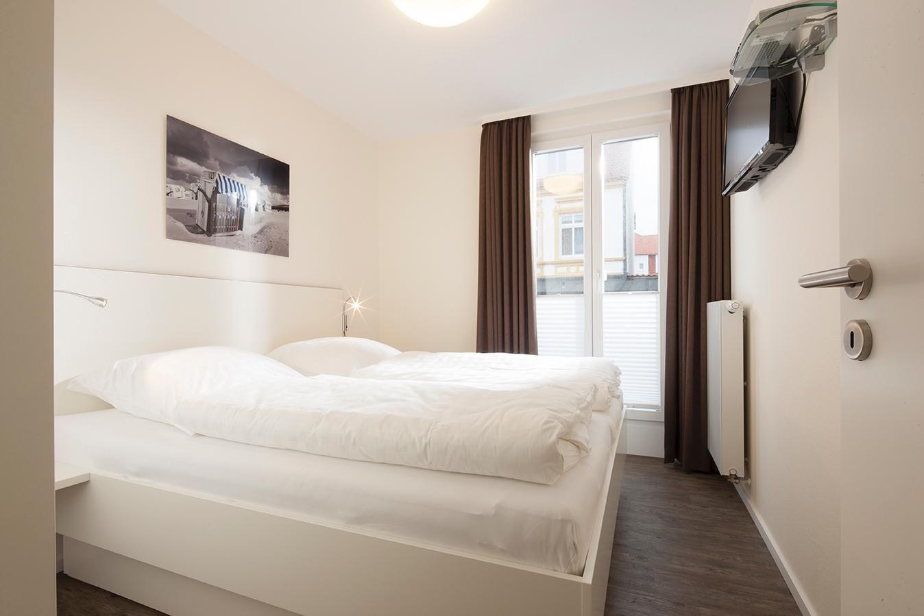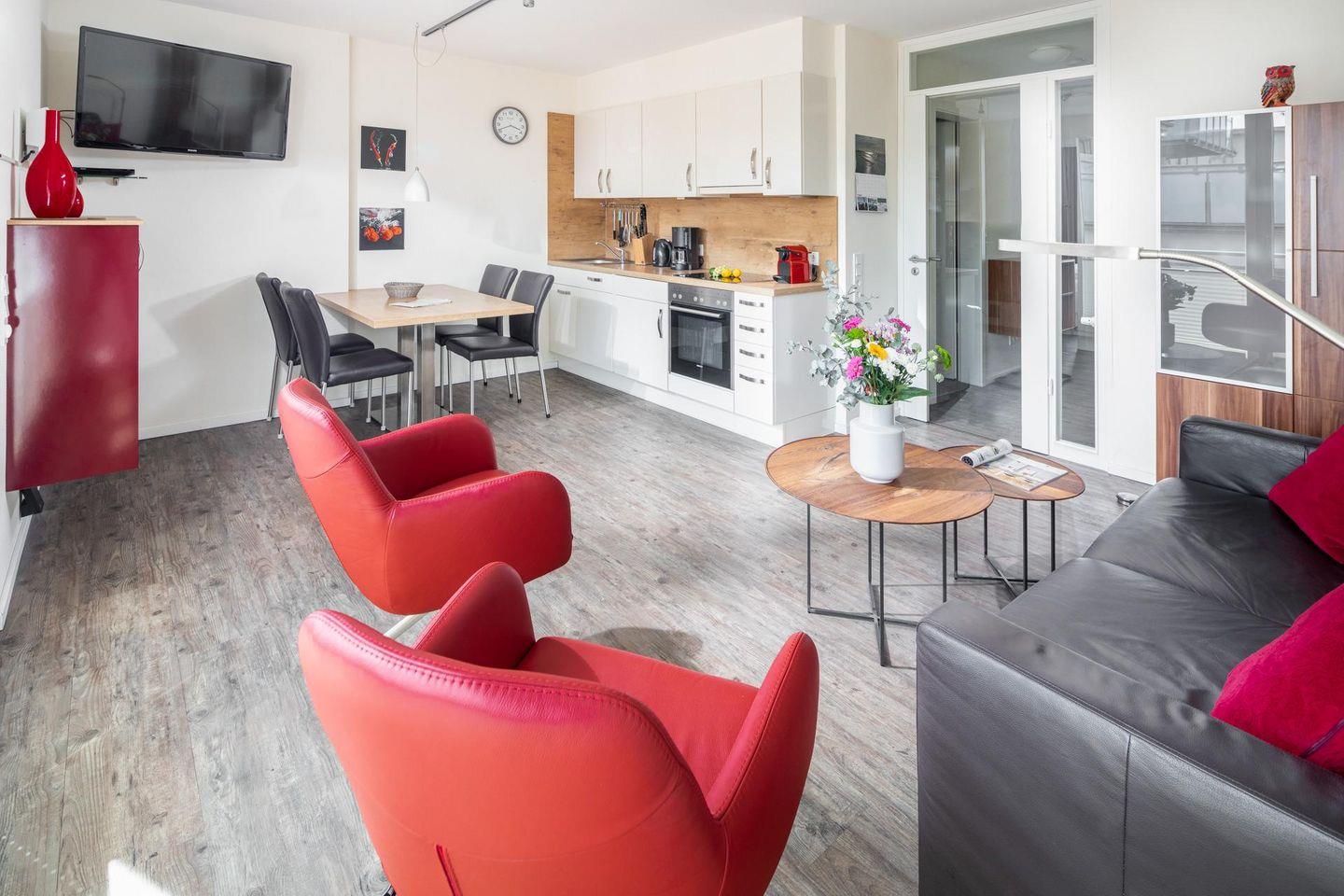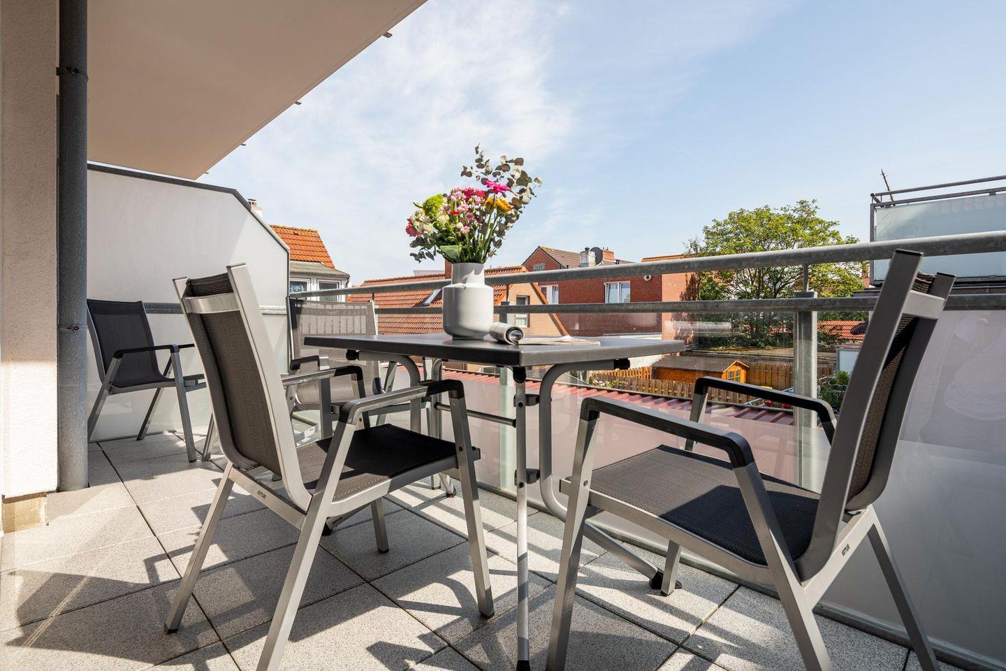 Moderne Ferienwohnung "Applaus" auf Norderney mit zwei Schlafzimmern, Balkon, Dachterrasse und barrierefreiem Zugang.