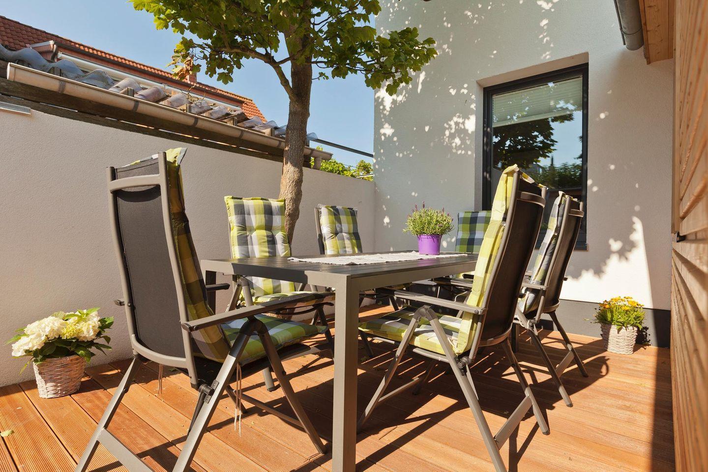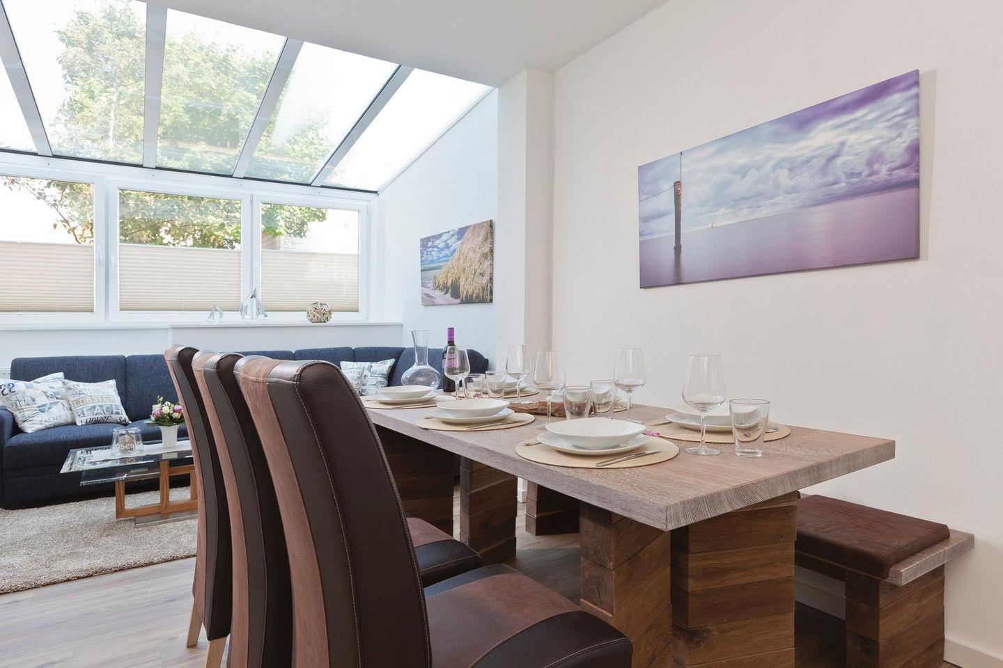 Das Haus Kleine Auszeit in Norderney bietet Familien und Gruppen eine komfortable Unterkunft mit eigenem Innenhof und separatem Schlafzimmer.