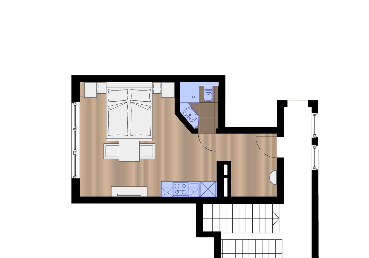 Die Wohnungseinrichtung ist modern gehalten. Die Wohnung verfügt über ein kombiniertes Wohn- und Schlafzimmer mit einem Doppelbett. Die kleine Küchenzeile ist gut ausgestattet. Das moderne Badezimmer mit Dusche und WC rundet das Raumangebot ab. Waschmaschine und Wäschetrockner befinden sich im Haus und stehen (für die gemeinschaftliche Nutzung gegen Münzeinwurf) zur Verfügung, was besonders für längere Aufenthalte von Vorteil ist. Hunde sind in dieser Ferienwohnung nicht erlaubt.