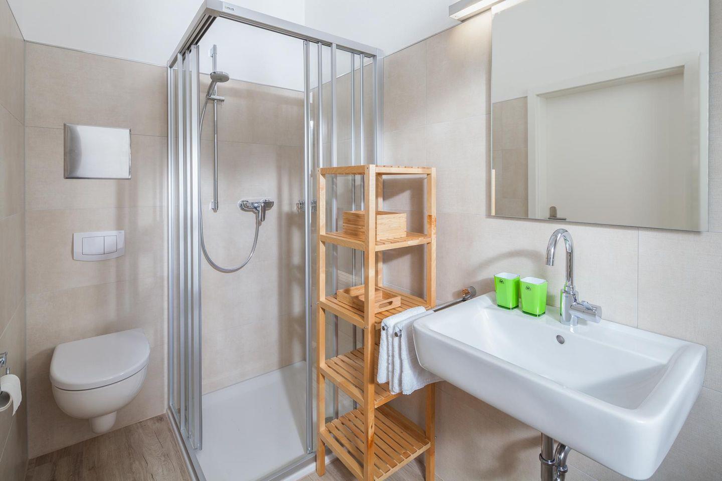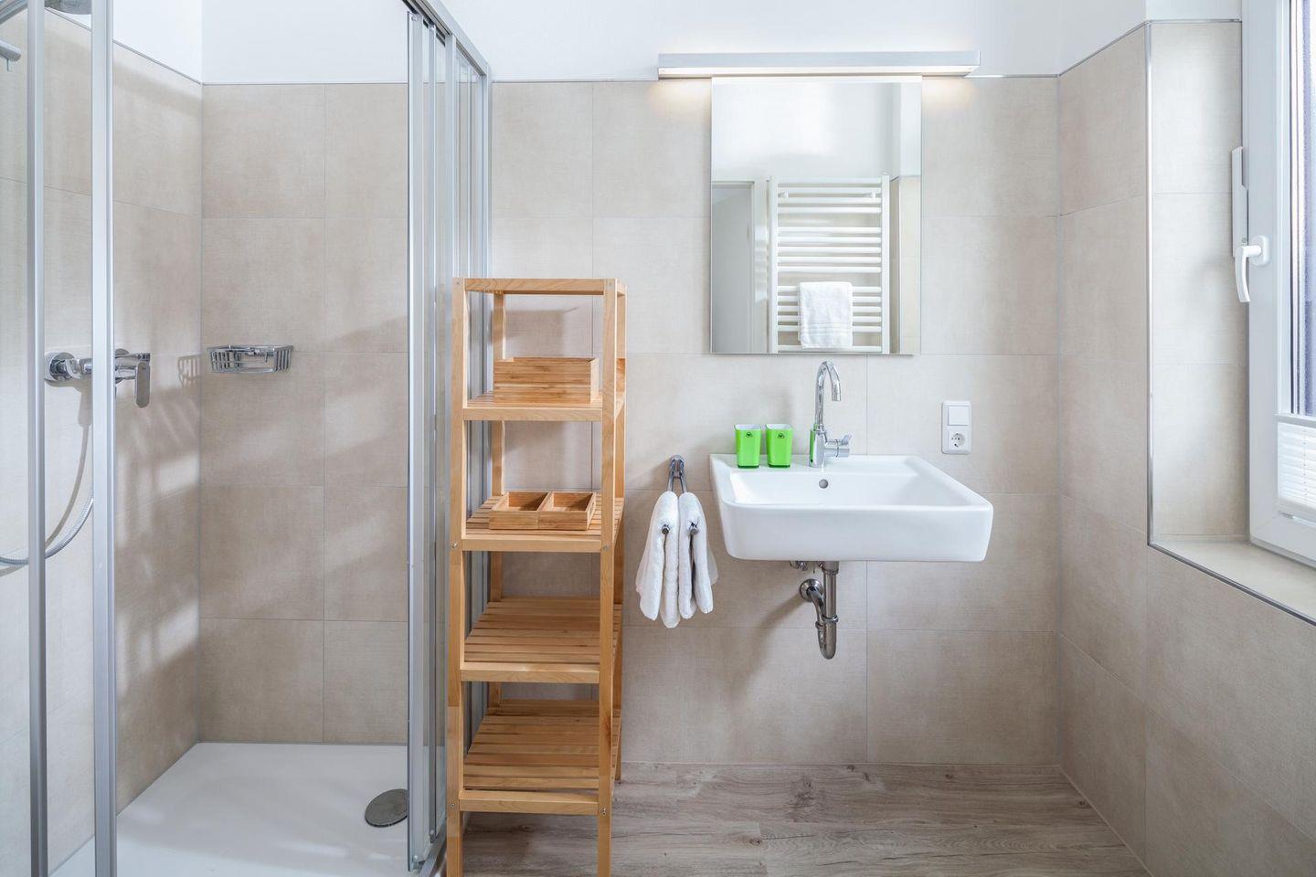 Die Wohnung bietet ein Wohnzimmer mit offenem Küchen-/Essbereich in der Veranda. Das Schlafzimmer ist zur Rückseite des Hauses gelegen und ist mit einem Doppelbett (2 Matratzen á 1,00m x 2,00m) ausgestattet. Direkt vom Schlafzimmer geht es in das moderne Bad mit Dusche und WC. Ein zusätzliches Gäste-WC ist vom Wohnzimmer aus erreichbar. Passgenaue Schrankeinbauten vom Tischler bieten viel Platz und das Sofa lässt sich zu einer weiteren Schlafgelegenheit für 2 Personen umfunktionieren. Die Wohnung verfügt über einen Glasfaseranschluss mit guter Übertragungsqualität. Im Hof bietet ein Schuppen Platz zum Abstellen von Fahrrädern oder auch eines Kinderwagens. Hunde sind in dieser Ferienwohnung nicht erlaubt.