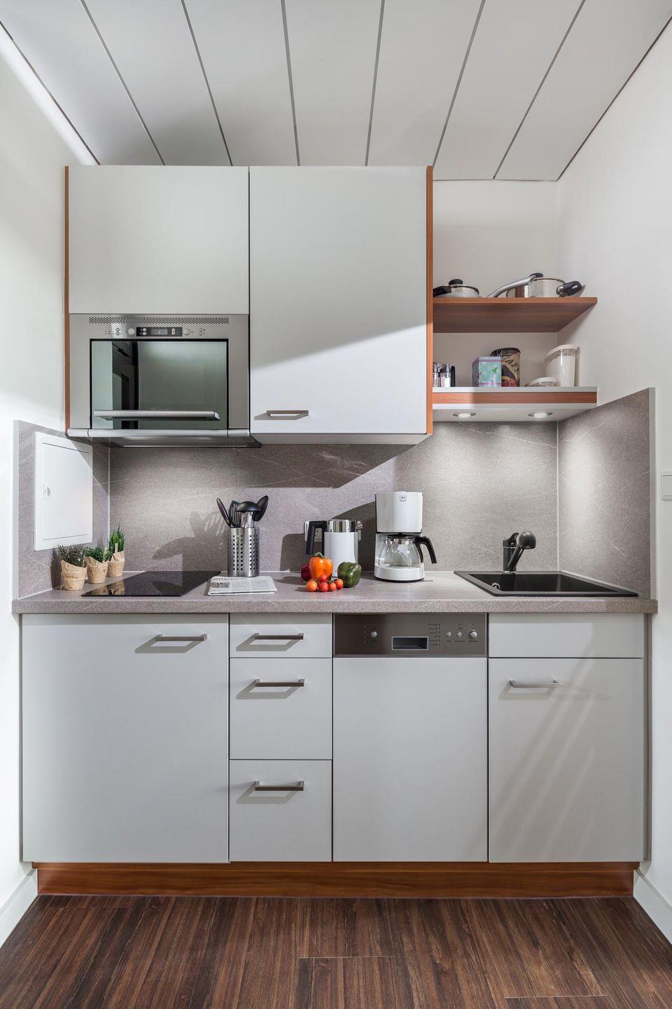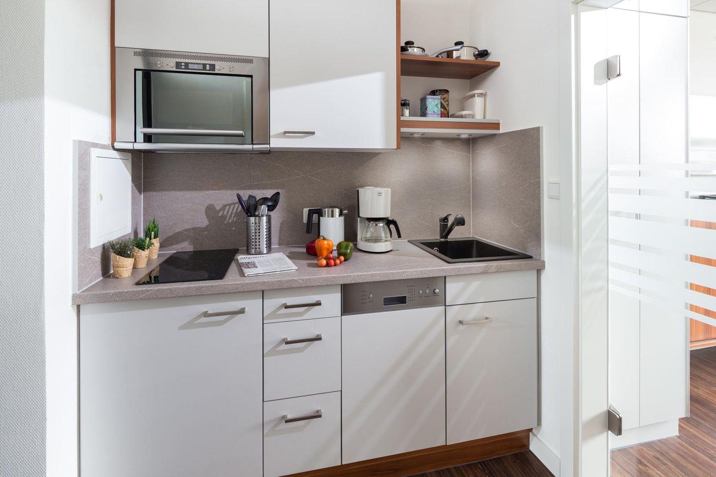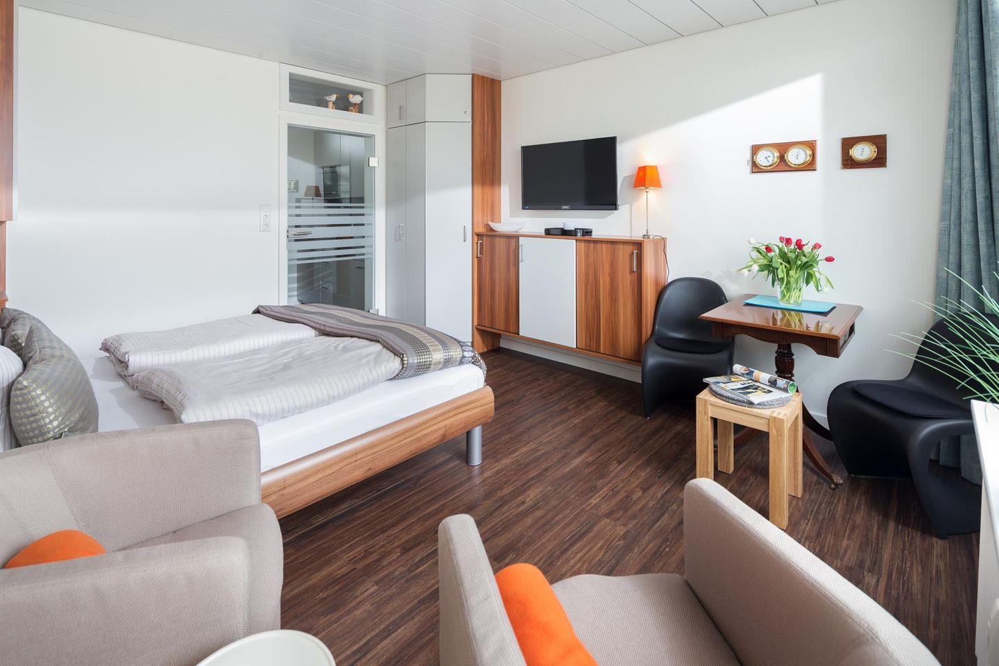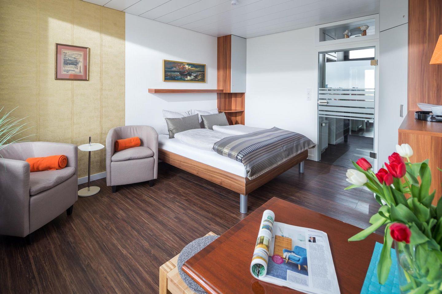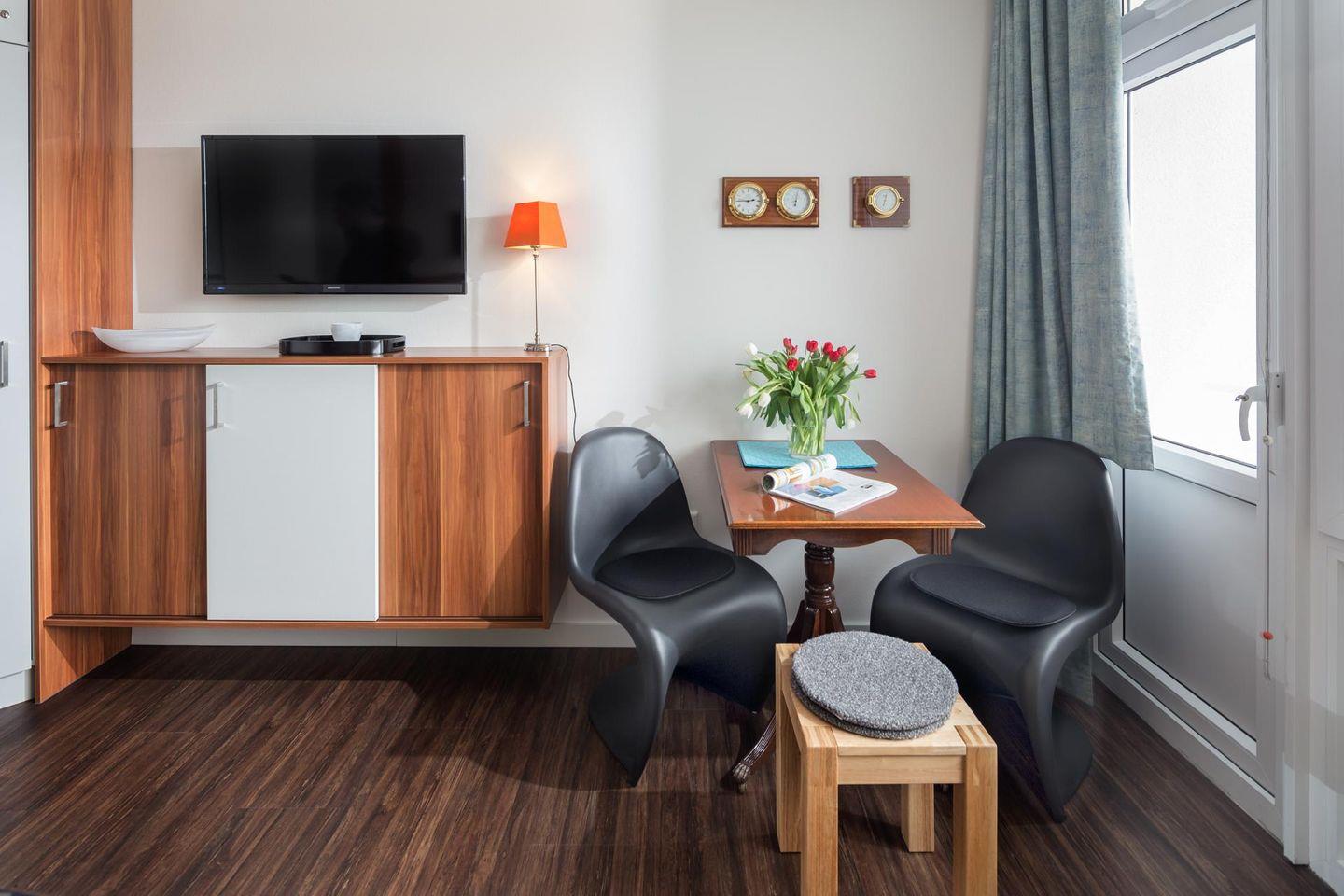 Das 1-Raum-Apartment ist mit einem Doppelbett (160 cm breit) ausgestattet und bietet Platz für bis zu 2 Personen. Weiter verfügt die Wohnung über ein modernes Bad mit Dusche und WC sowie eine gut ausgestattete Küchenzeile. Der Balkon der Wohnung liegt zur Südseite. Im Haus stehen eine Waschmaschine und ein Wäschetrockner zur gemeinsamen Nutzung (ggfs. gegen Gebühr) zur Verfügung. Die Wohnung hat kein WLAN. Hunde sind in dieser Ferienwohnung nicht erlaubt.