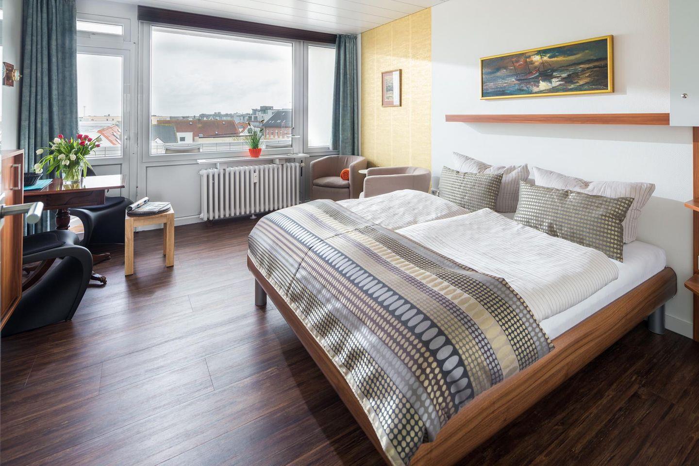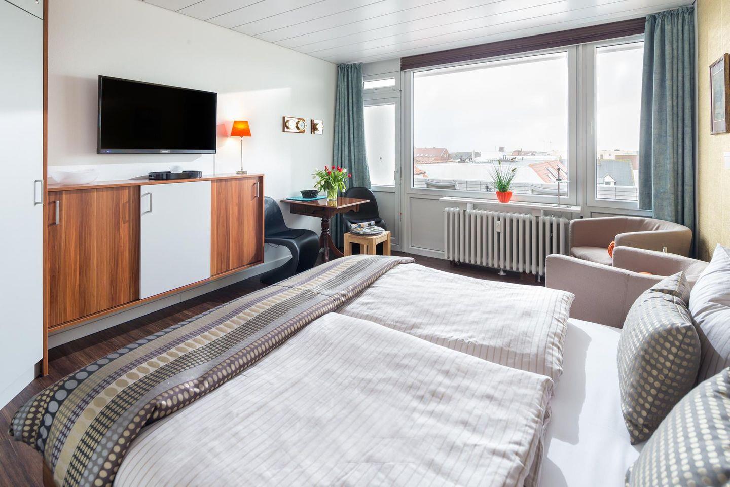 Die Ferienwohnung "Lüttje Möwe" liegt in der Luisenstraße. Das Apartment Nr. 25 wurde im Frühjahr 2016 komplett erneuert. Vom fünften Stock aus kann man zudem seitlich das Meer sehen. Ein Aufzug bringt die Gäste bis in den vierten Stock, von dort aus führen noch einige Stufen zur Wohnung. Der Strand, hier: Weststrand, liegt in unmittelbarer Nähe (ca. 110m entfernt). Auch zahlreiche Restaurants, Cafés oder andere Einkaufsmöglichkeiten sind in wenigen Gehminuten erreichbar.