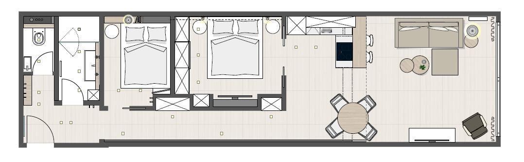 Die Wohnung verfügt über zwei separate Schlafzimmer, darunter ein Bett mit 2,10 m Länge. Die offene Küche wurde voll ausgestattet. Im Wohnbereich sorgen drei TV Screens, darunter ein SmartTV, und zwei Blue Ray Player für Unterhaltung. Ein eigener Hot Spot-WLAN sorgt für eine stets stabile Internetverbindung. Beim Design der Wohnung wurde auf helle und natürliche Farben Wert gelegt. Zudem wurde die Wohnung mit Jalousien und einer Markise ausgestattet. Die Wohnung ist kinderfreundlich ausgestattet und verfügt über ein kleines Kinder-Zelt-Bett, einen Kinderstuhl und zahlreiche Spielutensilien. Hunde sind in dieser Ferienwohnung nicht erlaubt. Es muss hier beachtet werden, dass das Schwimmbad bis auf Weiteres geschlossen bleibt!