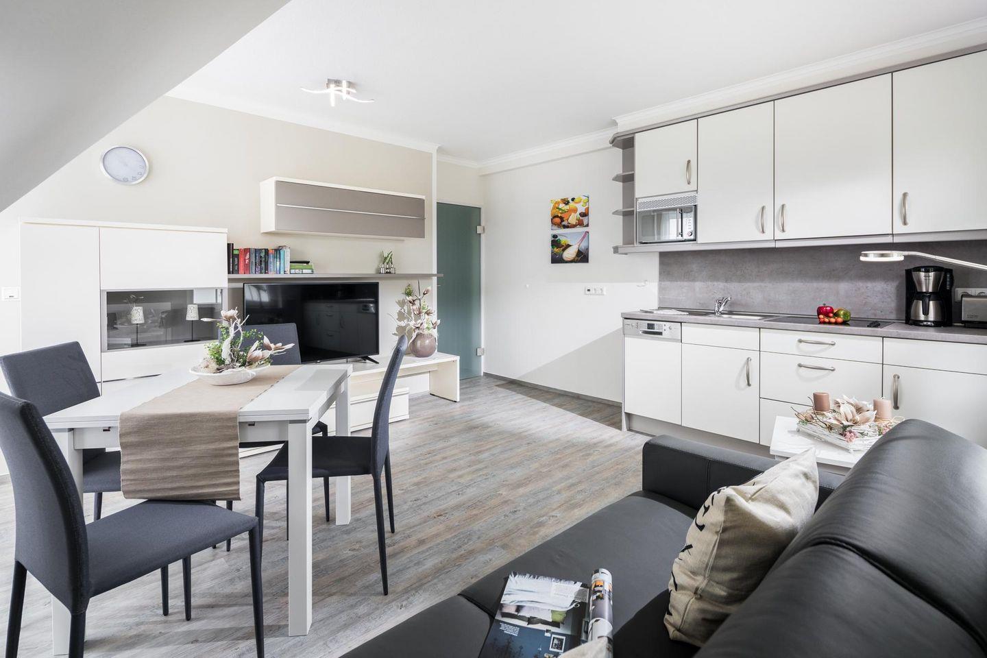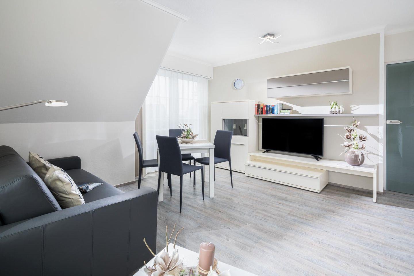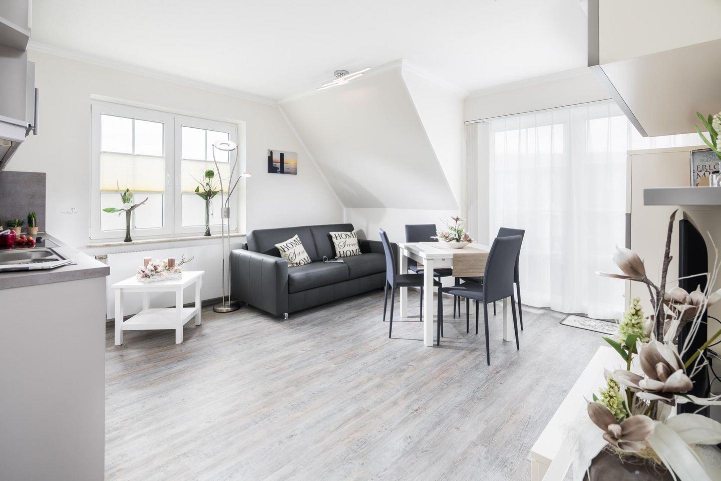 Die Ferienwohnung Kiebitz in Norderney bietet modernen Komfort nahe Weststrand und Inselkern mit Balkon und Parkplatz.