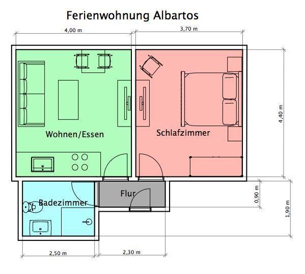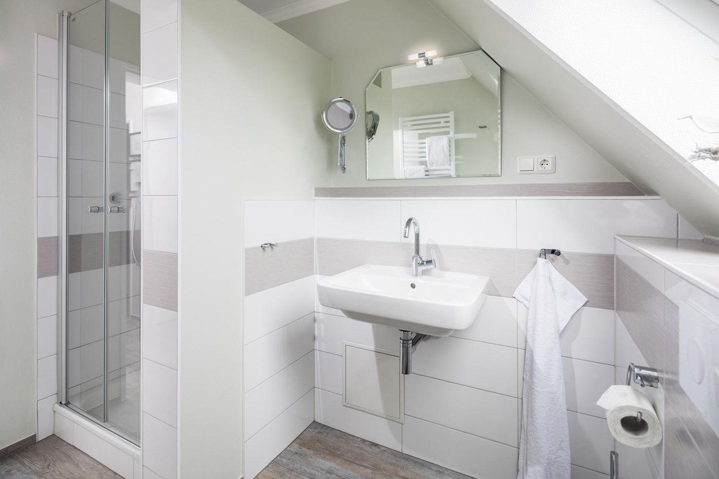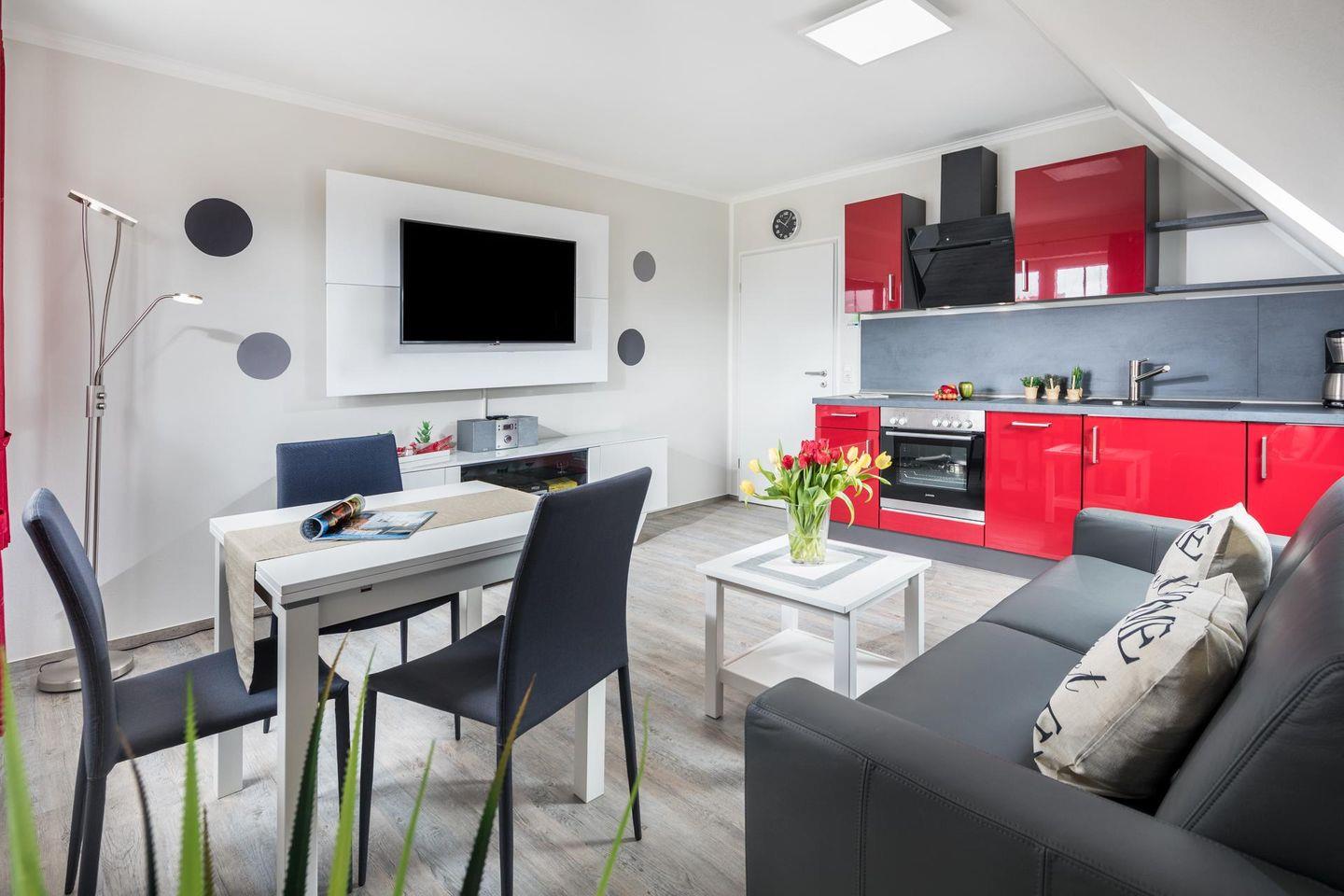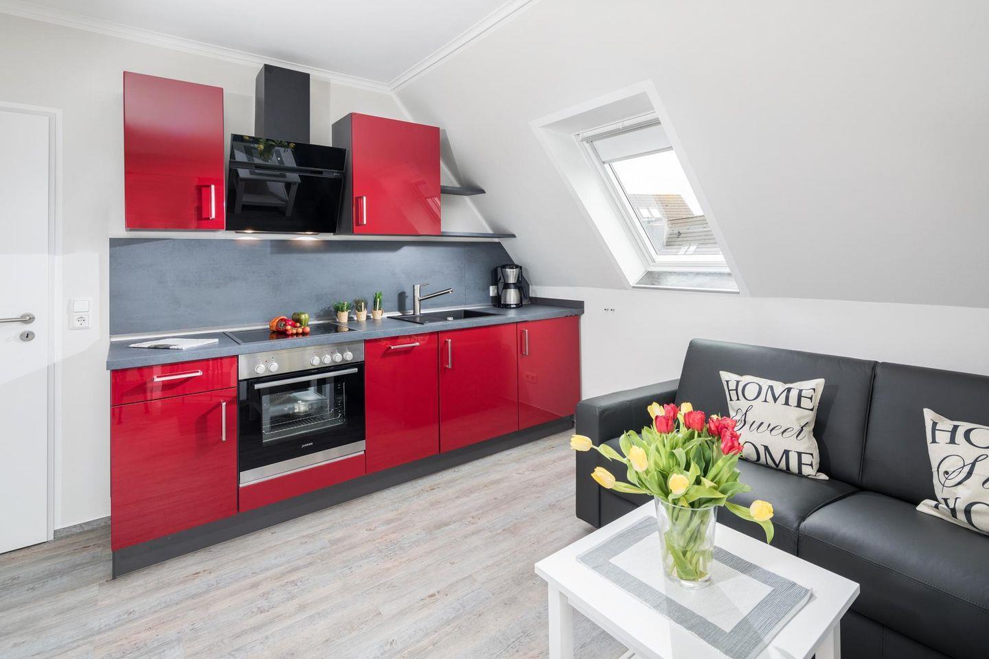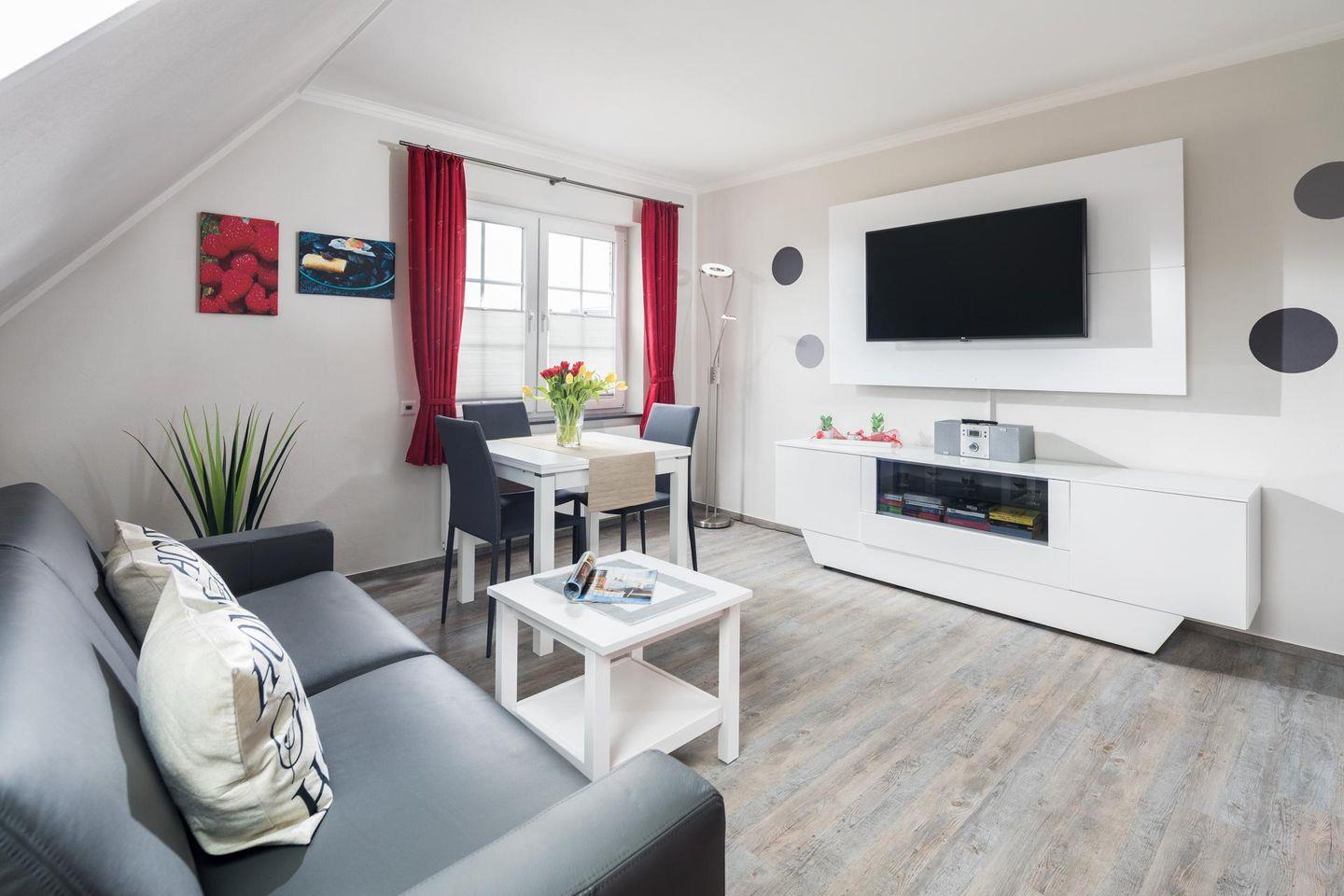 Die Wohnung liegt im ersten Obergeschoss des Hauses und besteht aus einem Schlafzimmer mit einem Doppelbett, einem Wohnzimmer mit einem Schlafsofa und einem integrierten Küchenbereich sowie einem Badezimmer, welches mit einer Dusche ausgestattet ist. Ein Babybett ist vorhanden und kann im Schlafzimmer aufgestellt werden, wenn dies gewünscht sein sollte. Die Einrichtung ist geprägt von ostfriesischem Flair und modernem Komfort. Die Wohnung wurde im Frühjahr 2017 umfassend renoviert.