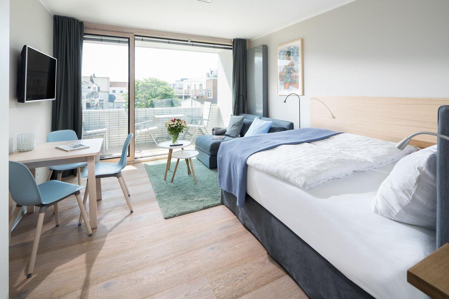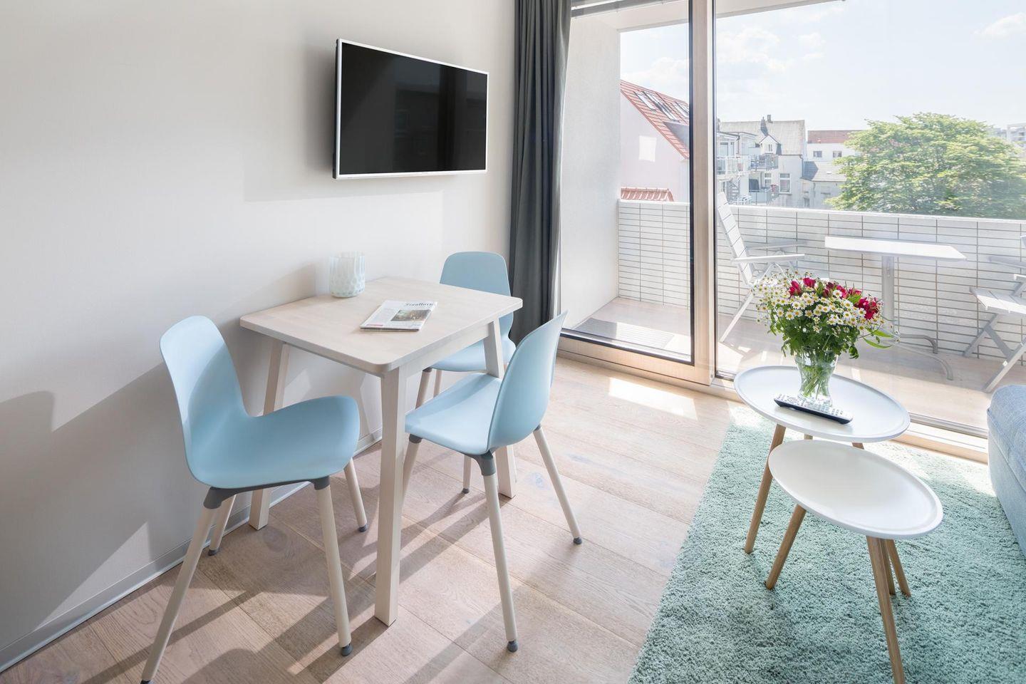 Helle 1-Zimmer-Ferienwohnung 'Kleines Glück' mit Balkon nahe Strand und zentraler Lage auf Norderney.