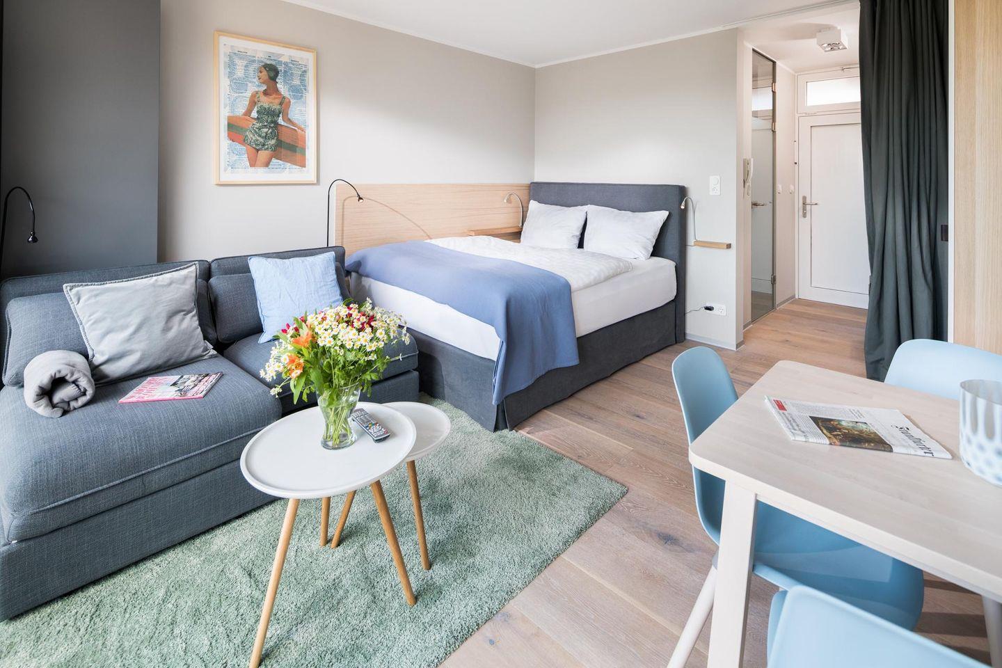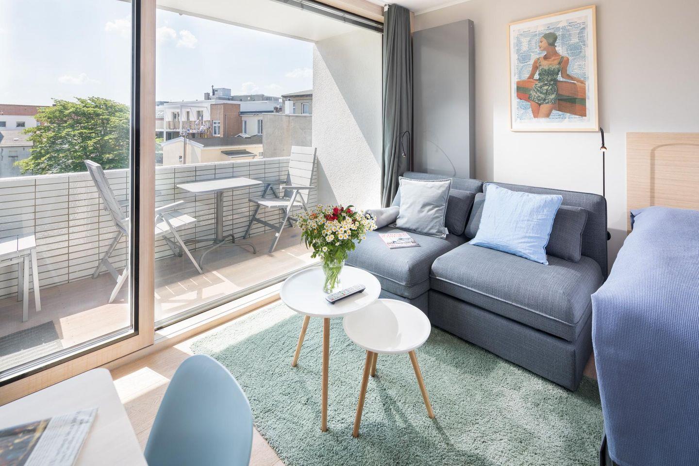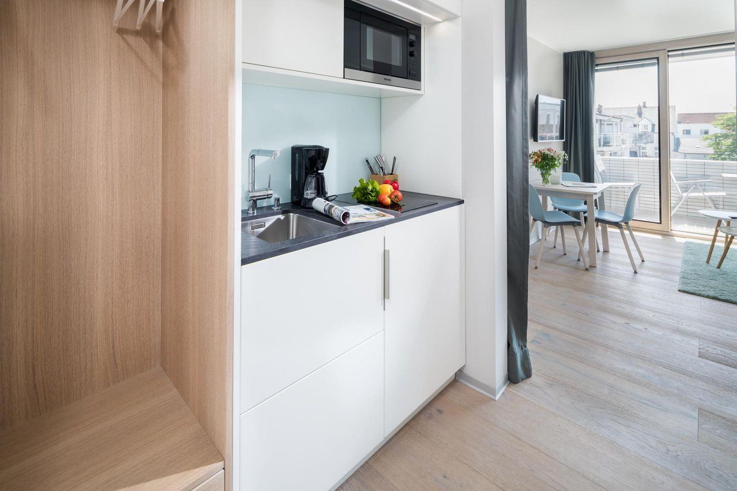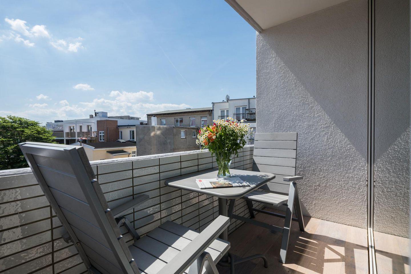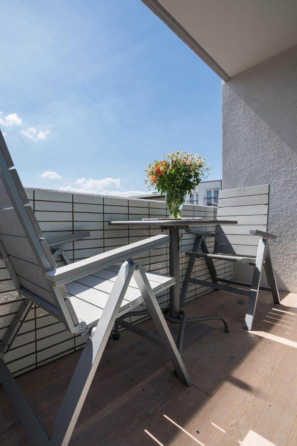 Das "Kleine Glück" ist eine helle, lichtdurchflutete 1-Raum-Wohnung, die durch ihr großes Panorama-Schiebefenster besticht. Die Wohnung wurde renoviert und mit hellen und natürlichen Farben eingerichtet. Der Boden ist mit schönen, massiven, weiß gebleichten Eichendielen ausgelegt. Der Wohn-Schlafraum ist mit einem Boxspringbett (1,60m x 2,00m) eingerichtet. Das moderne Badezimmer mit Dusche und WC ist funktional und modern gestaltet. Die maßgefertigte Küche ist gut ausgestattet. Ein Highlight der Wohnung "Kleines Glück" ist der 5,25 qm große Balkon, der nach Süd-Westen ausgerichtet ist. Haustiere sind hier nicht erlaubt.