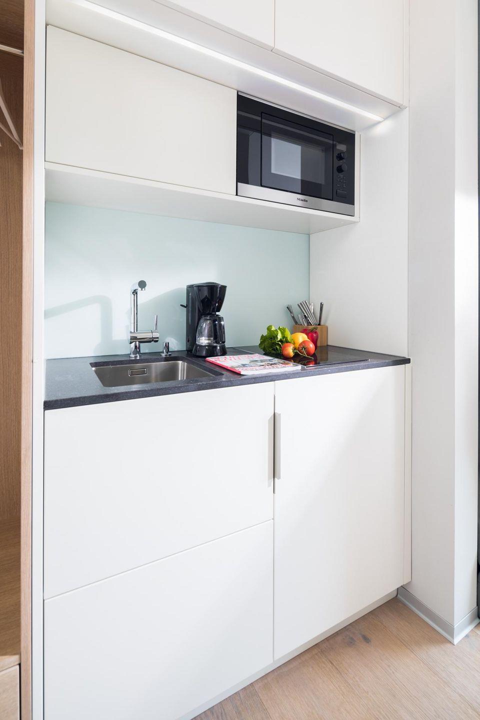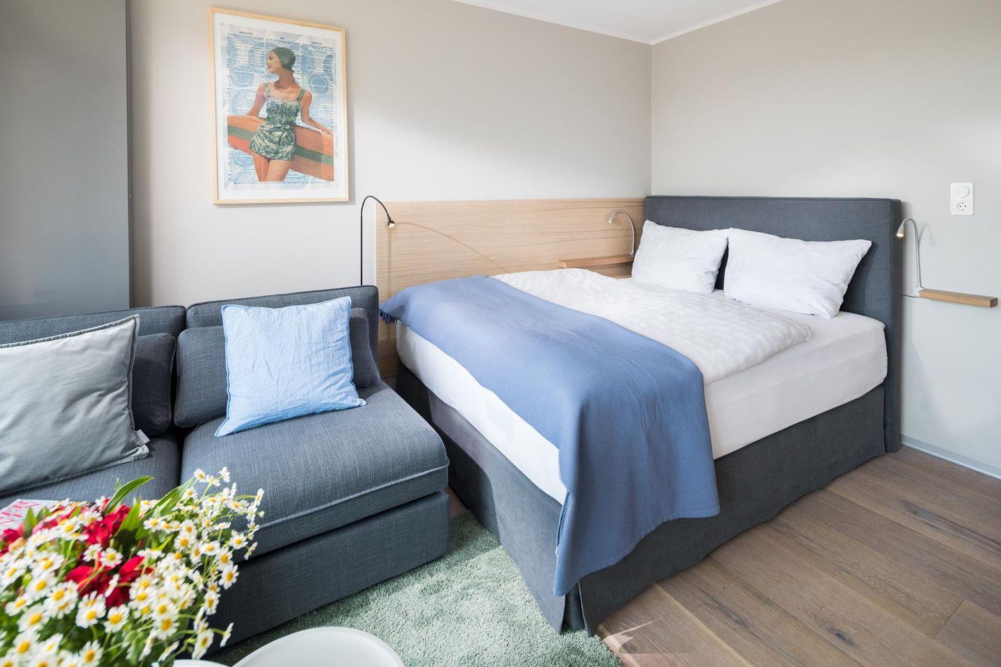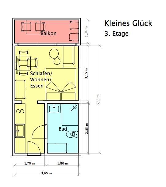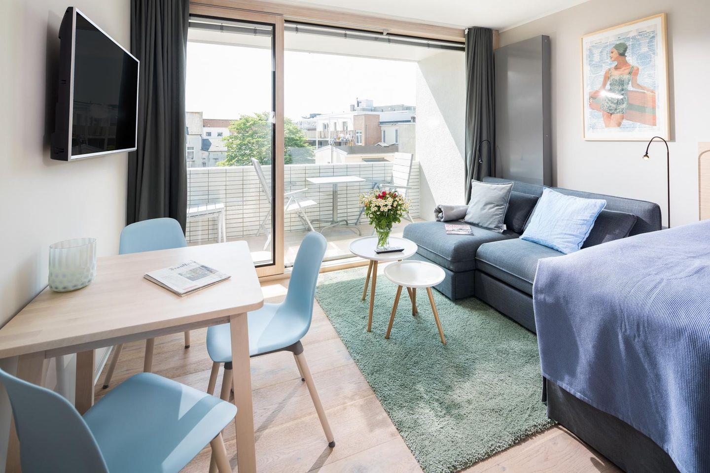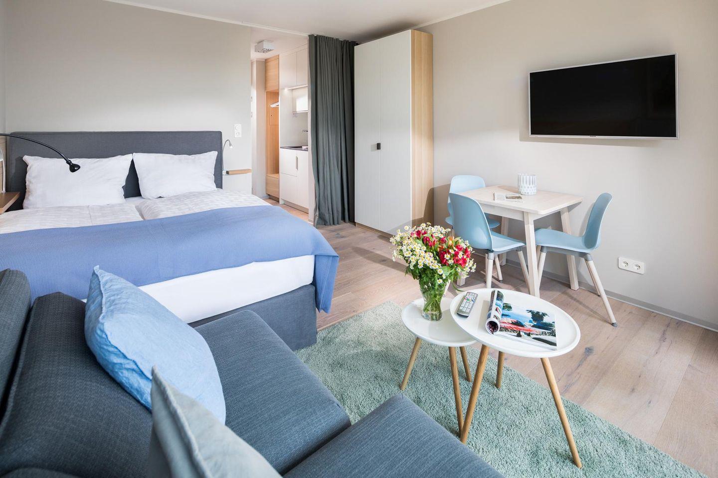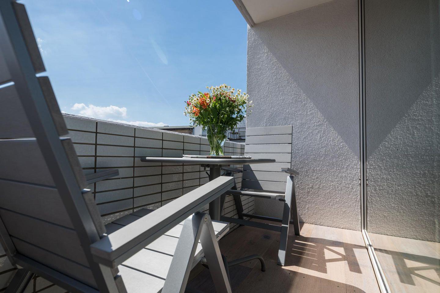 Das "Kleine Glück" ist eine helle, lichtdurchflutete 1-Raum-Wohnung, die durch ihr großes Panorama-Schiebefenster besticht. Die Wohnung wurde renoviert und mit hellen und natürlichen Farben eingerichtet. Der Boden ist mit schönen, massiven, weiß gebleichten Eichendielen ausgelegt. Der Wohn-Schlafraum ist mit einem Boxspringbett (1,60m x 2,00m) eingerichtet. Das moderne Badezimmer mit Dusche und WC ist funktional und modern gestaltet. Die maßgefertigte Küche ist gut ausgestattet. Ein Highlight der Wohnung "Kleines Glück" ist der 5,25 qm große Balkon, der nach Süd-Westen ausgerichtet ist. Haustiere sind hier nicht erlaubt.