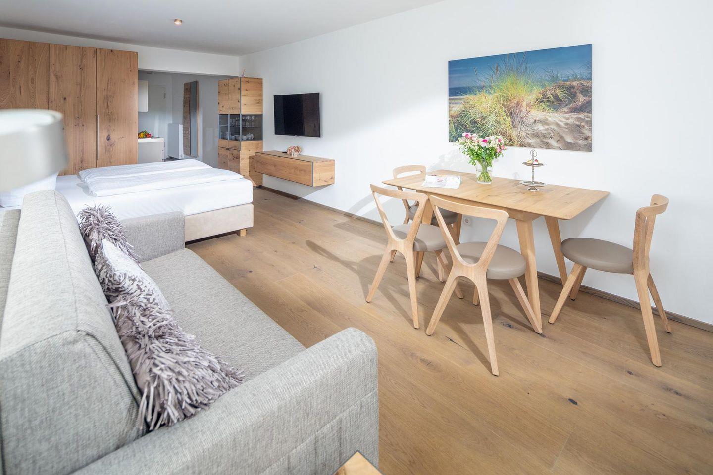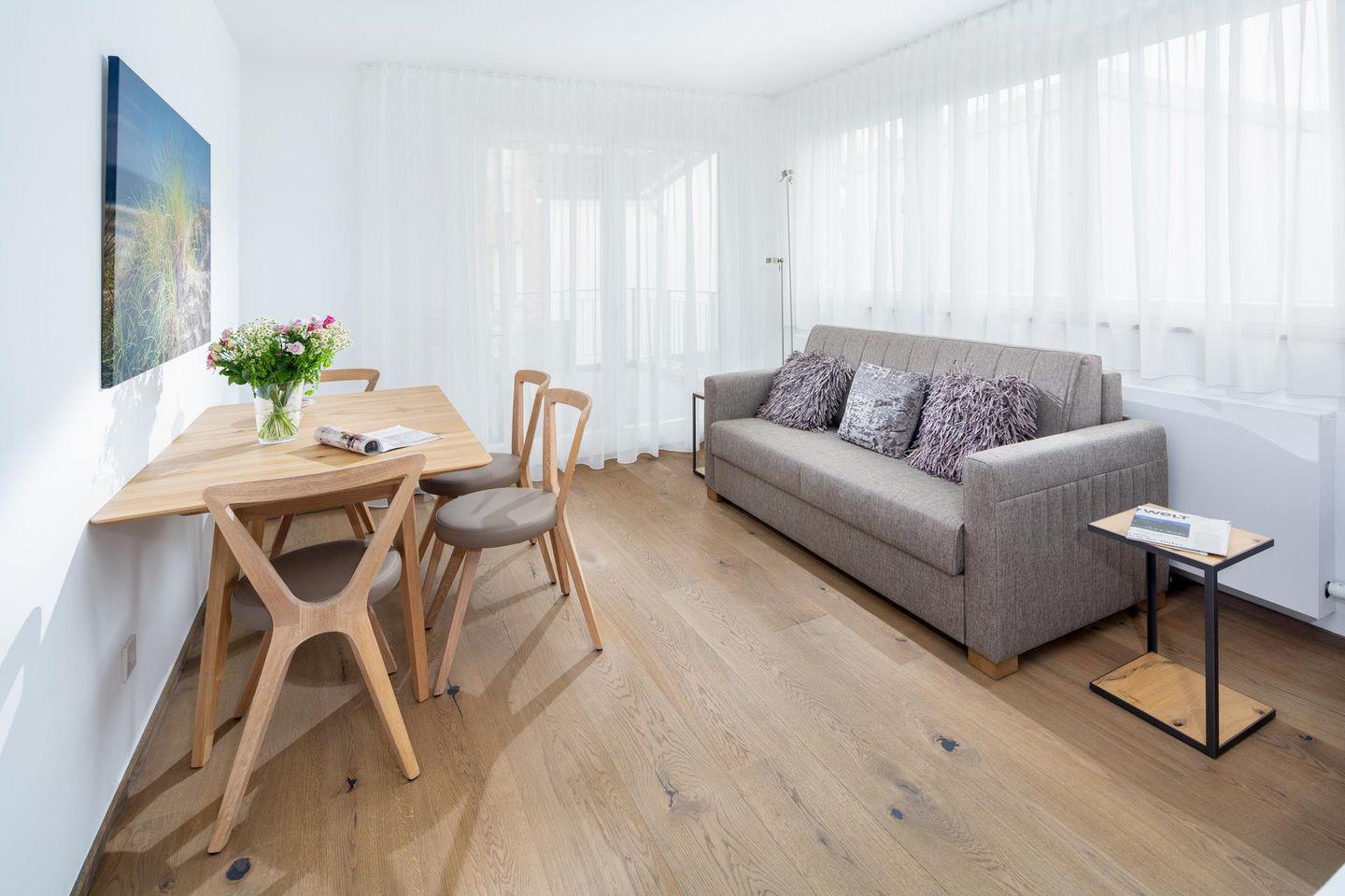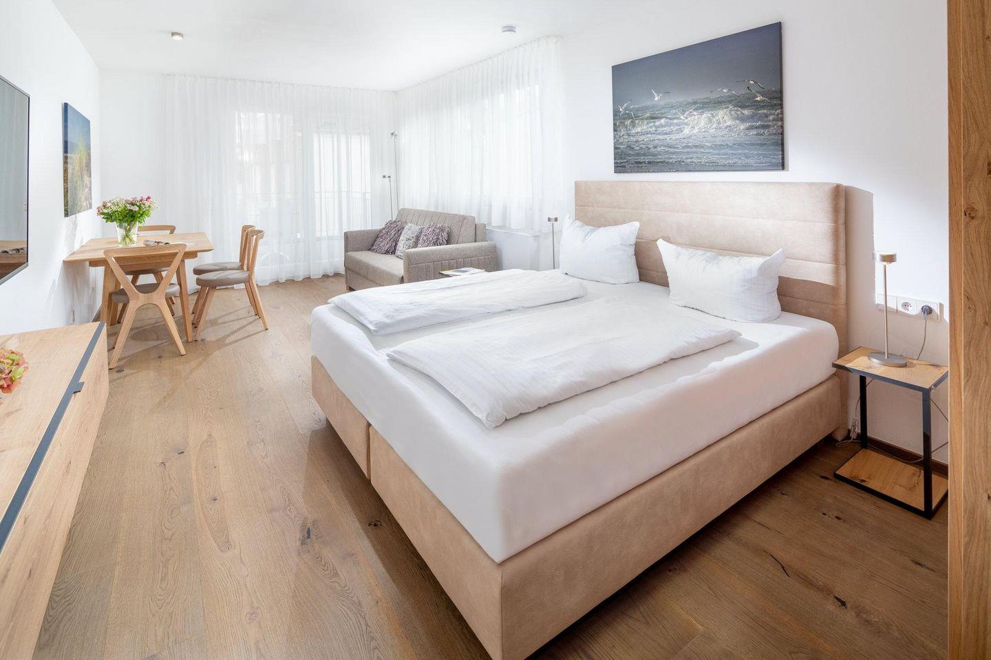 Das Wohn-Schlafzimmer wurde mit einem Boxspringbett (1,60m x 1,90m) und einer Schlafcouch, die als zusätzliche Schlafmöglichkeit genutzt werden kann, ausgestattet. Die kleine Küchenzeile verfügt über alle notwendigen Utensilien. Das Bad ist mit einer ebenerdigen Dusche ausgestattet. Der Balkon (ca. 6 qm) liegt nach Westen zum Innenhof und wurde mit einem Tisch und 4 Stühlen ausgestattet. In dieser Wohnung sind auch Hunde herzlich willkommen. Erlaubt ist maximal ein Hund (Höhe maximal kniehoch). Die Hundewiese befindet sich in der Nähe des Fährhafens (kein Leinenzwang). Die Wohnung hat kein WLAN.