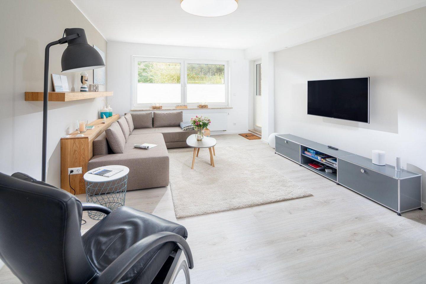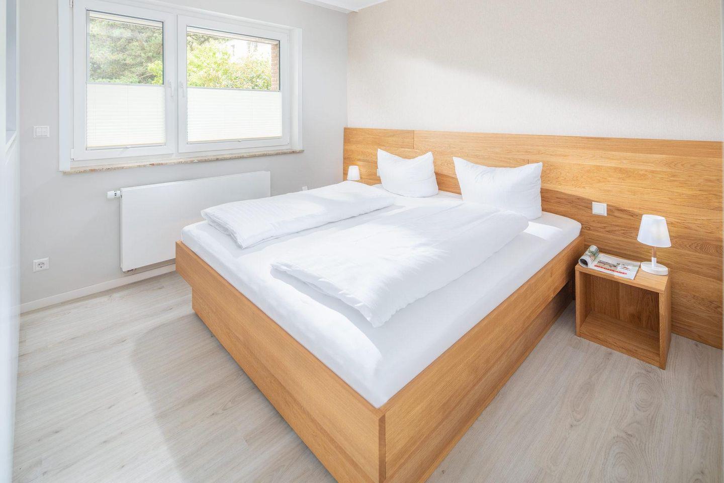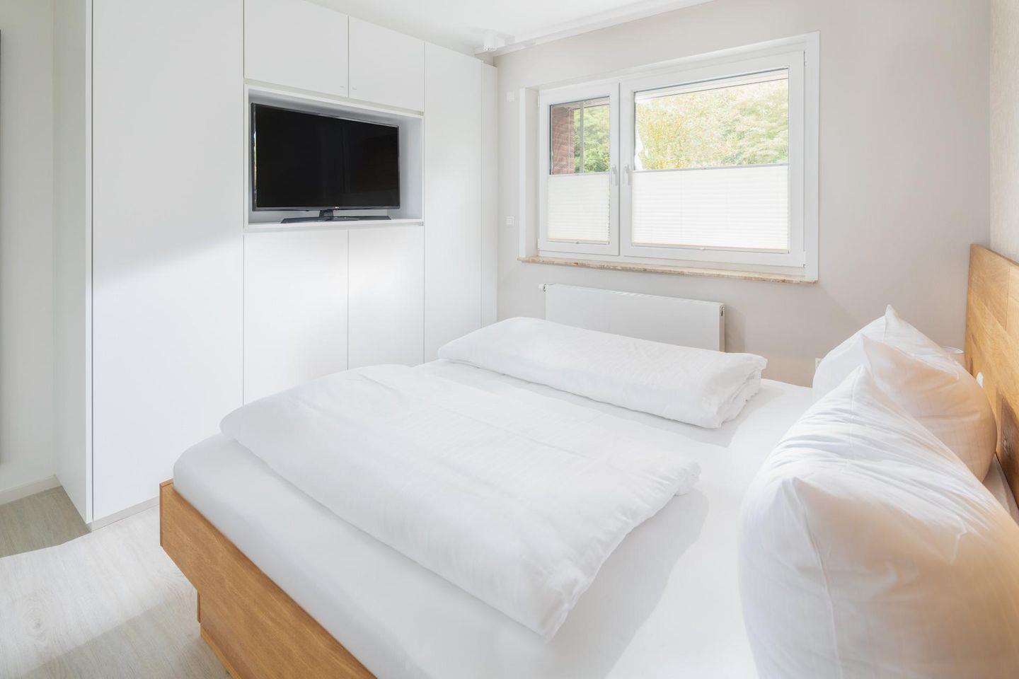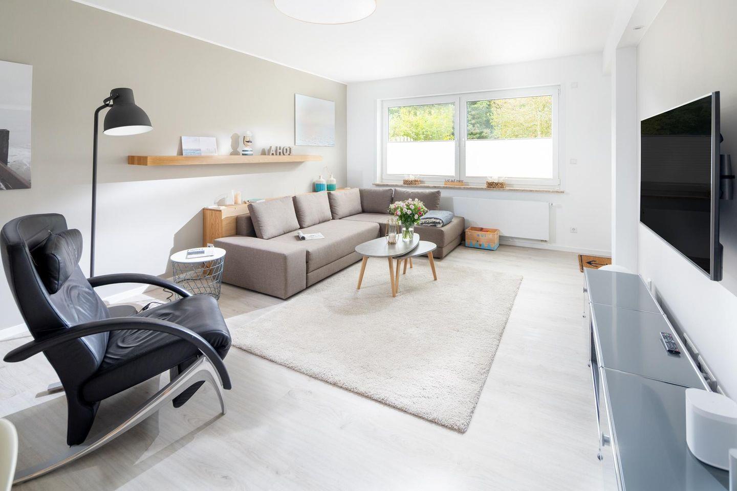 Bei der Innenausstattung der Wohnung wurde Wert auf eine moderne Einrichtung gelegt. Die beiden Schlafzimmer sind jeweils mit einem Doppelbett ausgestattet. Ein Schlafzimmer ist mit einem zusätzlichen WC und Handwaschbecken ausgestattet. Das Wohnzimmer verfügt über einen voll ausgestatteten Küchenbereich. Zudem sind auf allen TV-Geräten Netflix und eine Sonos-Box (für den Sound) verfügbar. Ein Bad mit Dusche und WC steht den Gästen ebenfalls zur Verfügung. Hier steht auch ein kombinierter Miele Wasch-/Trockner. Weiter verfügt die Wohnung über elektrische Rollos. Ein Highlight der Wohnung ist die Südterrasse mit ca. 35 Quadratmetern. An diese schließt sich ein Hausgarten von etwa 1000 Quadratmetern an. Haustiere sind hier nicht erlaubt.