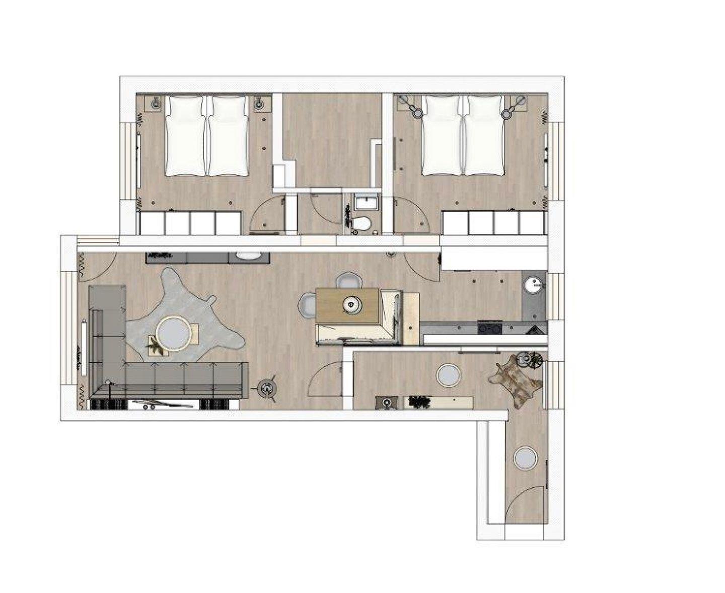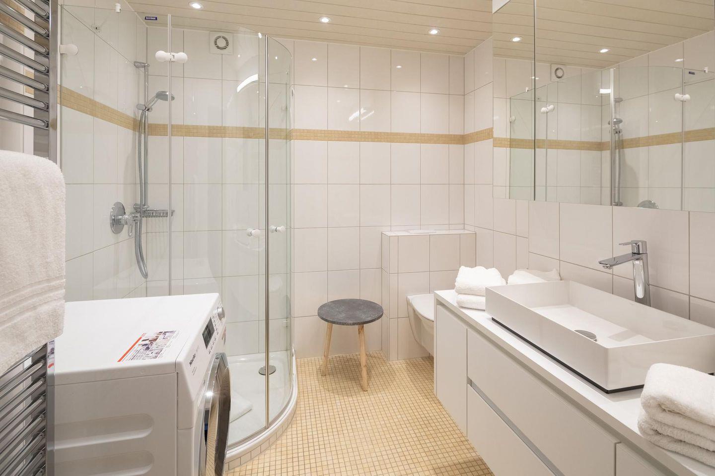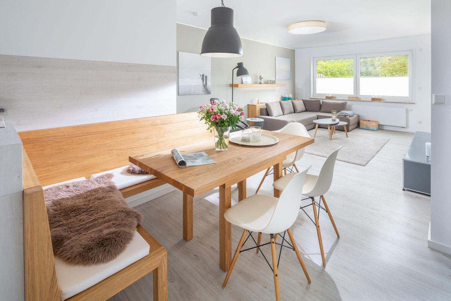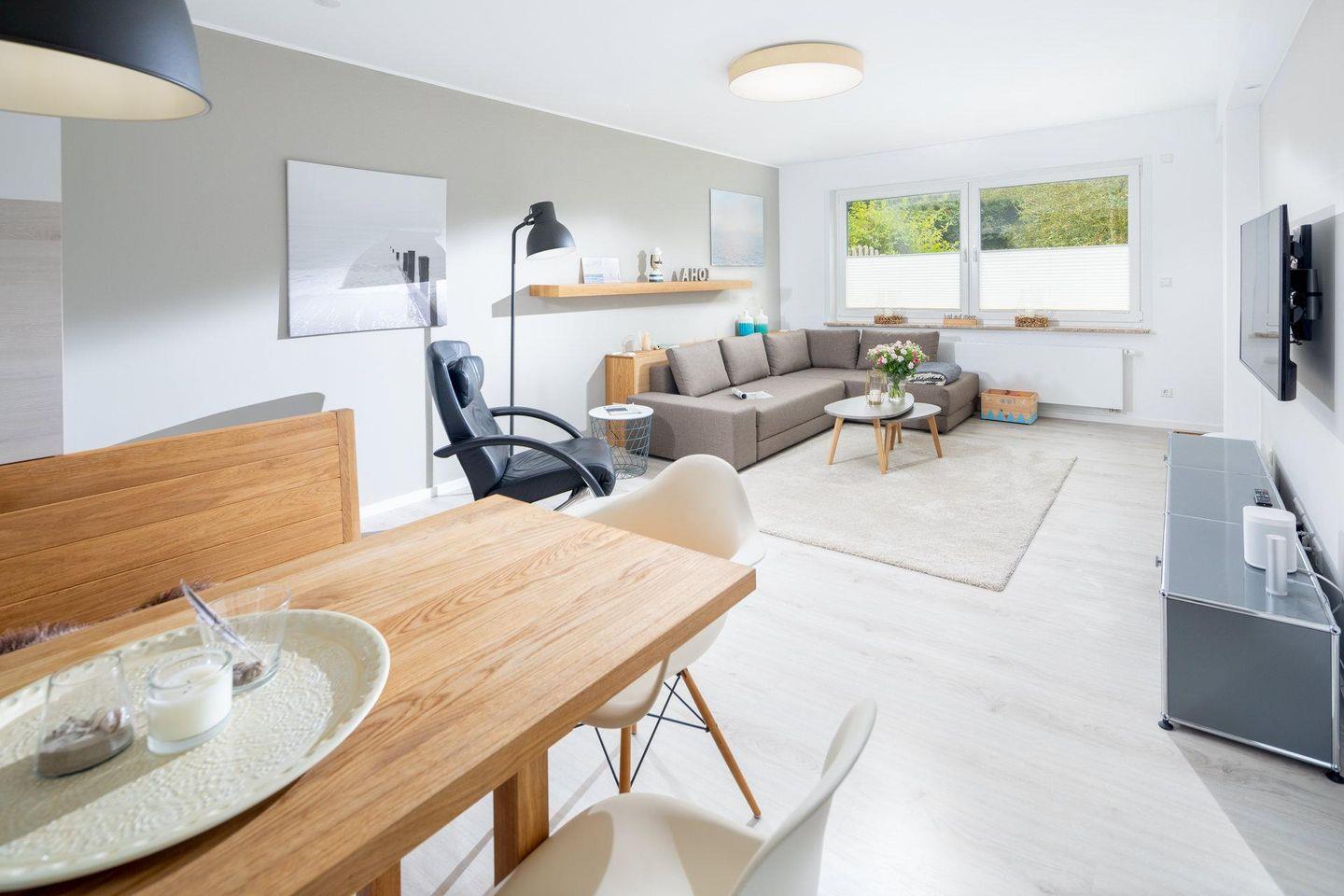 Bei der Innenausstattung der Wohnung wurde Wert auf eine moderne Einrichtung gelegt. Die beiden Schlafzimmer sind jeweils mit einem Doppelbett ausgestattet. Ein Schlafzimmer ist mit einem zusätzlichen WC und Handwaschbecken ausgestattet. Das Wohnzimmer verfügt über einen voll ausgestatteten Küchenbereich. Zudem sind auf allen TV-Geräten Netflix und eine Sonos-Box (für den Sound) verfügbar. Ein Bad mit Dusche und WC steht den Gästen ebenfalls zur Verfügung. Hier steht auch ein kombinierter Miele Wasch-/Trockner. Weiter verfügt die Wohnung über elektrische Rollos. Ein Highlight der Wohnung ist die Südterrasse mit ca. 35 Quadratmetern. An diese schließt sich ein Hausgarten von etwa 1000 Quadratmetern an. Haustiere sind hier nicht erlaubt.
