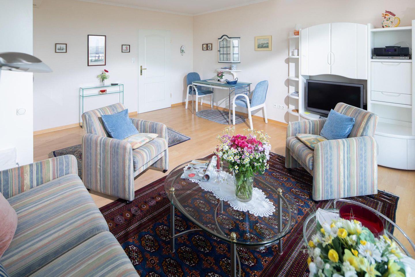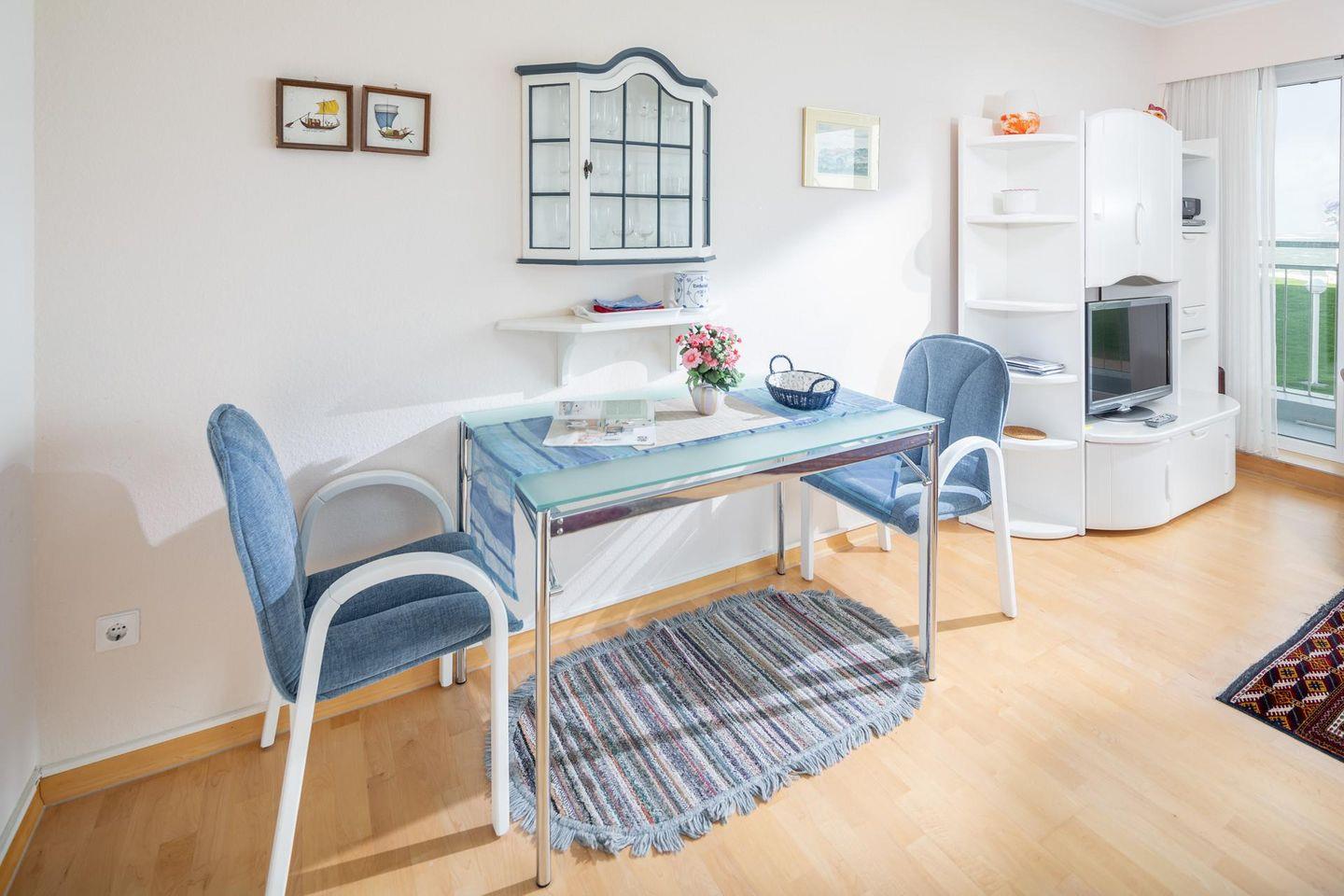 Das Wohn-/Schlafzimmer ist mit einem ausfahrbaren Doppelbett (Bettbreite 150 cm) und einer zusätzlichen Schlafcouch ausgestattet. Zudem gibt es einen Esstisch mit Stühlen. Im Flur der Wohnung befindet sich eine kleine Pantryküche. Sie ist mit allem Nötigen ausgestattet. Das Badezimmer der Wohnung ist mit einer Dusche, einem WC und einem Handwaschbecken ausgestattet. Im Apartmenthaus "Kaiserhof" stehen den Bewohnern eine Waschmaschine und ein Wäschetrockner (beide mit Münzeinwurf) zur Verfügung. Zusätzlich steht eine Sauna bereit, die ebenfalls gegen Münzeinwurf nutzbar ist. Es ist zu beachten, dass das Schwimmbad aufgrund eines technischen Defektes geschlossen ist. Fahrräder können vor dem Haus (Nordseite) oder im Fahrradraum abgestellt werden. Hunde sind in dieser Wohnung nicht erlaubt.