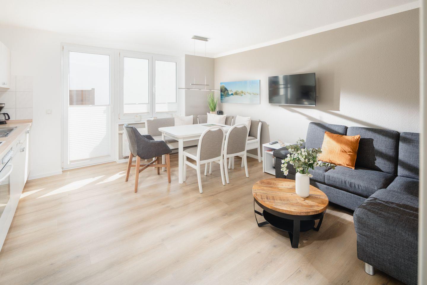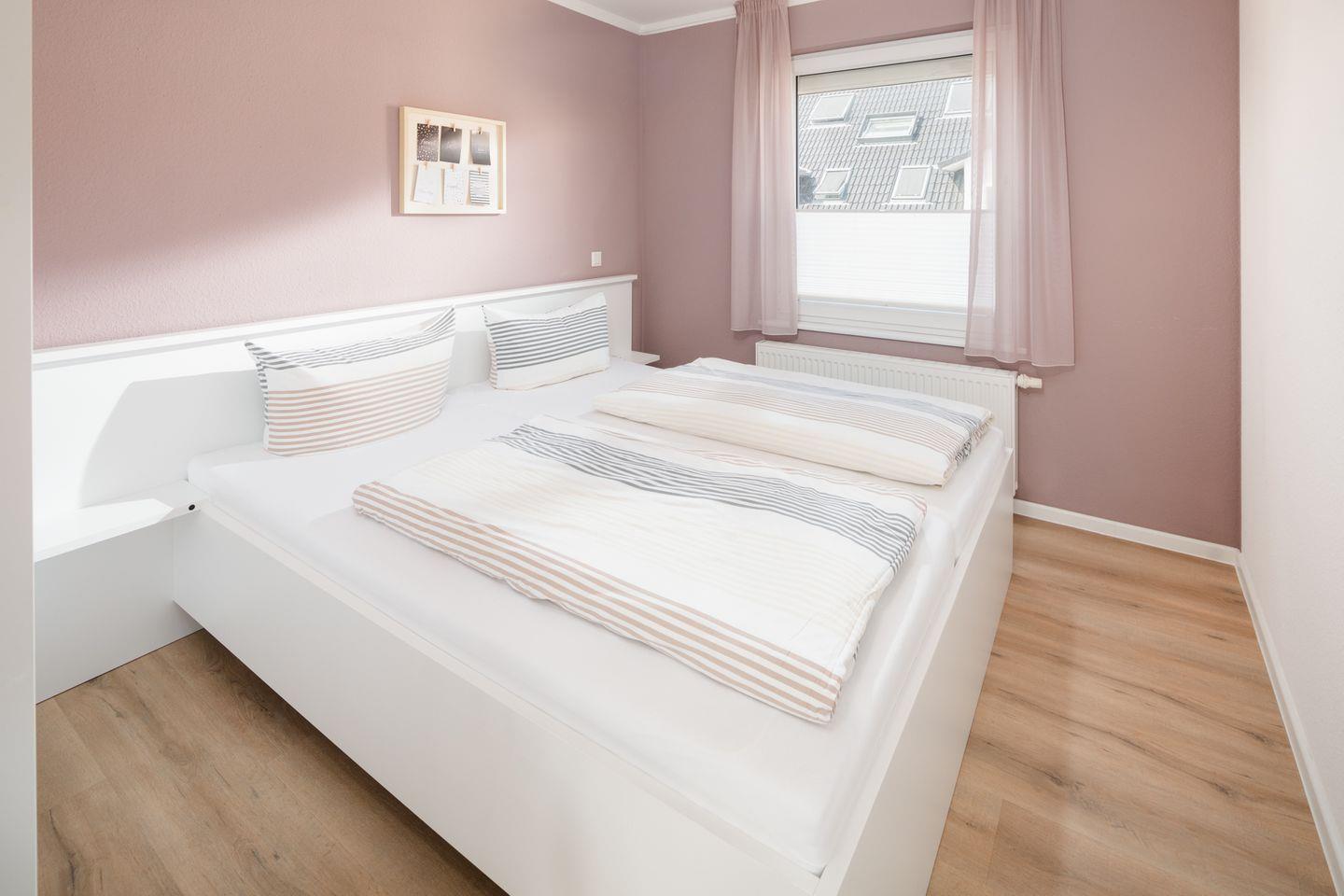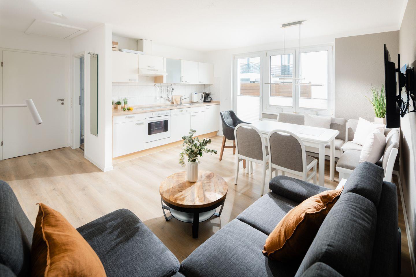 Die beiden Schlafzimmer sind mit Doppelbetten ausgestattet. Das Wohnzimmer mit integrierter Küchenzeile wurde hell und freundlich gestaltet und verfügt über einen Essbereich. Das Badezimmer wurde mit einer Dusche und einem Handtuchtrockner eingerichtet. Ein Highlight der Wohnung ist die Dachterrasse. Hunde sind in dieser Wohnung nicht erlaubt.