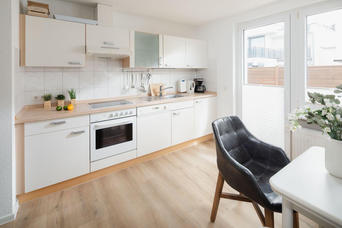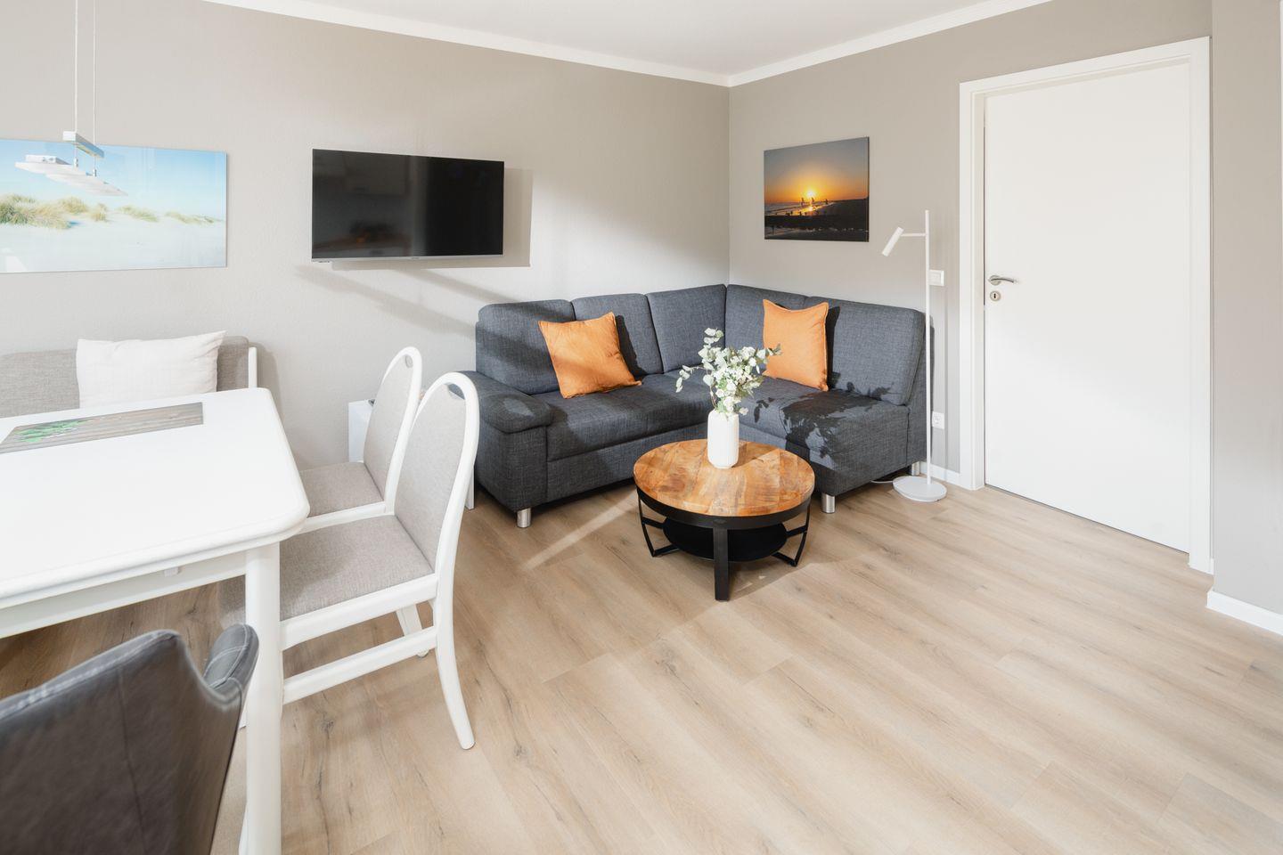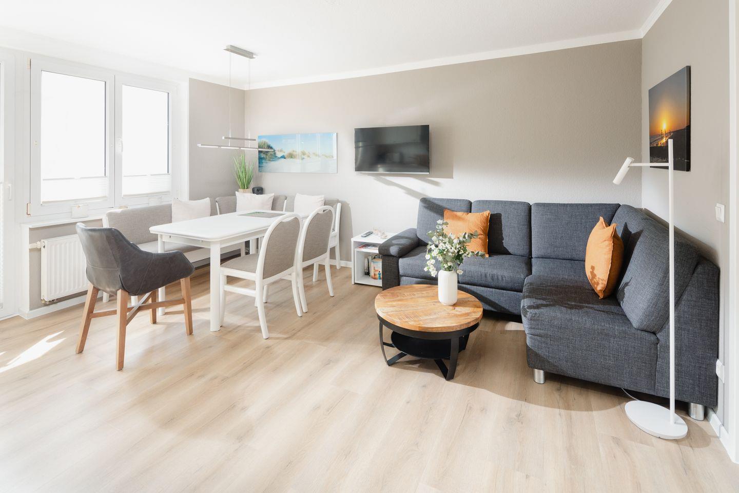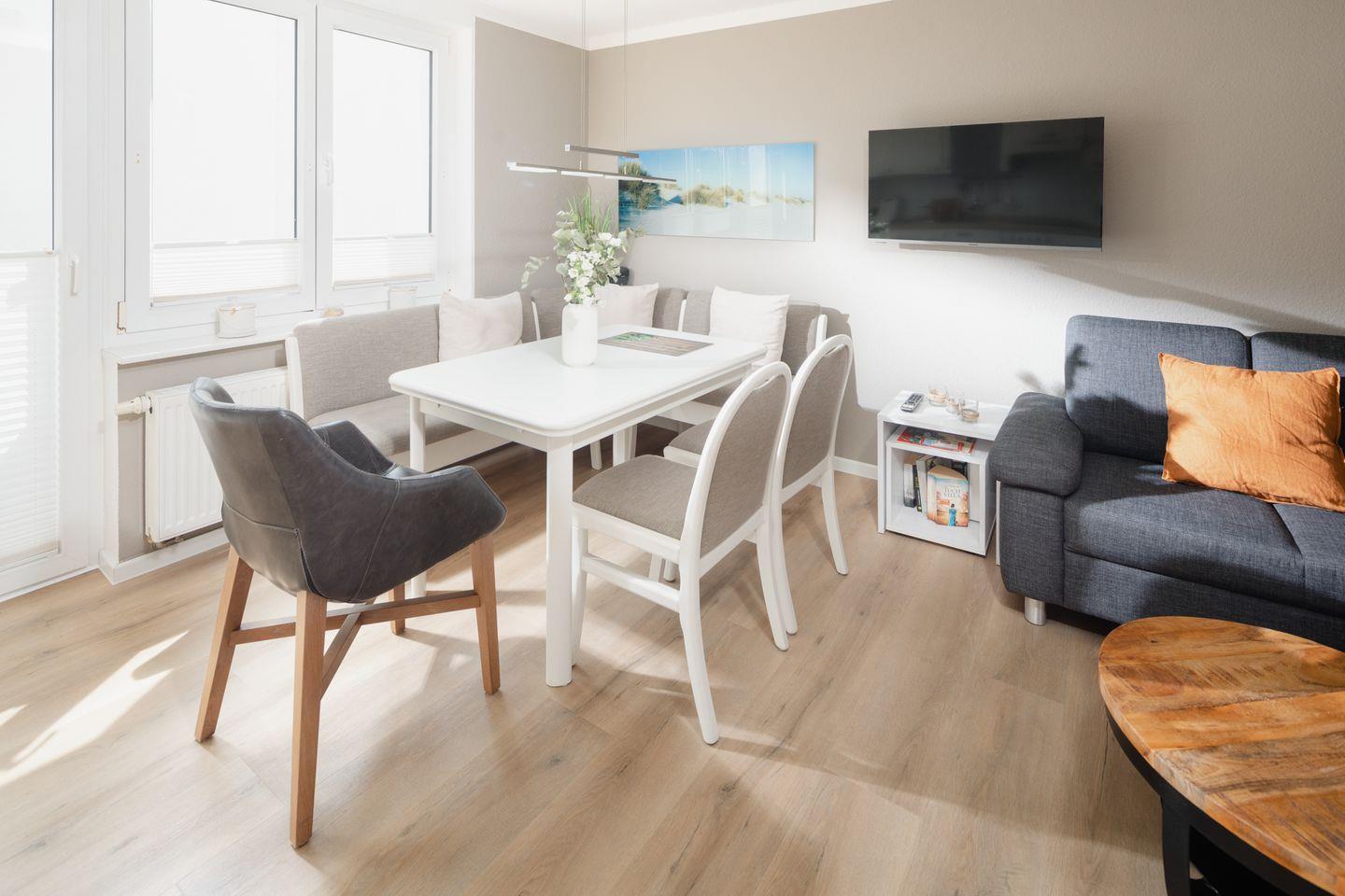 Die beiden Schlafzimmer sind mit Doppelbetten ausgestattet. Das Wohnzimmer mit integrierter Küchenzeile wurde hell und freundlich gestaltet und verfügt über einen Essbereich. Das Badezimmer wurde mit einer Dusche und einem Handtuchtrockner eingerichtet. Ein Highlight der Wohnung ist die Dachterrasse. Hunde sind in dieser Wohnung nicht erlaubt.