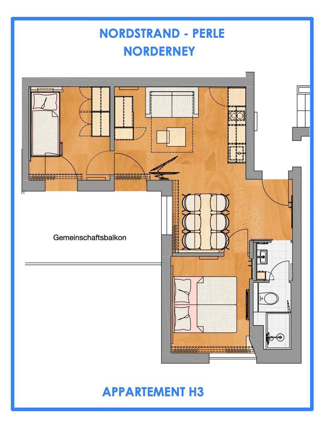 Modernes Apartment Nordstrandperle H3, direkt am Strand von Norderney, bietet Komfort und stilvolles Ambiente.