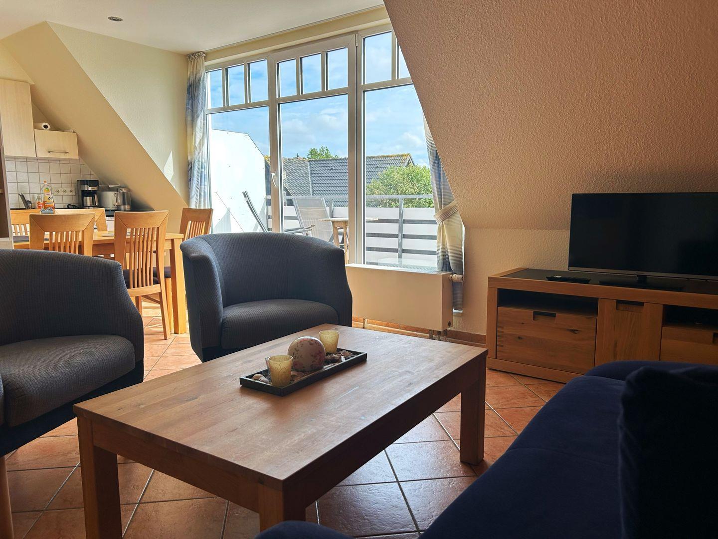 Großzügige 3-Raum-Ferienwohnung in ruhiger Dünenlage nahe Nordbadestrand mit Balkon und moderner Ausstattung.
