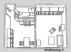 Das Appartement in der 2. Etage verfügt über einen Wohn-Schlafraum mit Doppelschrankbett (einzeln klappbar). Die separate Wohnküche hat eine Essecke. Zur weiteren Ausstattung gehören Dusche/WC und Kabel-TV (kein Telefon). NICHTRAUCHERWOHNUNG!!!