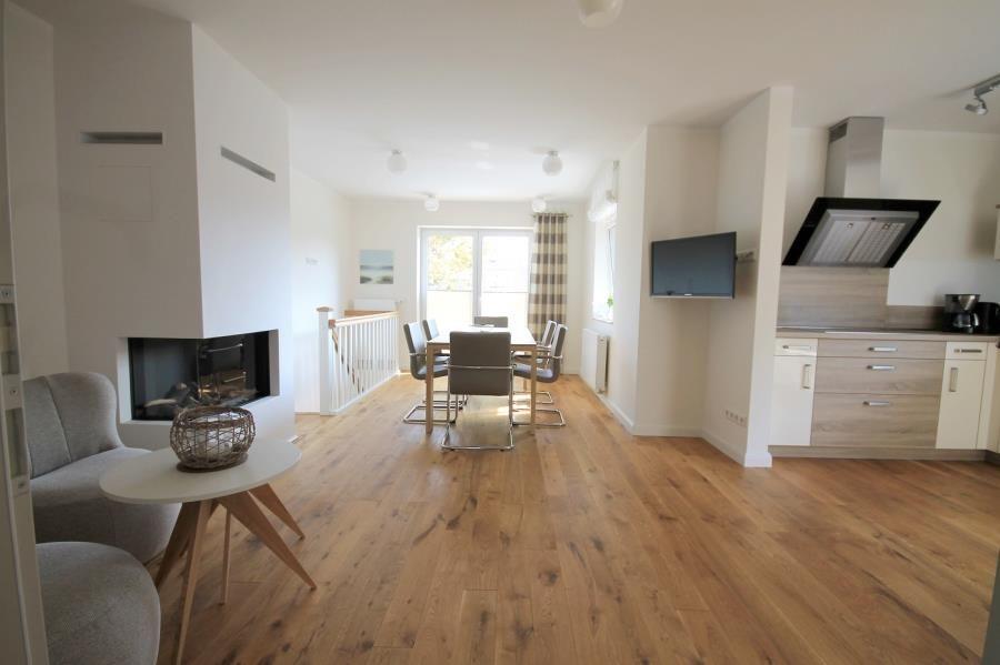 Exklusive, große Ferienwohnung über zwei Etagen. Im Erdgeschoss befindet sich eine Küche mit Essplatz, Kamin, TV und Zugang zum Balkon. Ein Schlafzimmer mit Doppelbett und TV sowie ein Bad mit Dusche/ WC sind vorhanden. Im Untergeschoss befindet sich ein Wohnraum (TV) mit direktem Zugang zur Terrasse sowie zwei Schlafzimmer mit jeweils einem Doppelbett und TV . Dusche/ WC. Das Ferienhaus besticht durch seine idyllische Dünenlage! Ein Parkplatz ist inklusive (Nr.1).