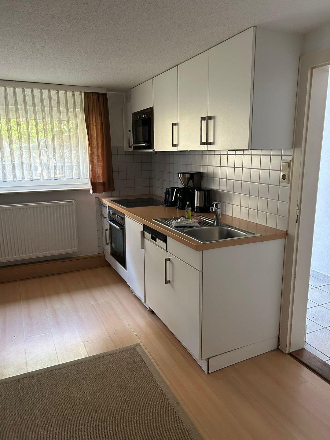 Etagenbett, Wohnraum mit Küchenzeile (4-Platten-Herd, Backofen, Mikrowelle), Kabel-TV, Diele und Dusche/WC mit Waschmaschine. Ein wohnungseigener Parkplatz ist vorhanden. Die Deckenhöhe beträgt ca. 2m. Gemeinschaftliche Gartennutzung.