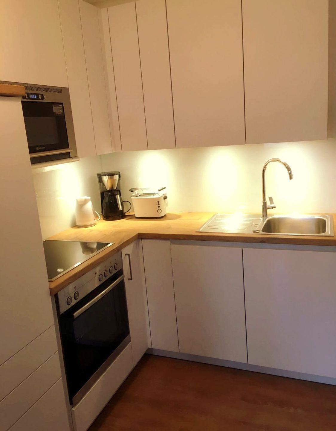 Die 3-Raum-Wohnung im 1. Obergeschoss besteht aus einem Wohnraum, einem Schlafzimmer mit Doppelbett einem Schlafzimmer mit zwei Einzelbetten, einer separaten Küche mit Essecke (Spülmaschine, Backofen, 4-Platten-Herd), einem