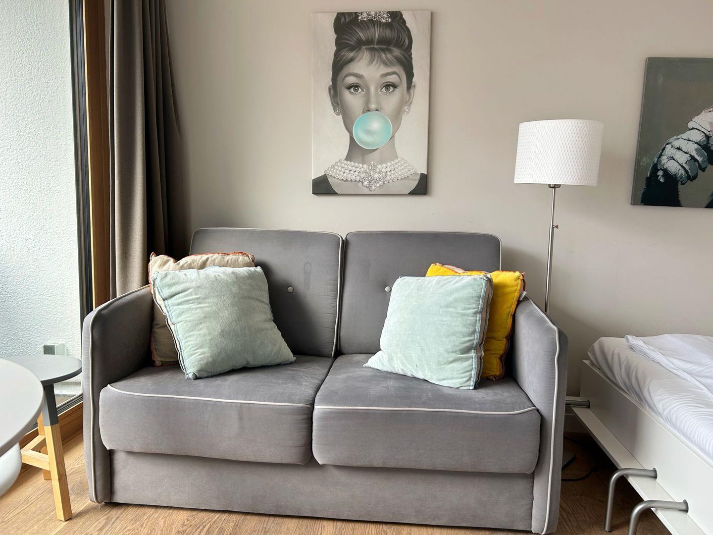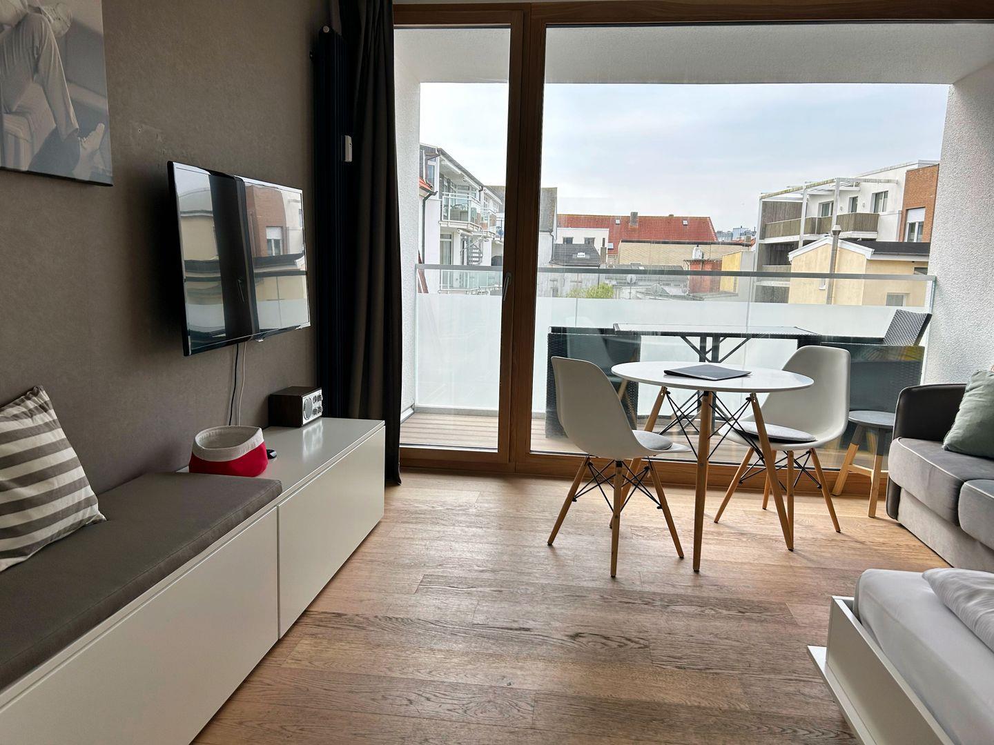 Das Design-Apartment in der 2. Etage bietet einen Wohn-/Schlafraum mit einem praktischen Doppelschrankbett, einer komfortablen Sofa, einem großen Fernseher sowie einem Esstisch mit Stühlen. Vom Wohnzimmer aus haben Sie Zugang zum Süd-Balkon mit einem großen Balkontisch mit gemütlichen Stühlen, ideal für entspannte Stunden im Freien.