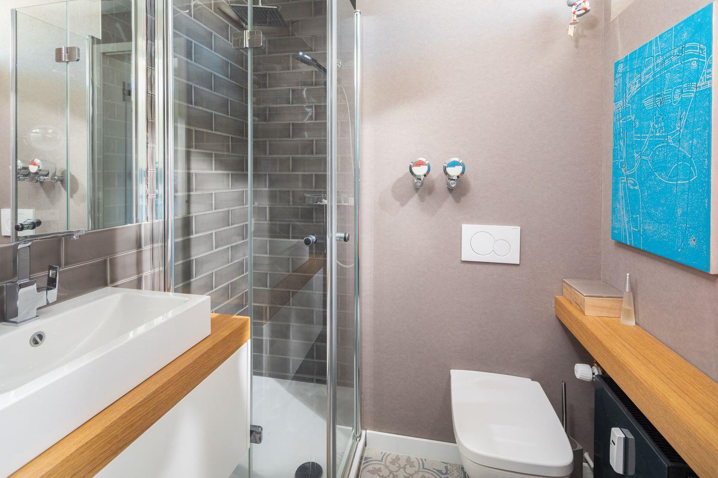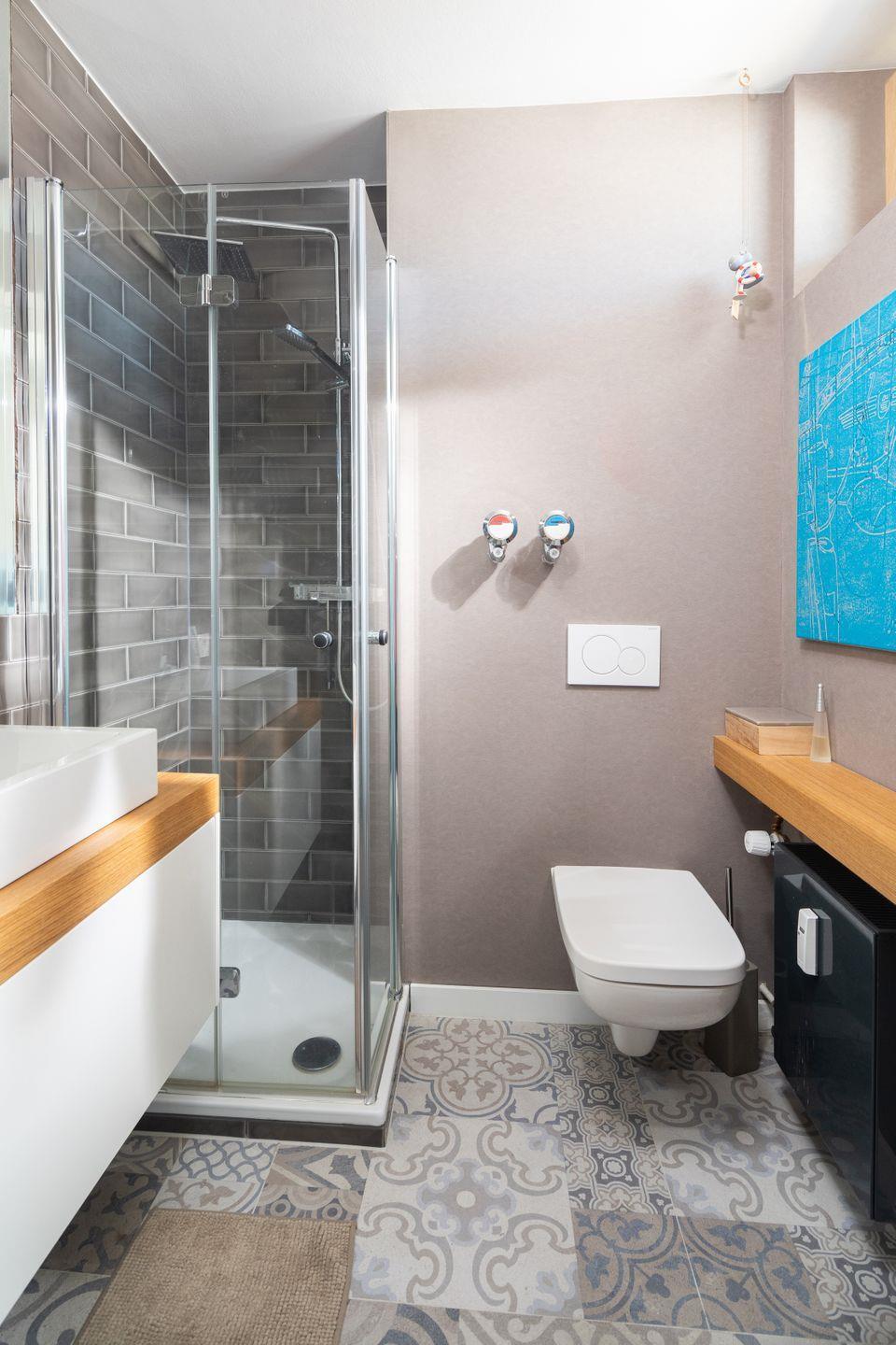 Das moderne Badezimmer ist mit einer Dusche, WC und Waschbecken ausgestattet.