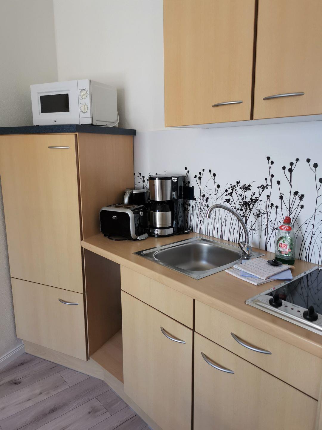 Die 1-Raum-Wohnung besteht aus einem Wohn-/Schlafraum mit Schlafsofa, einer kleinen Küche (2-Platten-Ceranfeld, Mikrowelle, kein Gefrierfach) mit Sitz- und Essgelegenheit sowie einem Duschbad mit WC. WLAN kostenfrei vorhanden.