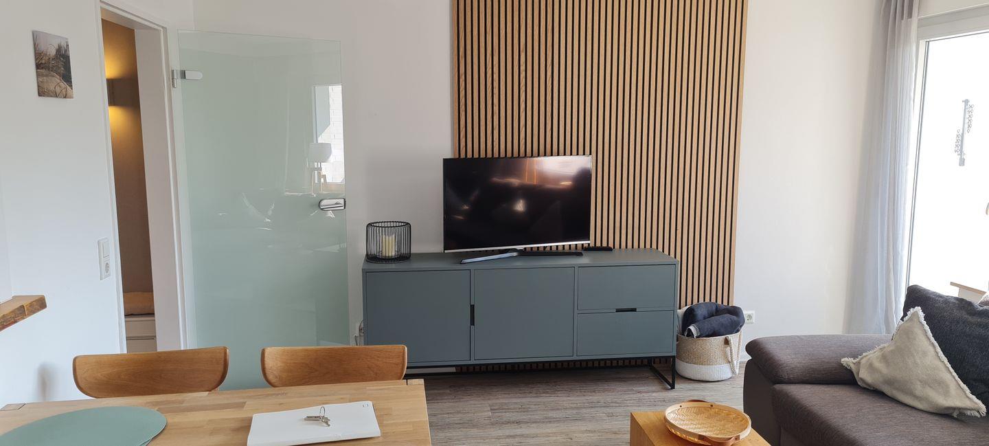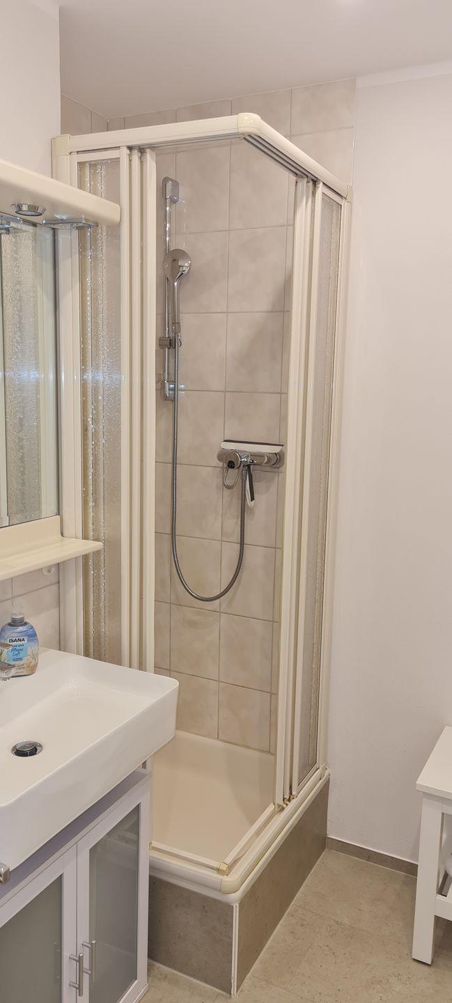 Das 2-Raum-Appartement im 1. OG (DG) besteht aus einem separaten Schlafzimmer mit Doppelbett (TV), einem Wohnzimmer mit Sofa und TV, einer neuen Küchenzeile, einem Duschbad mit WC, Flur sowie zwei Südbalkonen, die jeweils vom Wohn- und Schlafzimmer abgehen. Schlafzimmer, Wohnzimmer und Flur. Ein Schwimmbad im Haus ist kostenlos nutzbar, die Duschen und Umkleiden wurden erst kürzlich saniert.