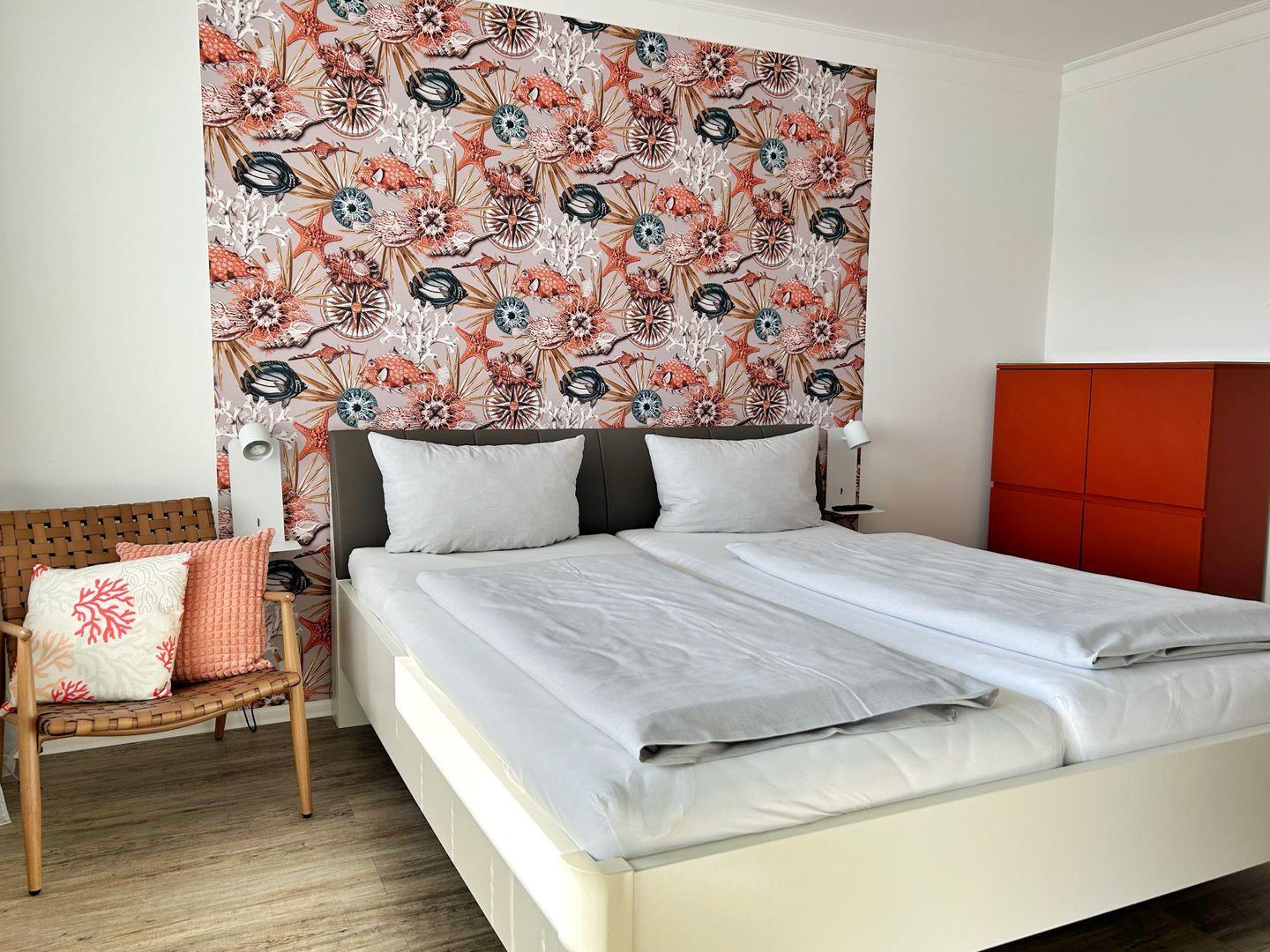Das 2-Raum-Appartement im 1. OG (DG) besteht aus einem separaten Schlafzimmer mit Doppelbett (TV), einem Wohnzimmer mit Sofa und TV, einer neuen Küchenzeile, einem Duschbad mit WC, Flur sowie zwei Südbalkonen, die jeweils vom Wohn- und Schlafzimmer abgehen. Schlafzimmer, Wohnzimmer und Flur. Ein Schwimmbad im Haus ist kostenlos nutzbar, die Duschen und Umkleiden wurden erst kürzlich saniert. Auch eine Sauna befindet sich im Haus und kann gegen Gebühr (Münzeinwurf) von den Gästen des Hauses genutzt werden. Im Ruheraum können Sie nach dem Schwimmen oder Saunieren pausieren.