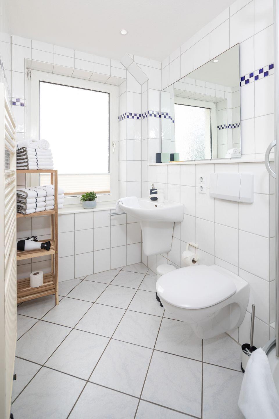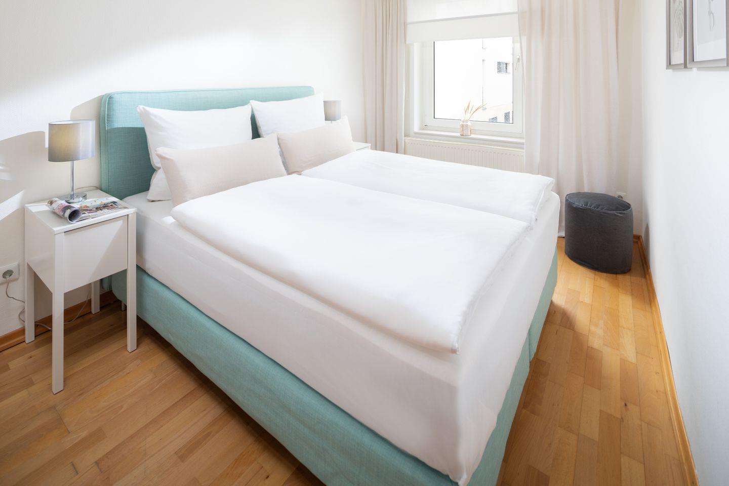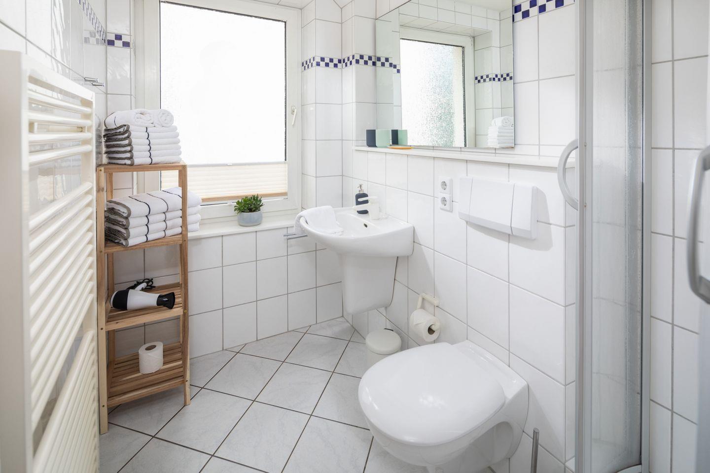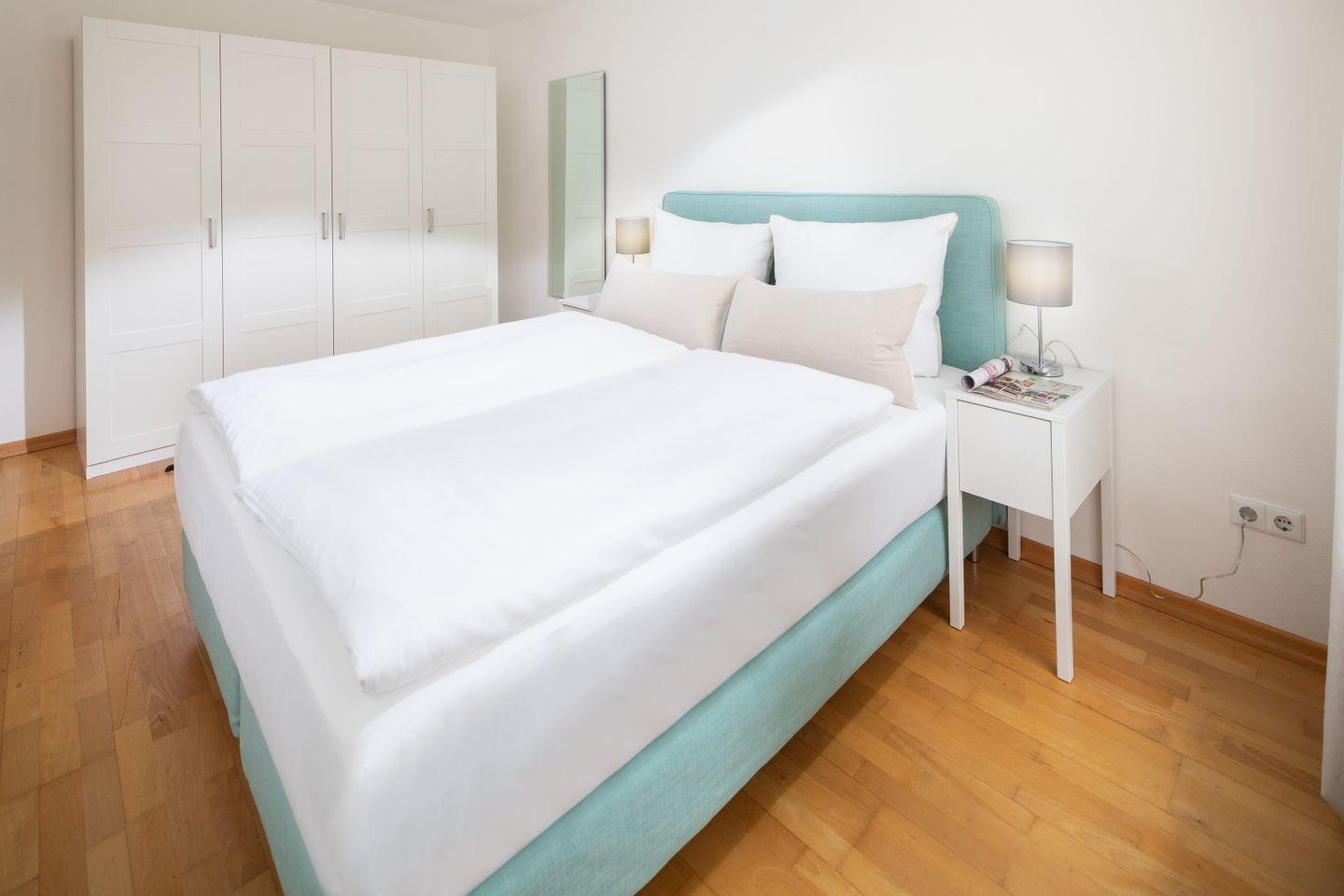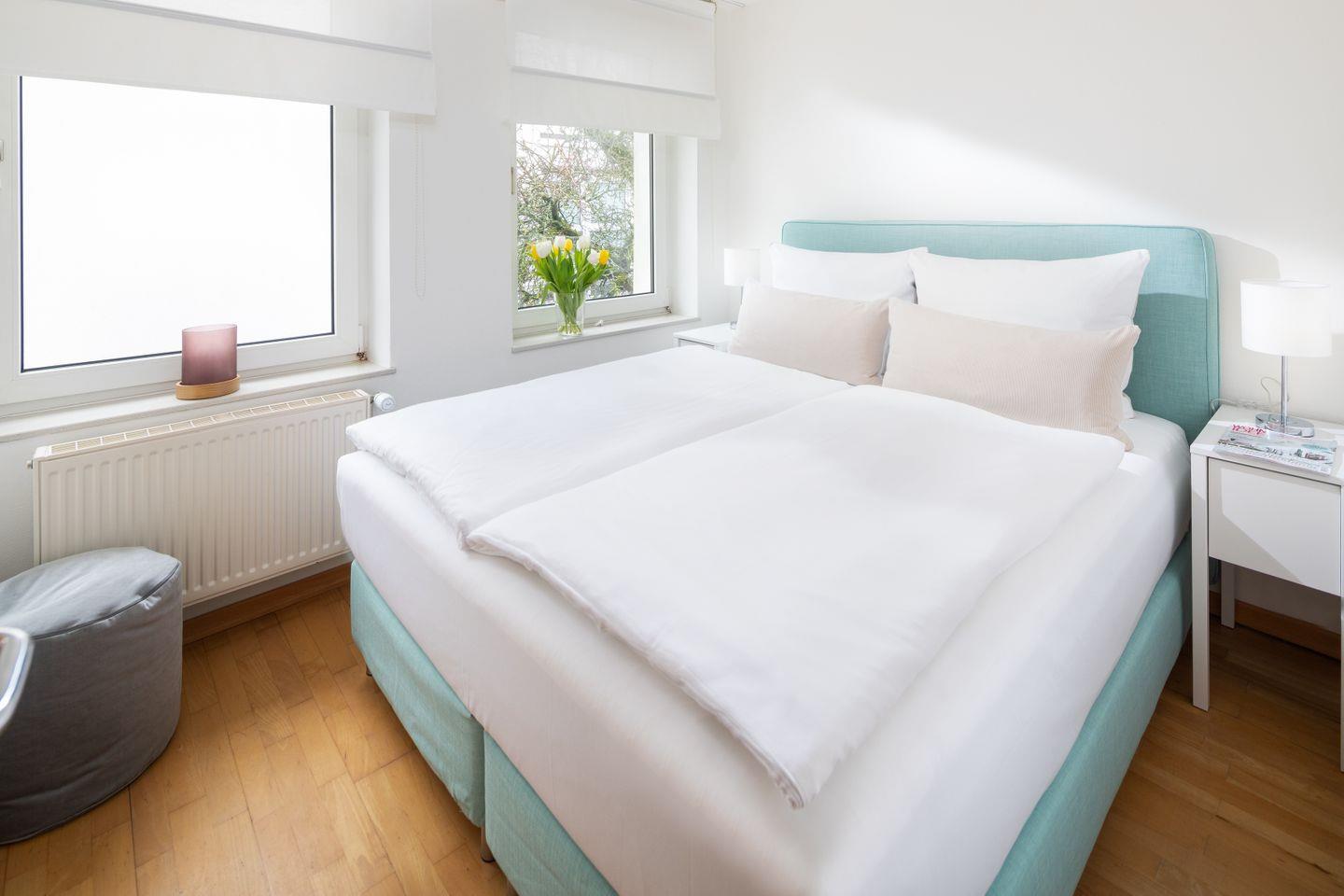 Im Dachgeschoss befinden sich die zwei separaten Schlafzimmer mit je einem Boxspringbett und ein Badezimmer mit Dusche und WC.