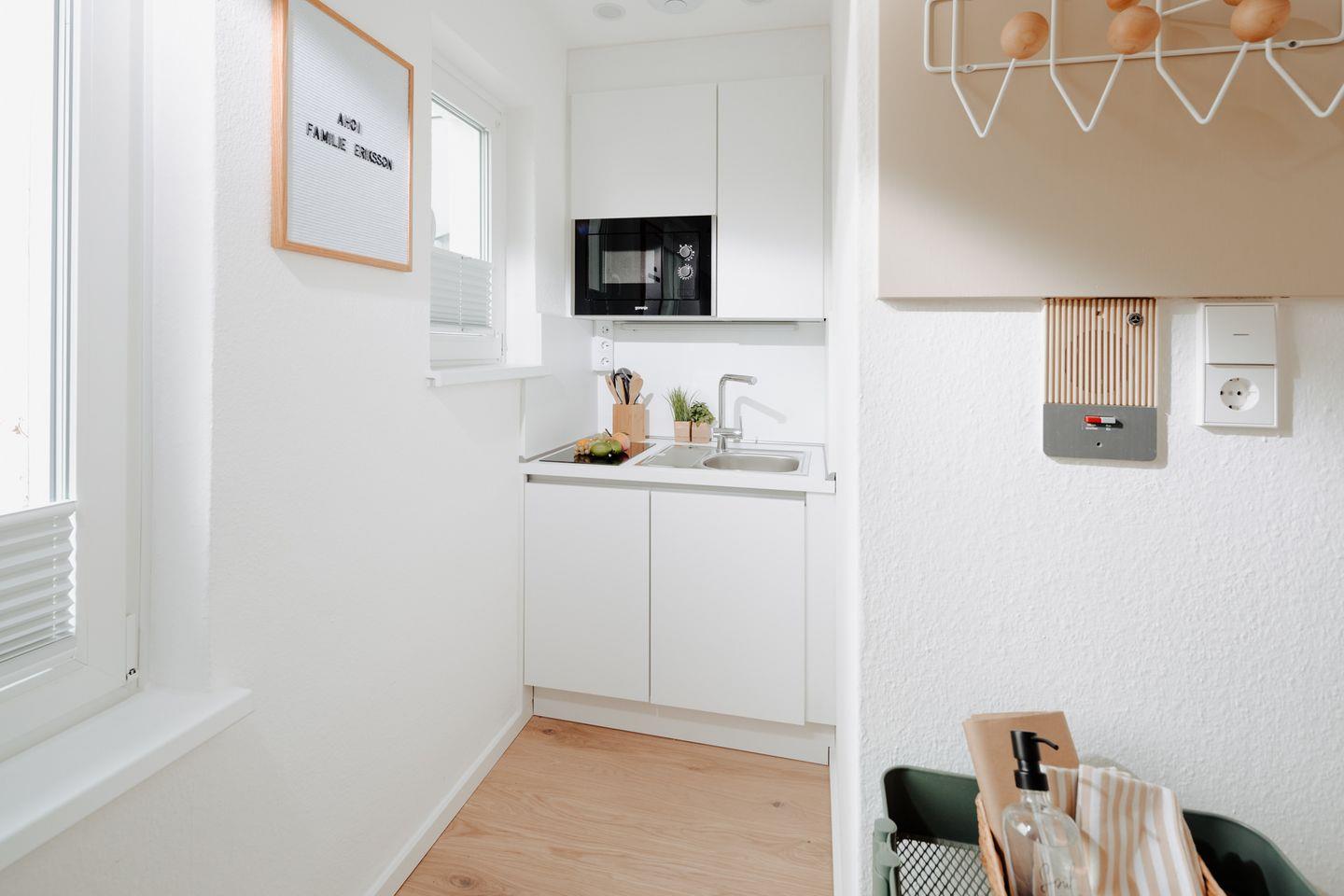 Die offene kleine Küche ist trotz des eingeschränkten Platzes bestens mit einem Kühlschrank, Gefrierfach, Mikrowelle, Ceranfeld (2 Kochfelder), Kaffeemaschine und einer Nespresso-Kapselmaschine ausgestattet, um Ihren Aufenthalt so angenehm wie möglich zu gestalten.