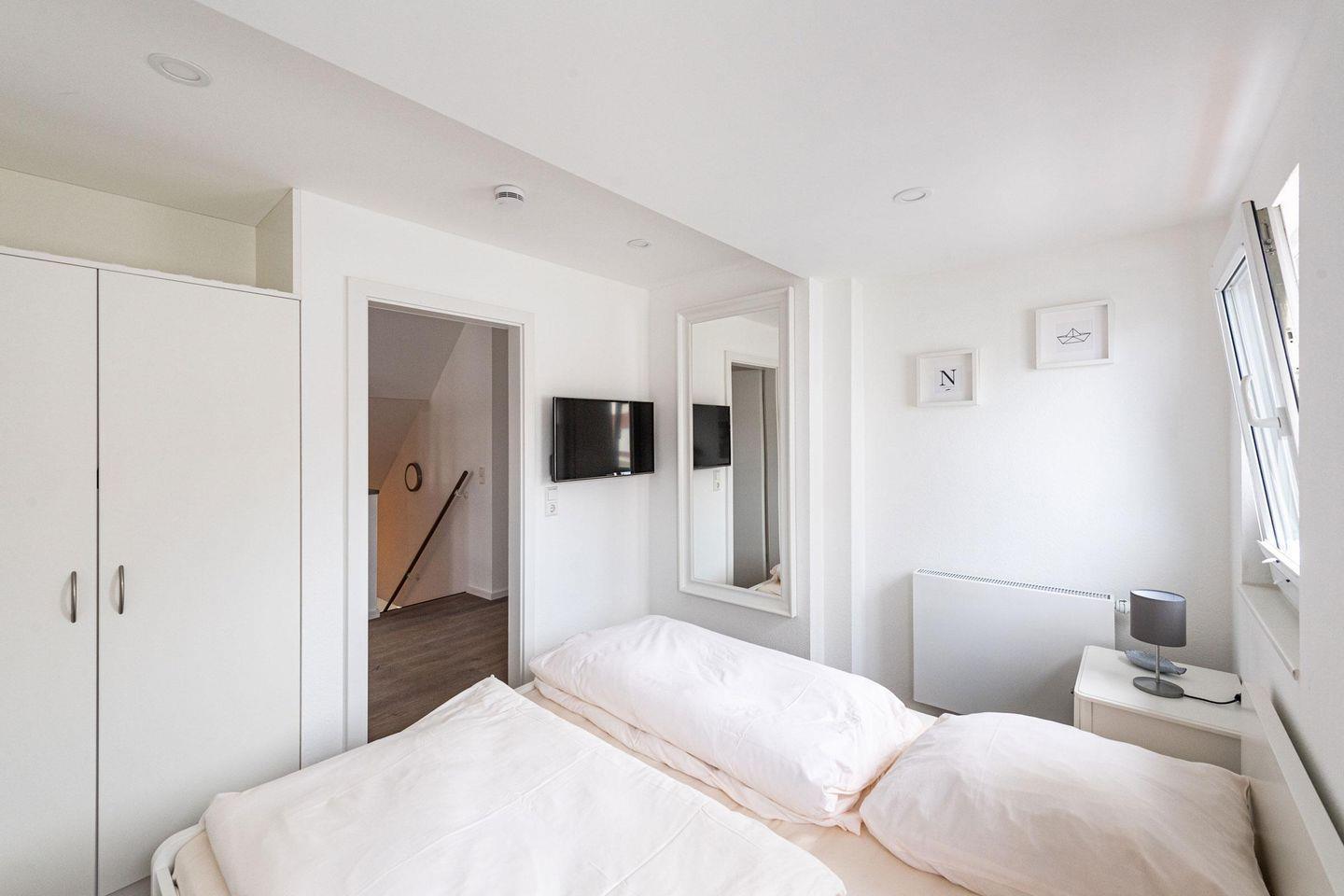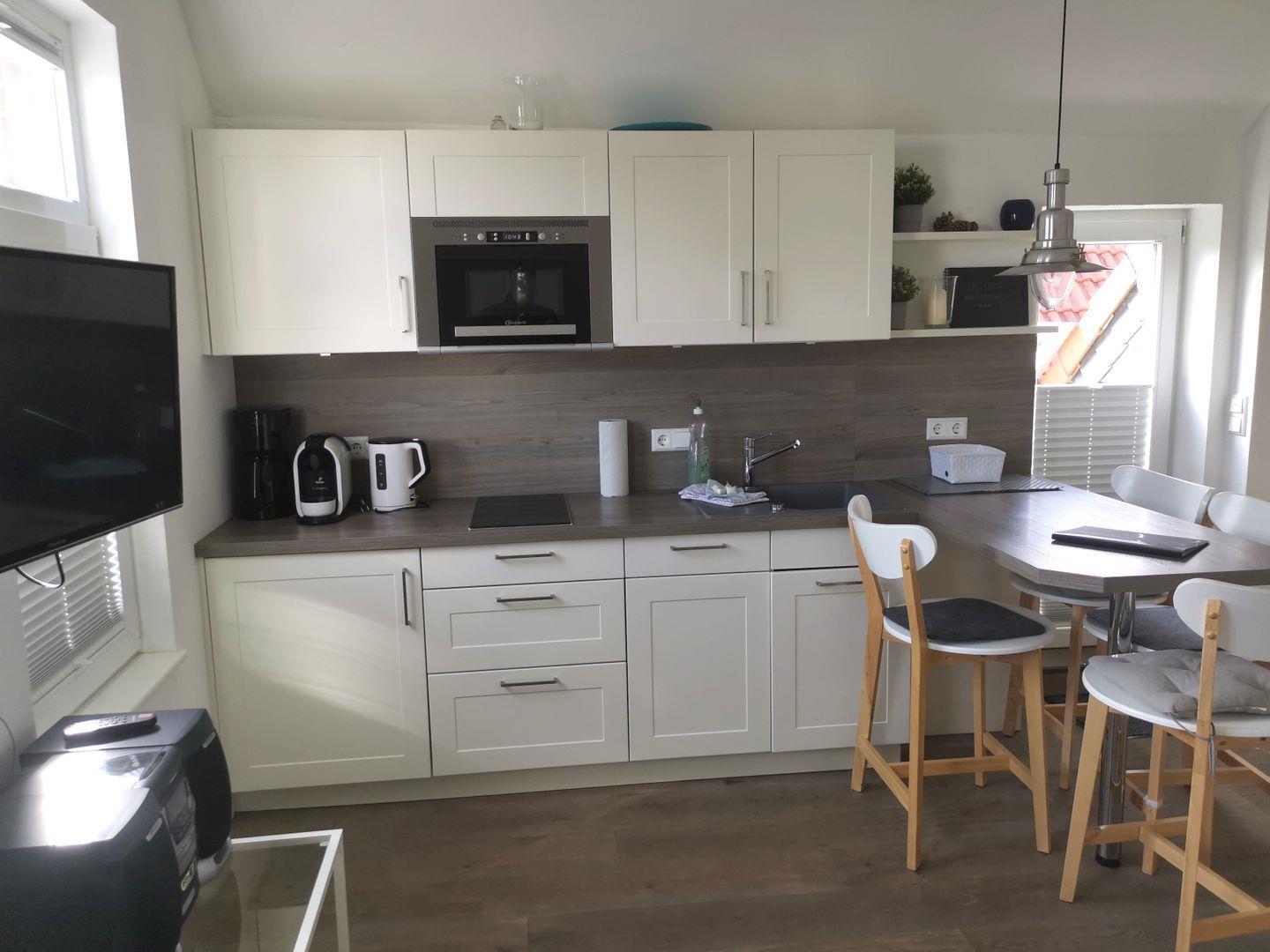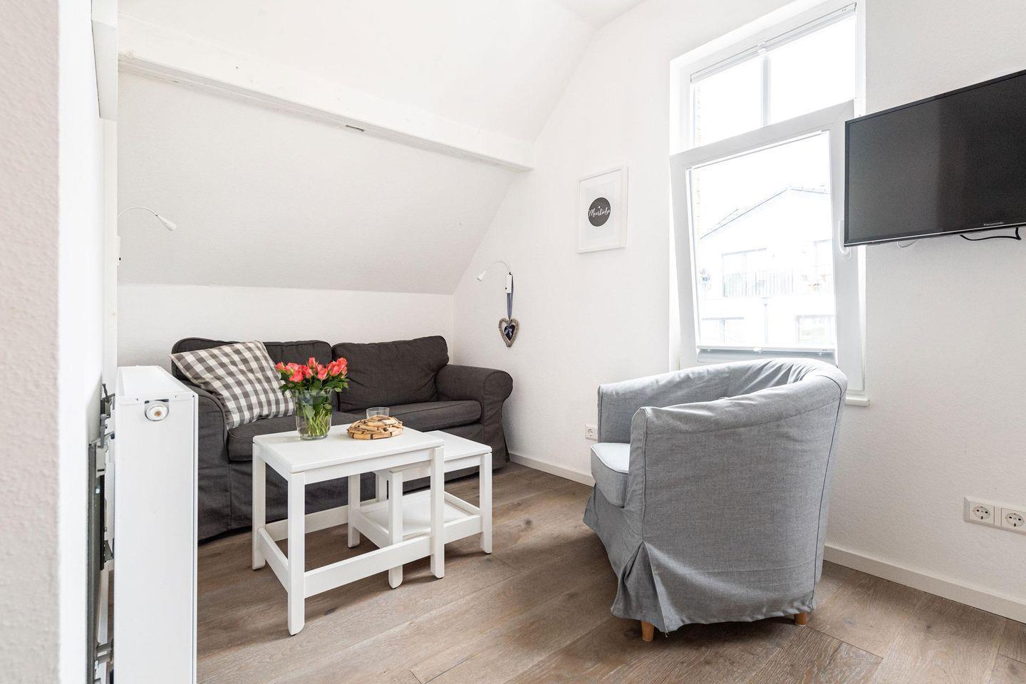 Diese helle, gemütliche Ferienwohnung unterm Dach bietet Platz für zwei bis drei Personen. Sie ist mit zwei separaten Schlafzimmern (jeweils mit TV) ausgestattet und verfügt über einen offenen Wohn-Essbereich mit Küchenzeile inkl. Spülmaschine, Esstisch, Sofa und TV. Ein freie WLAN-Anschluss steht ebenfalls zur Verfügung. Im kleinen Bad befinden sich Dusche und WC. Zugang zu einem kleinen Balkon. NICHTRAUCHERWOHNUNG!