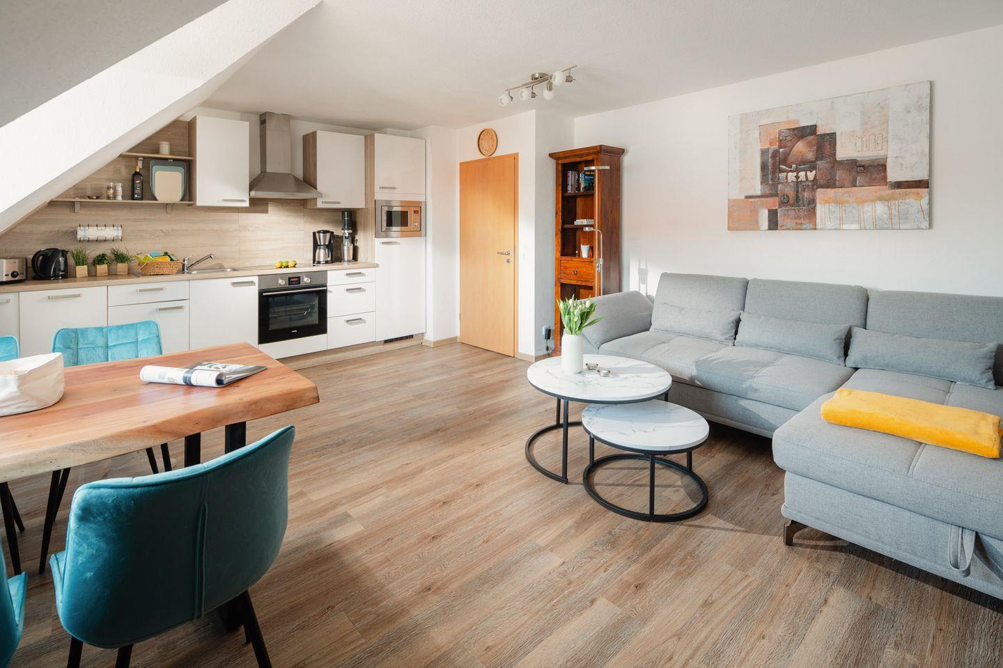 Der Wohn- und Essbereich ist sehr gemütlich eingerichtet. Die Küchenzeile beinhaltet alles, was Sie für Ihren Urlaub brauchen: Herd mit Backofen, Kaffeemaschine, Wasserkocher und eine Mikrowelle. Die Couch lässt sich sehr einfach in ein Schlafsofa (140x200cm) umfunktionieren und der Flachbildfernseher sorgt für Unterhaltung bei schlechtem Wetter.