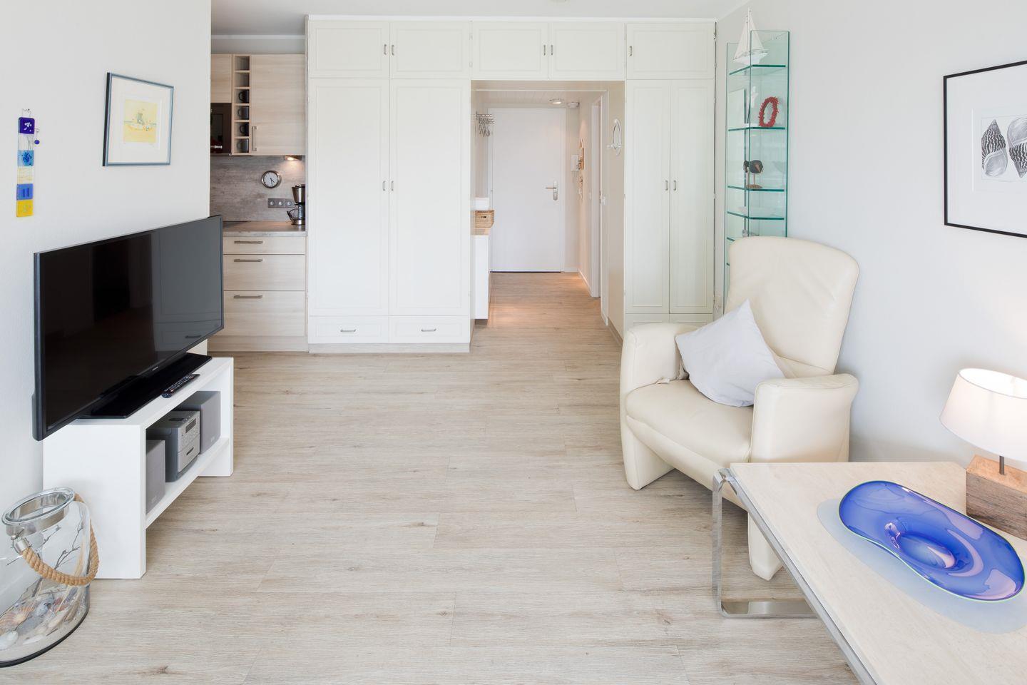 Schönen Küchenzeile mit Geschirrspülmaschine, Filterkaffeemaschine und Senseo-Pad-Maschine, helles freundliches Wohnzimmer mit zwei Sesseln und Schlafzimmer mit zwei Einzelbetten. Sonnenbalkon mit West-Ausrichtung und Meerblick. Die Wohnung liegt im 1. Stock wurde Ende 2018 renoviert und bietet in warmen Tönen ein gemütliches Ferienzuhause. Im Haus befindet sich ein Fahrstuhl.