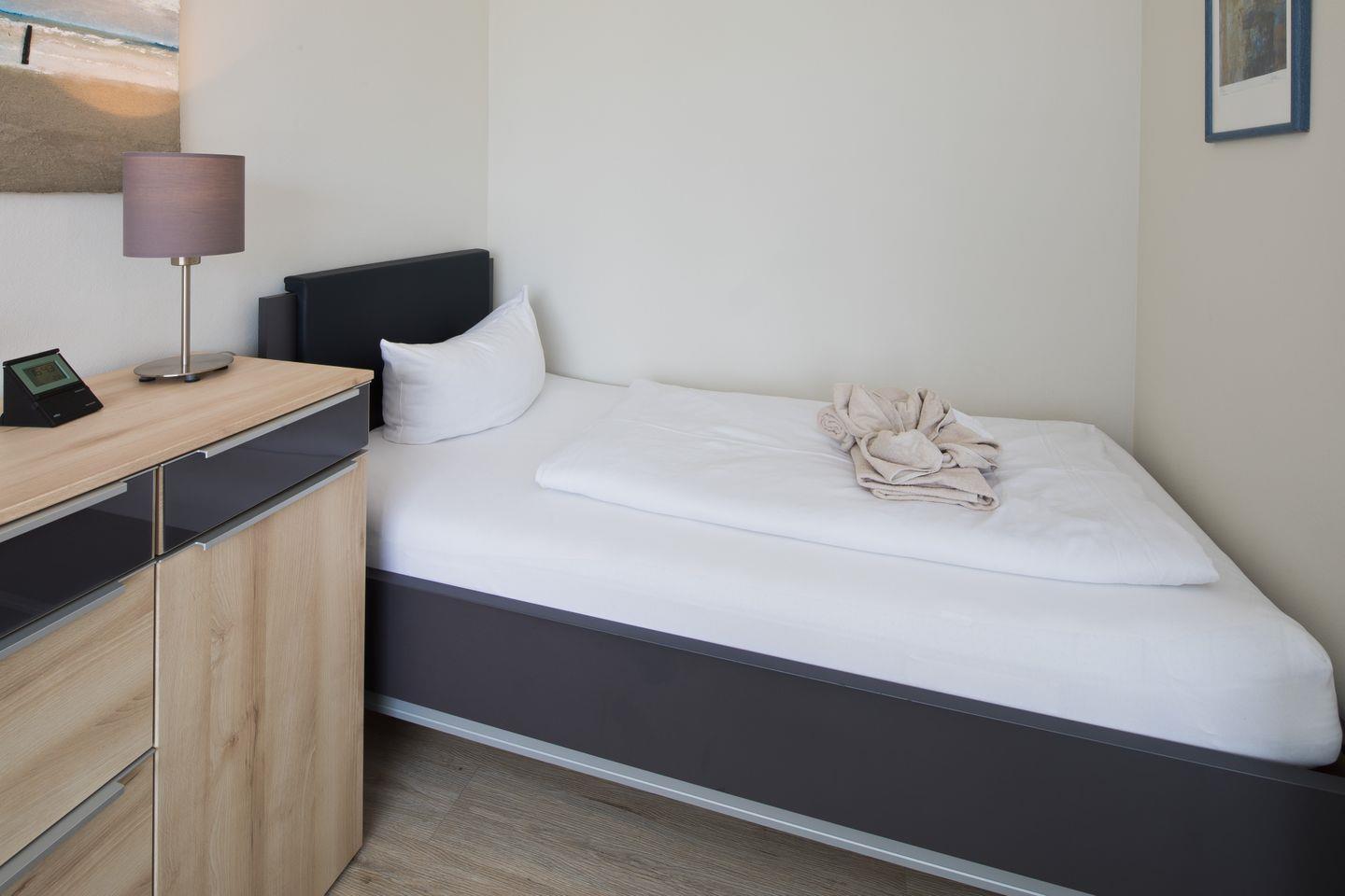 Das helle und freundliche Wohnzimmer ist mit zwei Sesseln ausgestattet und bietet einen angenehmen Rückzugsort. Das Schlafzimmer verfügt über zwei Einzelbetten, die für eine erholsame Nachtruhe sorgen.