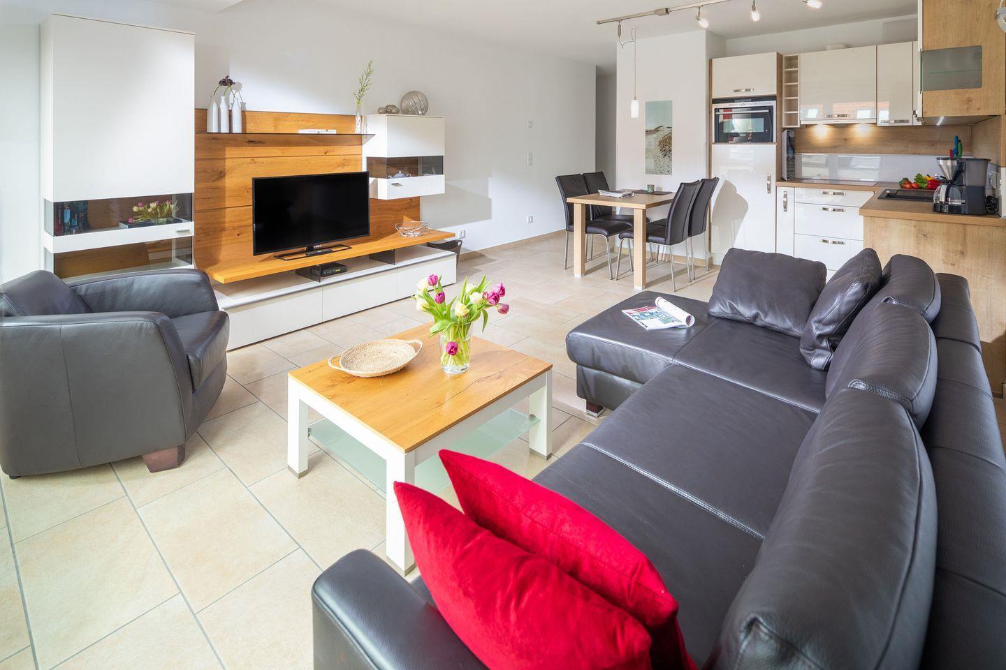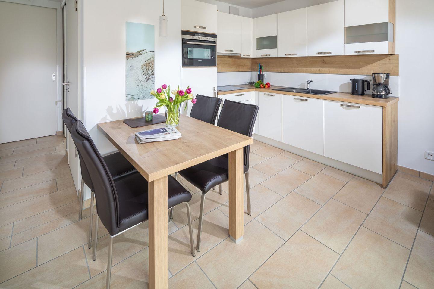 Die moderne Küche der Ferienwohnung lässt keine Wünsche offen. Sie ist komplett ausgestattet mit einem Ofen, Herd, Geschirrspüler und allen notwendigen Utensilien, um Ihren Aufenthalt so angenehm wie möglich zu gestalten. Genießen Sie gemeinsame Mahlzeiten in der großzügigen und stilvollen Küche.