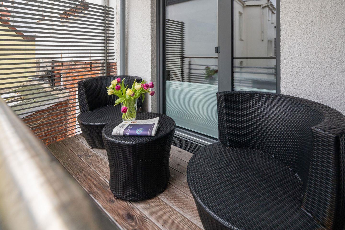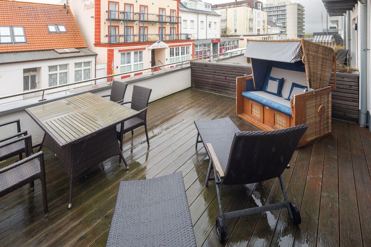 Die Dachterrasse der Ferienwohnung bietet einen atemberaubenden Blick auf die Nordsee und das lebhafte Treiben am Denkmal. Morgensonne auf dem Balkon vor dem Schlafzimmer rundet das perfekte Urlaubserlebnis ab. Die barrierefreie Lifterschließung macht die Wohnung auch für Gehbehinderte zugänglich.